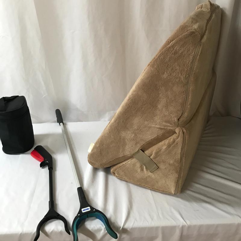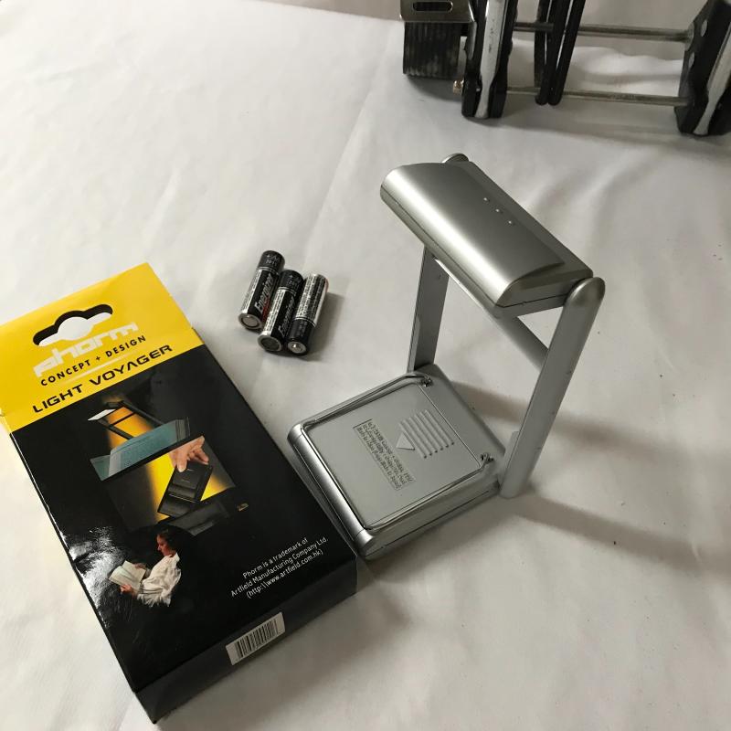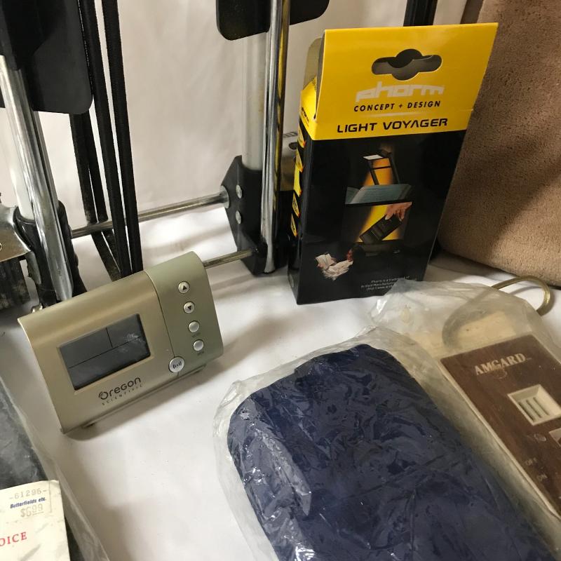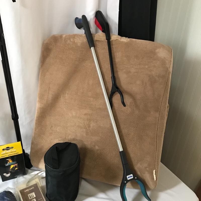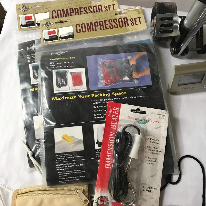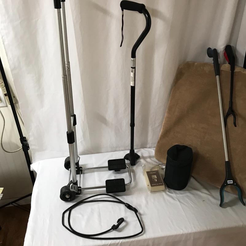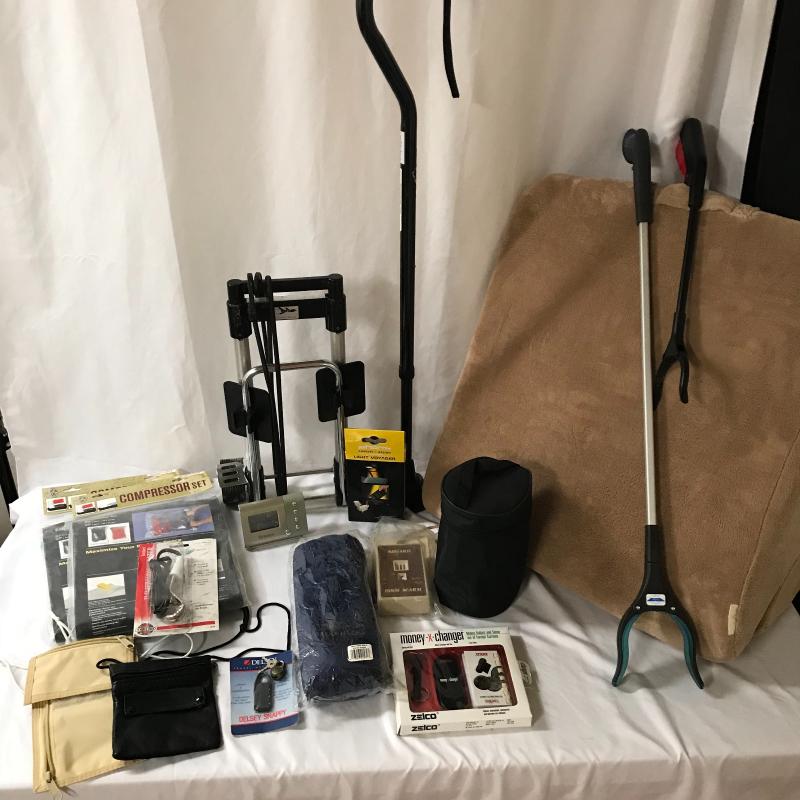 Lot includes Adjustable walking cane, two grabbers, Krups travel hot pot, folding book light, two passport wallets, travel alarm, compressor storage sets and luggage cart and more. This lot is available for shipping or local pick up in Asheville, NC.