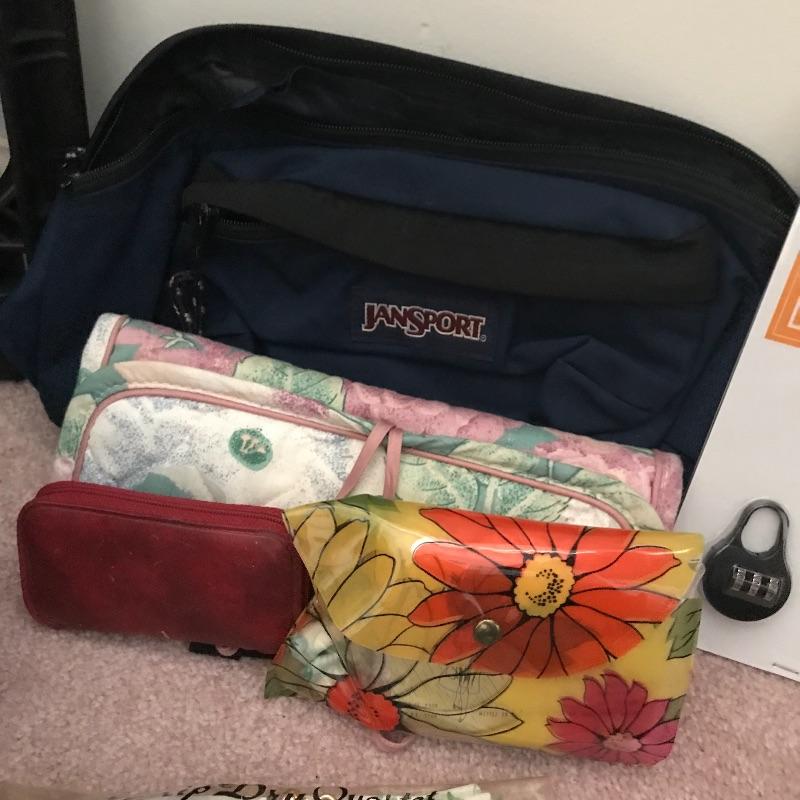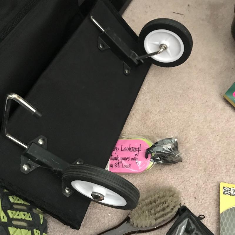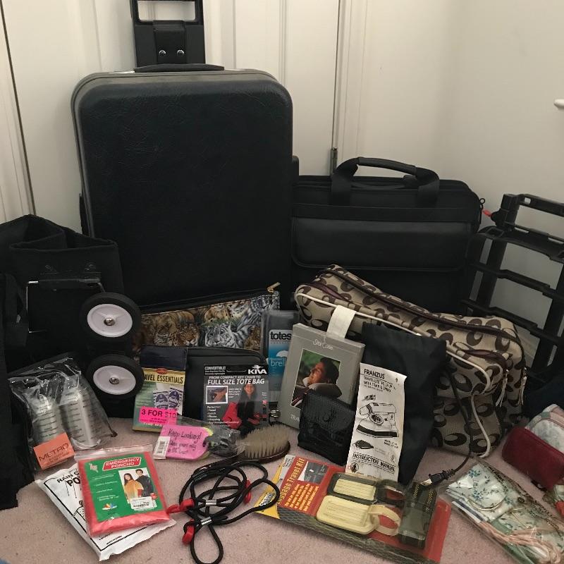 Lot includes a variety of travel essentials including hard cover and soft luggage, rain panchos, a travel umbrella, a travel iron, international plugs, toiletry and vanity bags, lint brush, luggage labels, and much more. See pics. Local pickup only.