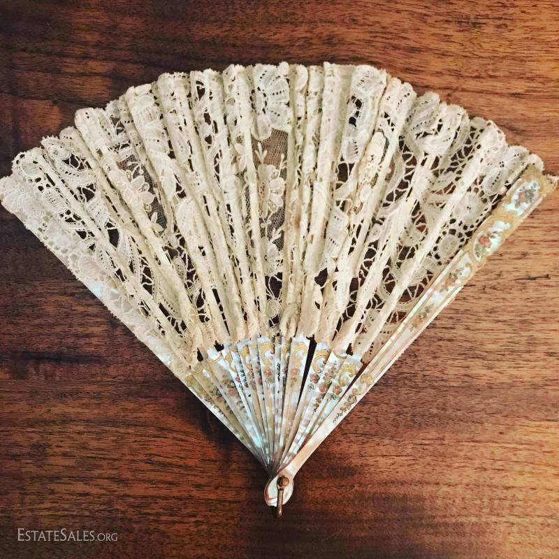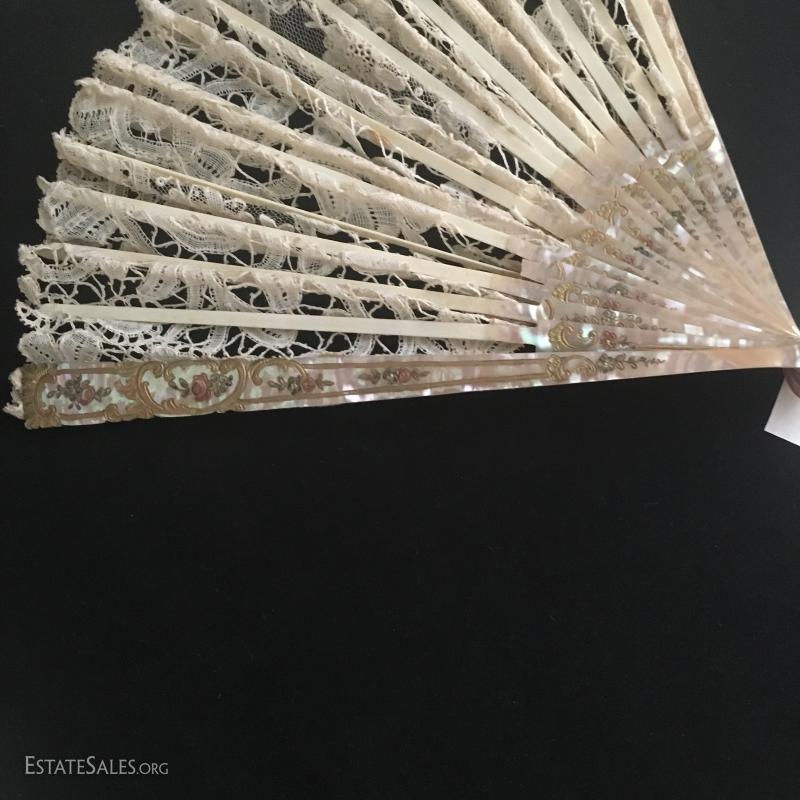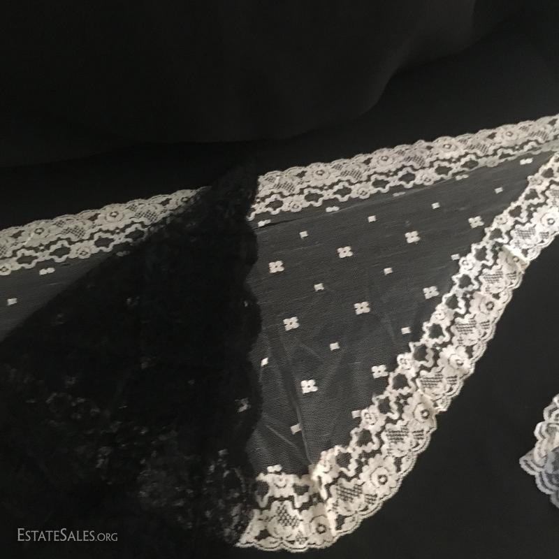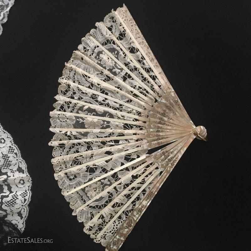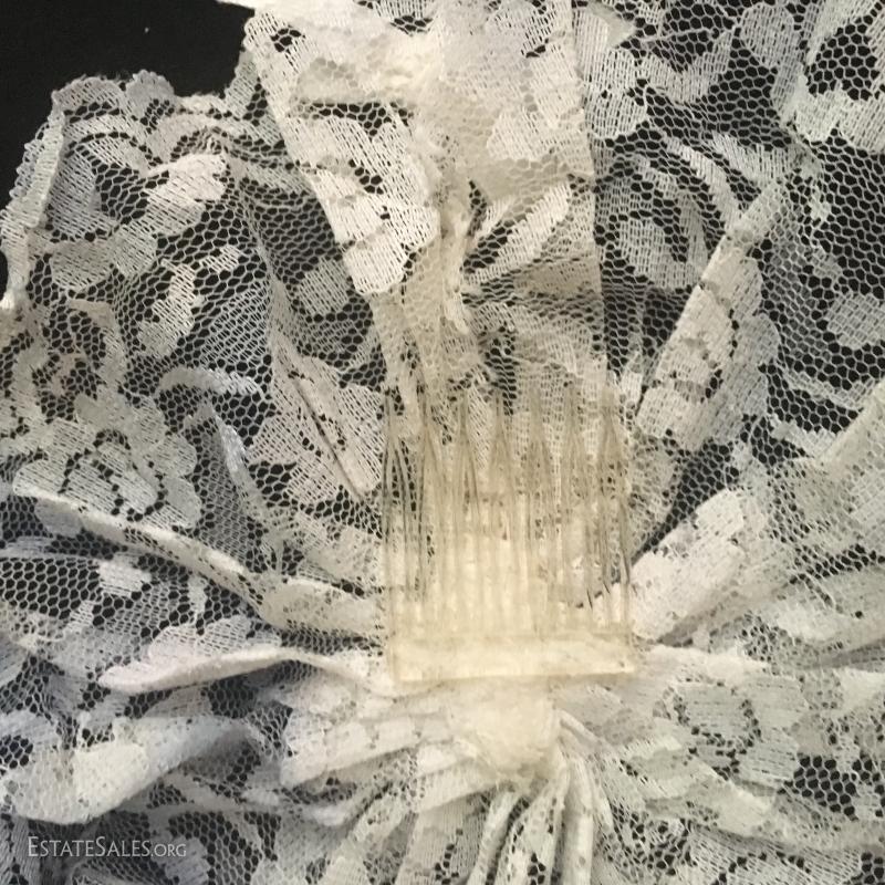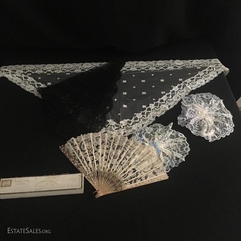 Lace shawls, hair combs and fan. Includes gorgeous vintage fan with mother of pearl handle. White shawl is ripped in a couple of spots, see photos. This lot is available for shipping and local pick up in Asheville, NC.