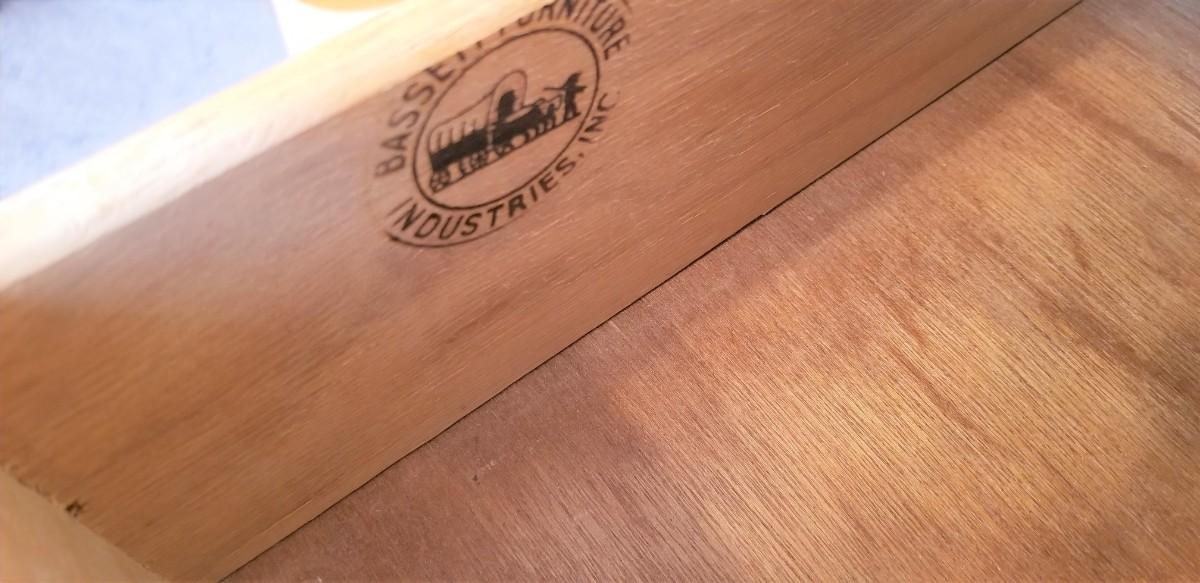 Classic vintage French Provincial Style Dresser with Mirror by Bassett Furniture Co. 42" across, 3 drawers, 29.5" tall, 16" deep. The mirror is 44" tall and 26" across. Good vintage condition.
