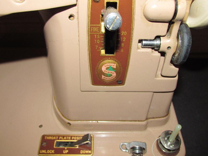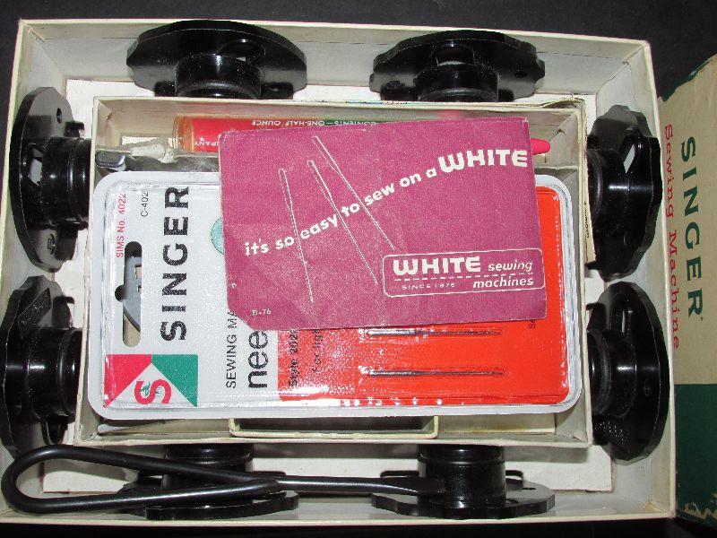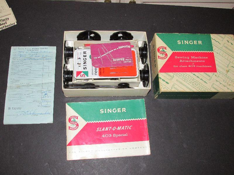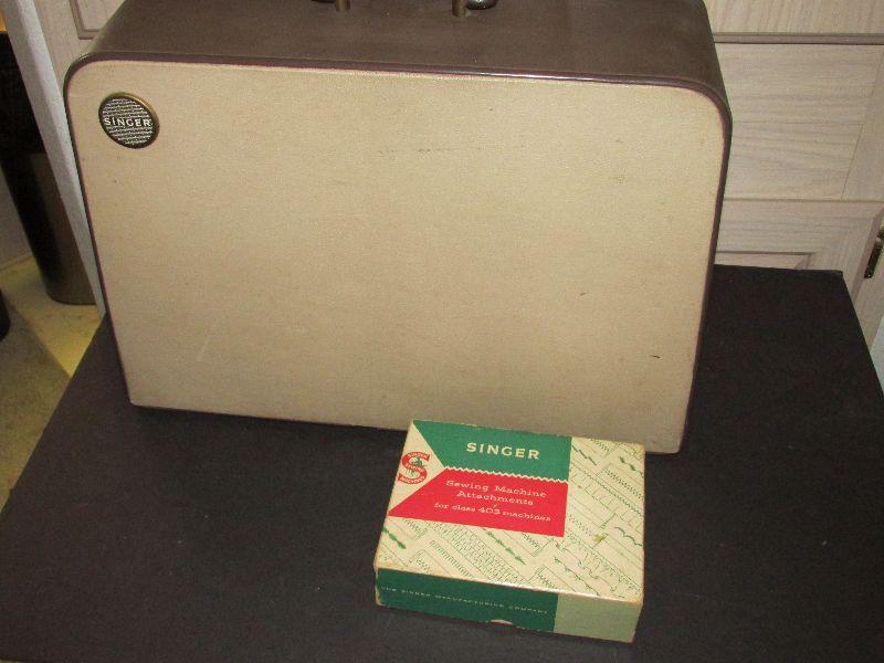 Vintage Singer 403a sewing machine with box carrying case and box of sewing machine attachments. Serial #NB624739. Produced in the late 1950s. Sewing machine in good condition. Tested. Outer shell box carrying case has some damage, shown in photo.