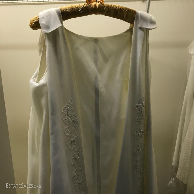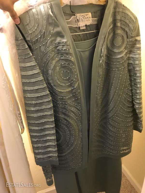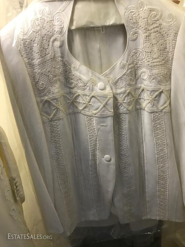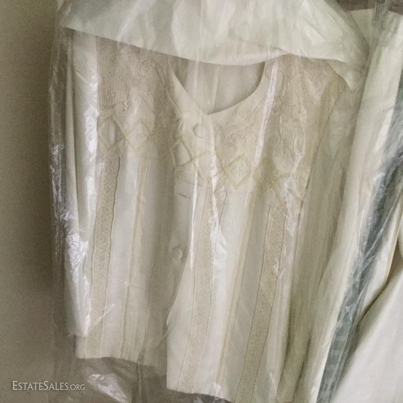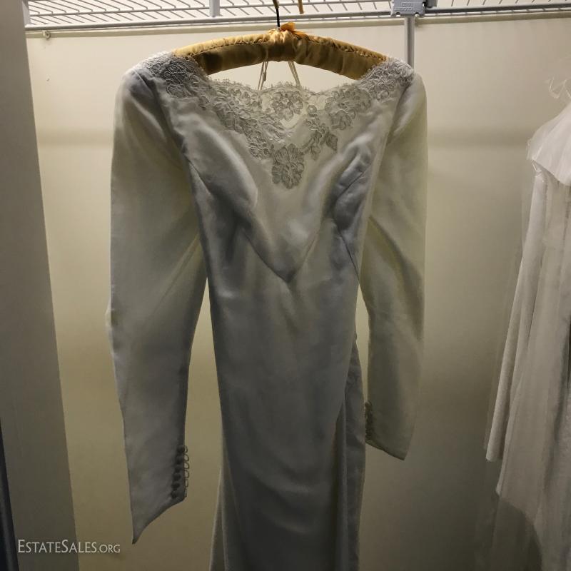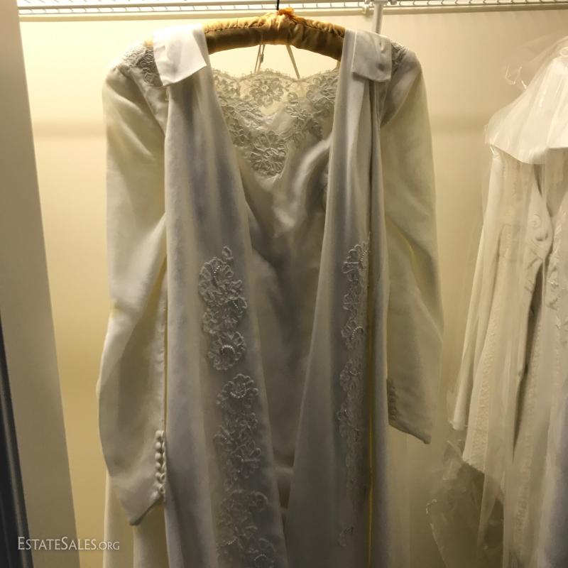Beautiful long-sleeve wedding dress with matching long vest/jacket and veil. No size marked but measures 15" at waist on outside of dress. Slight discoloring due to age. Satin with Taffeta overlay and lace detail. Lot also includes two formal "mother of the bride" dress suits, each size 14.