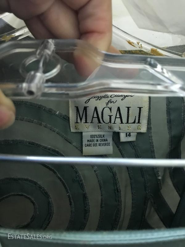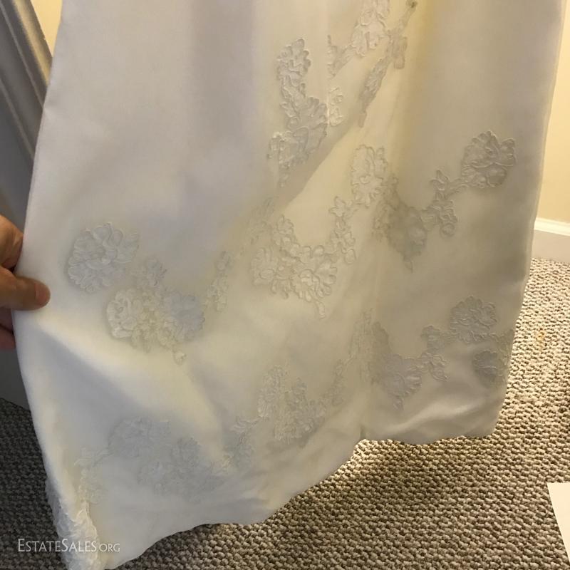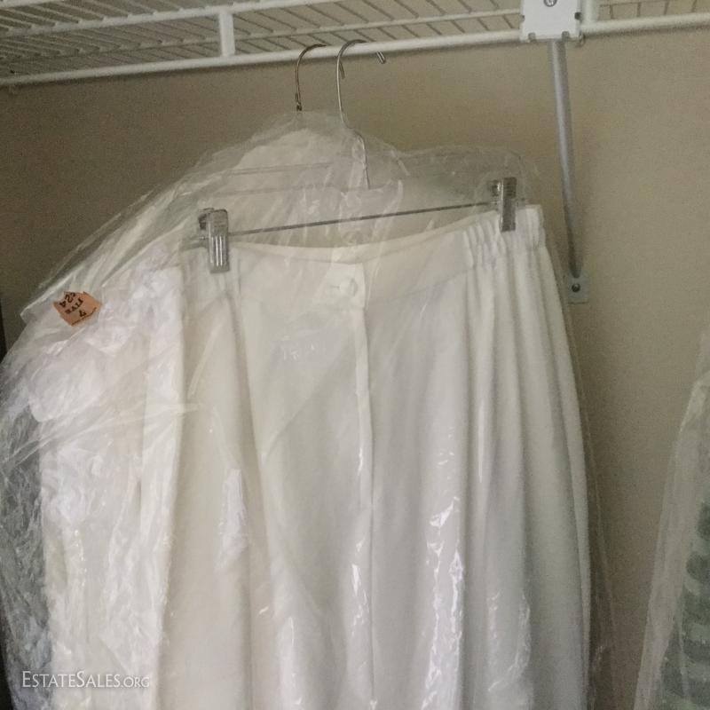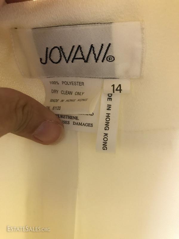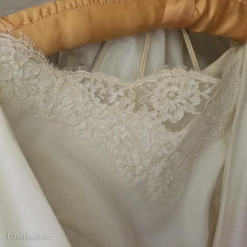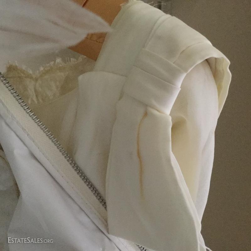 Beautiful long-sleeve wedding dress with matching long vest/jacket and veil. No size marked but measures 15" at waist on outside of dress. Slight discoloring due to age. Satin with Taffeta overlay and lace detail. Lot also includes two formal "mother of the bride" dress suits, each size 14.