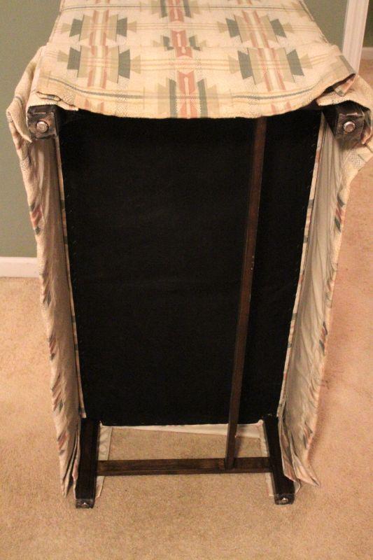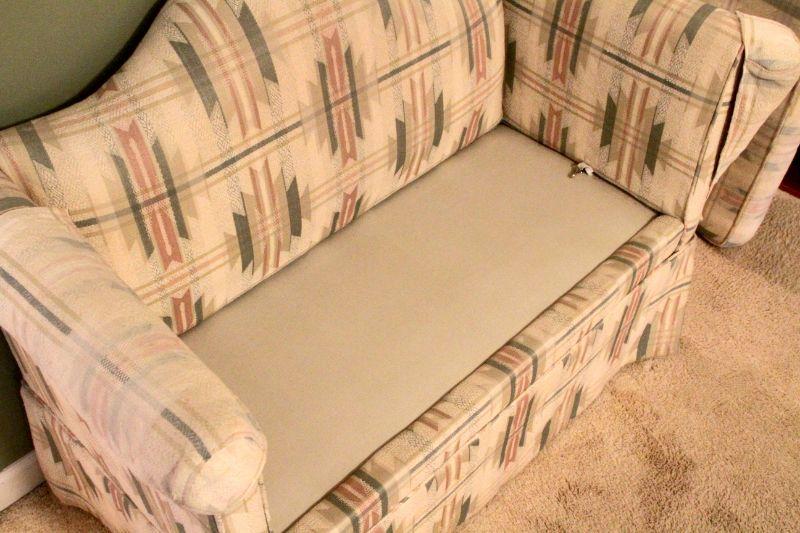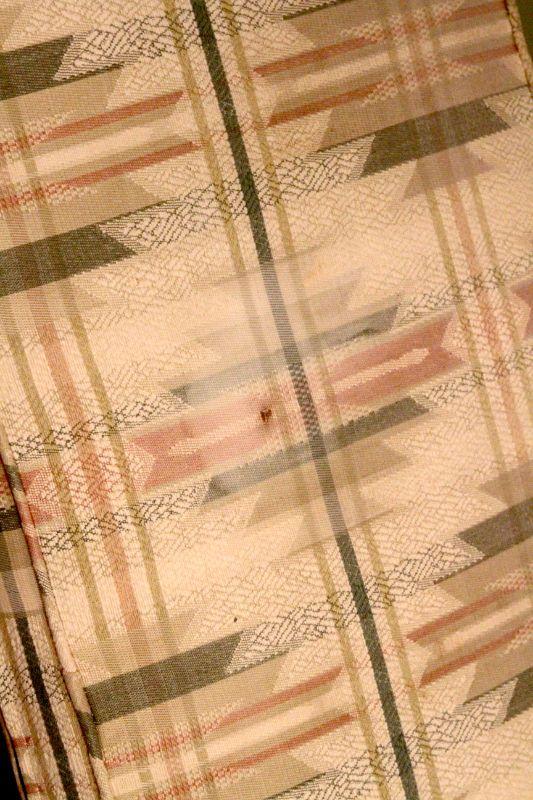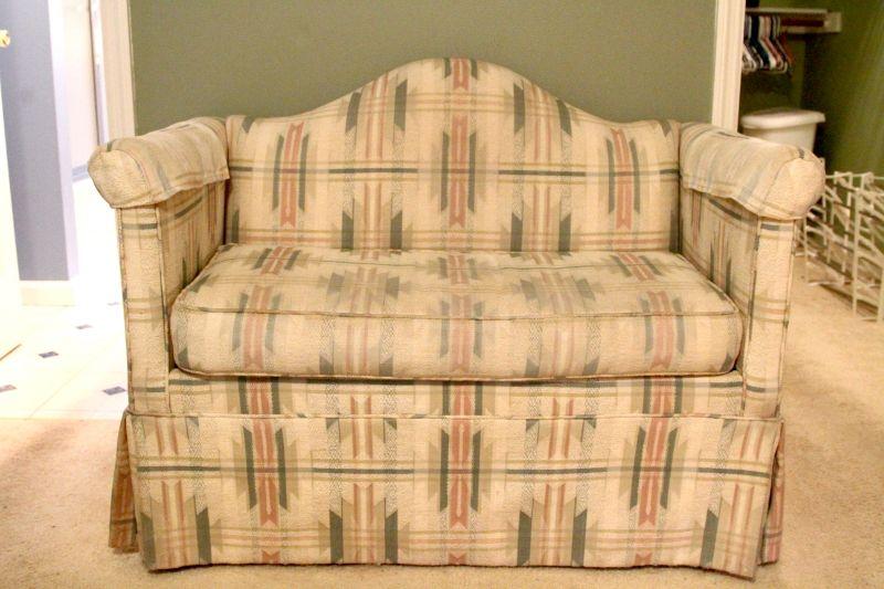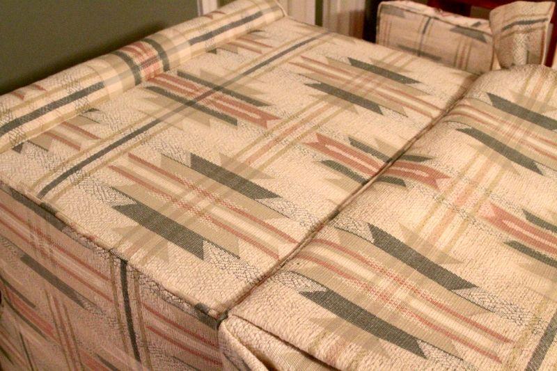 Off white, dusty pink and olive green loveseat with worn arm covers. Dimensions 46" w x 24" d x 34" h. One side of seat pad is getting thread bare and is faded from attempt to removed a small stain that appears to be ink. Octagonal matching green wooden wall clock. No rips or snags in fabric. Cotton blend fabric with Native American design.