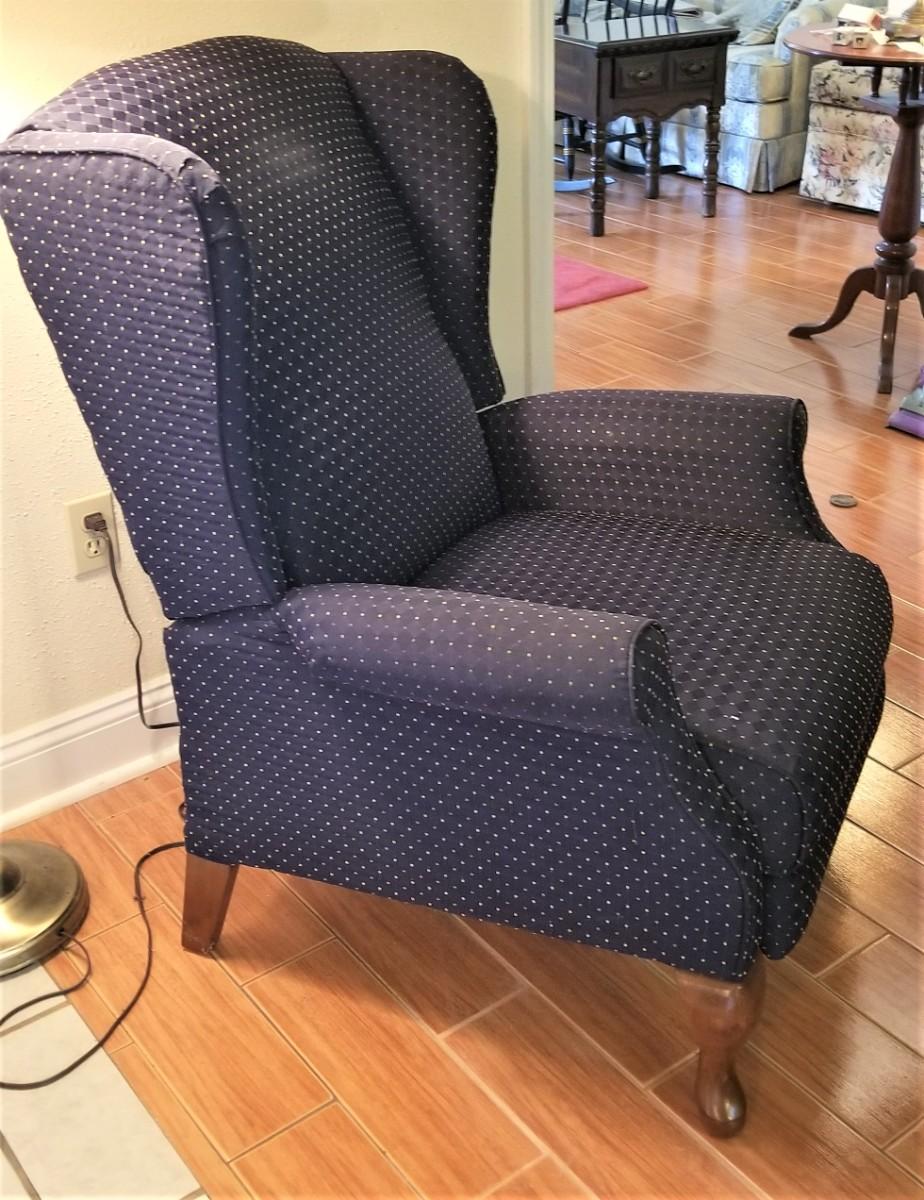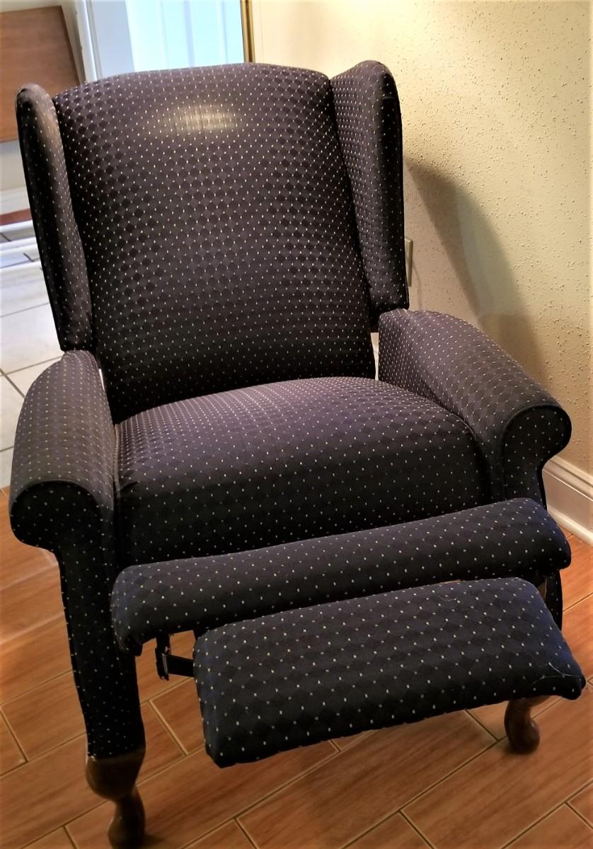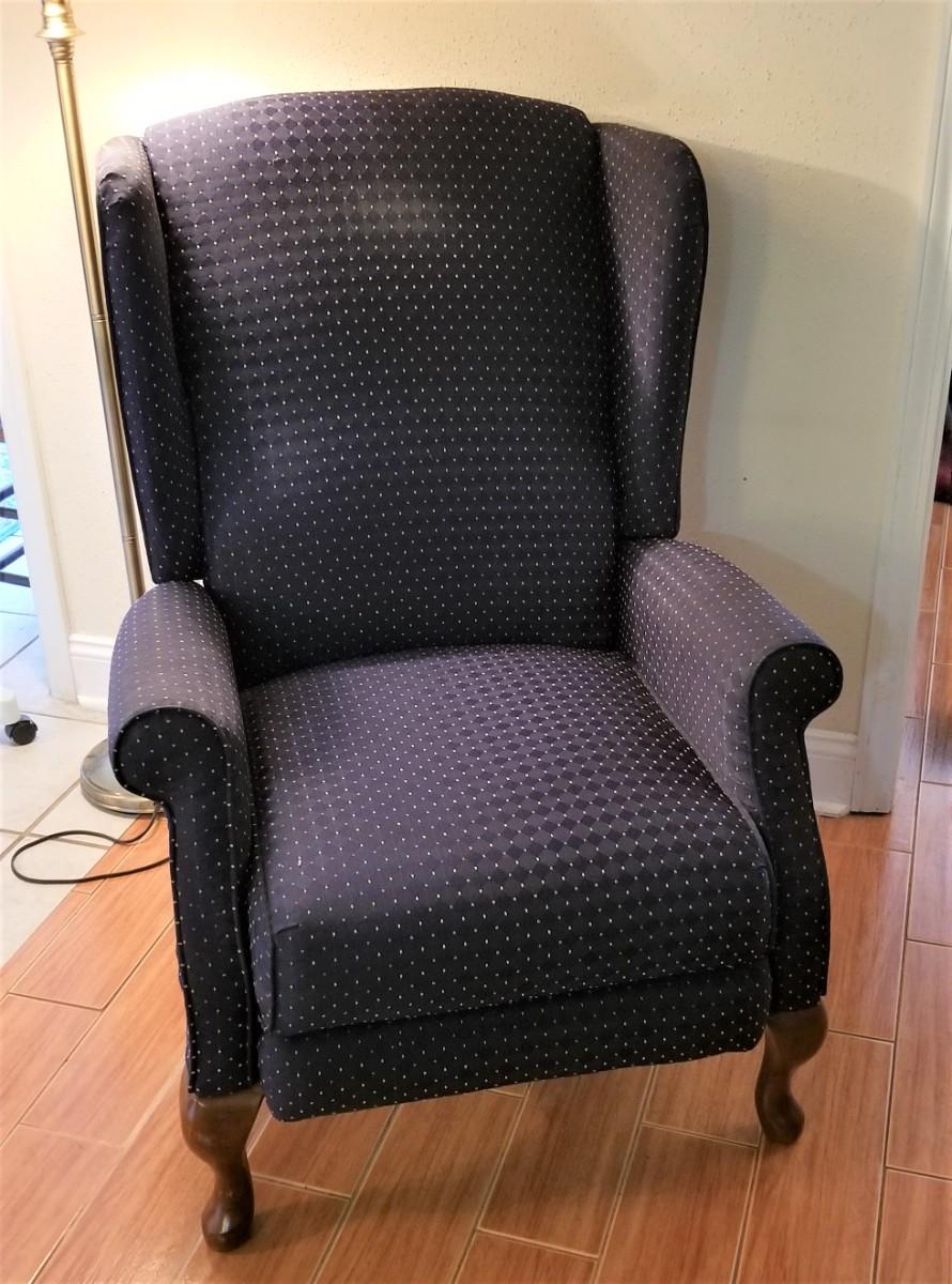 Nice comfy Wing back Lazy Boy Recliner - navy with tiny polka dots - Nonsmoking home. Reclines all the way back. 29.5" across, 35" deep, 41" tall - Clean.