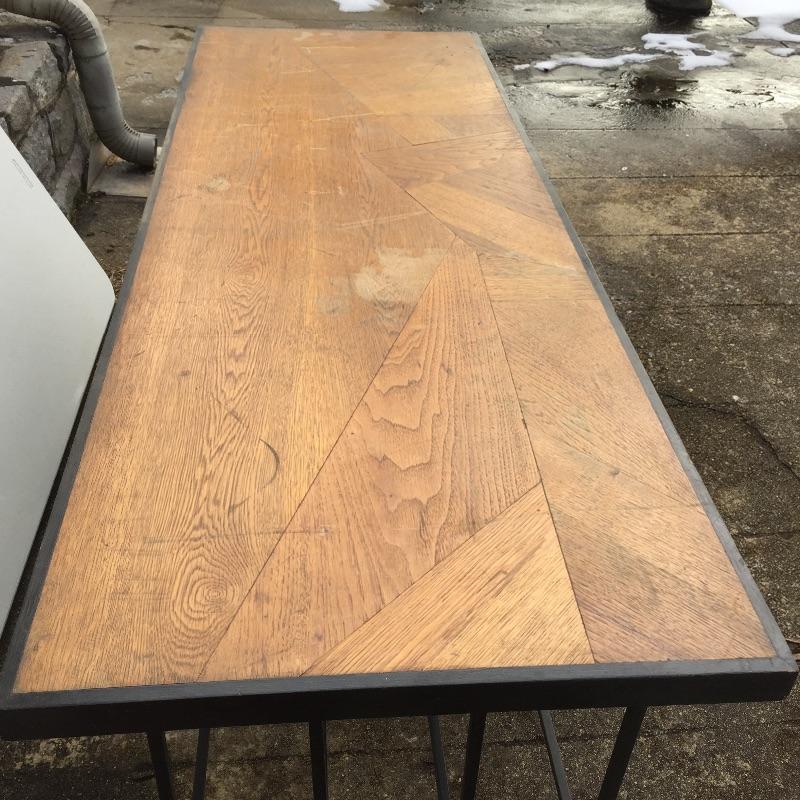 Solid wood and iron table. Use as a desk, kitchen table, sofa table...the possibilities are endless. Top needs a little refinishing and is not attached. Table measures 34.5” x 68” x 28.75”. Local pickup only and bring help because item is heavy!