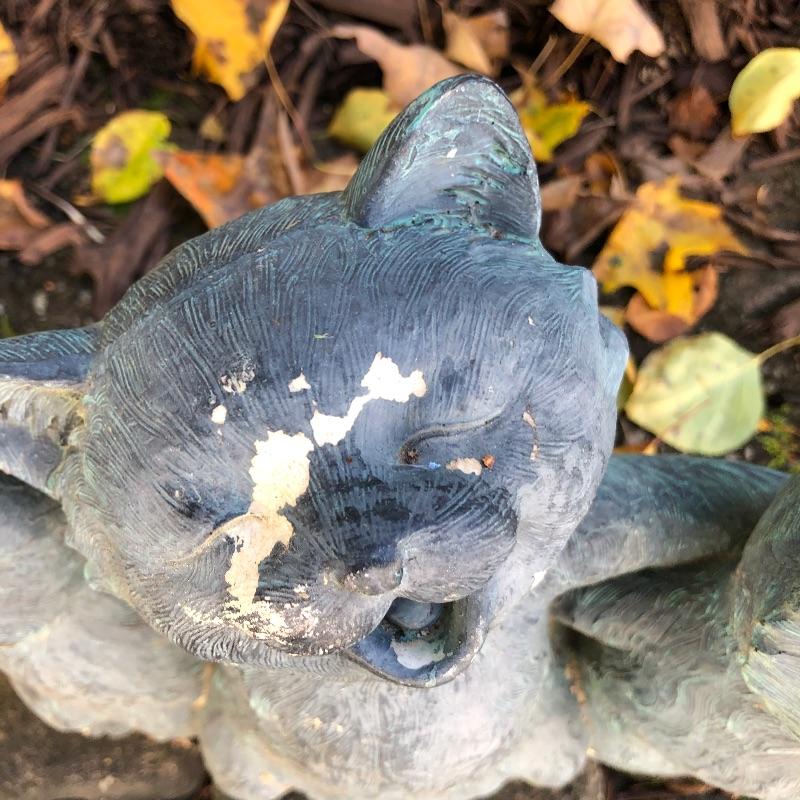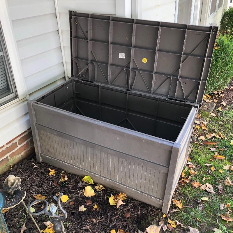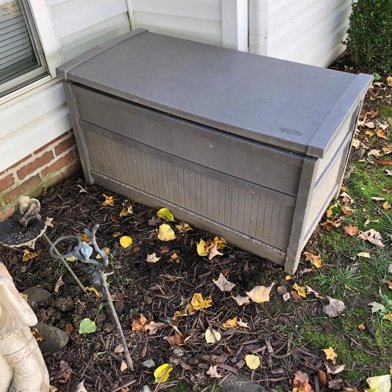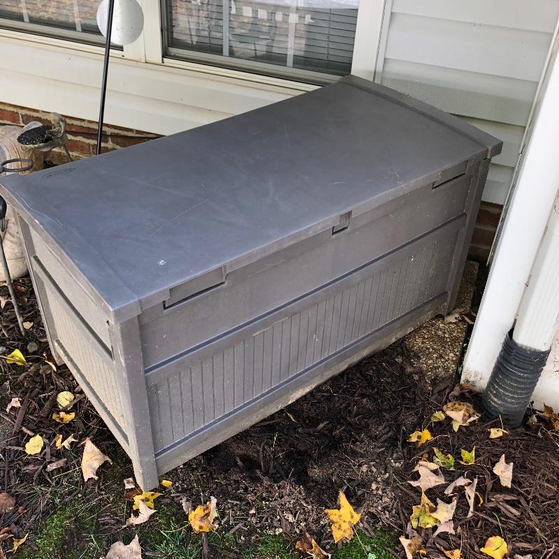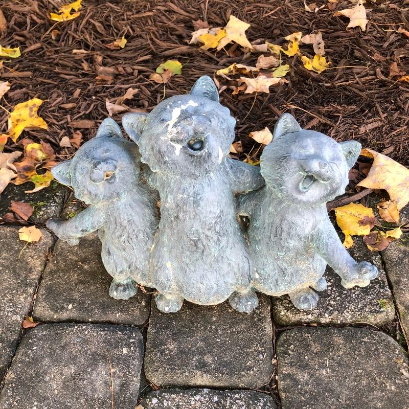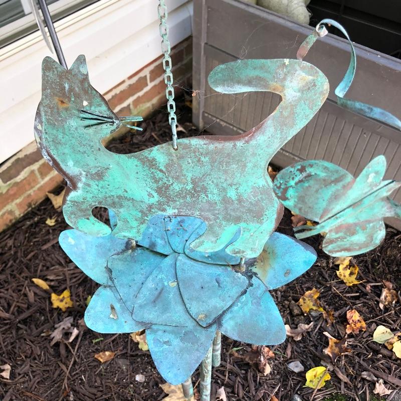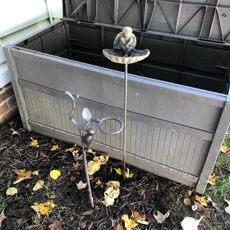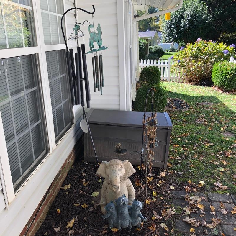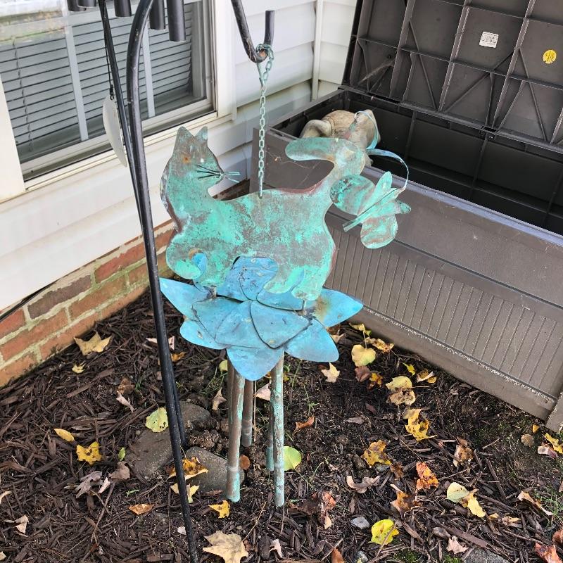 A nice assortment of yard art and a handy Suncast plastic outdoor storage box in this lot. Two wind chimes, a Squirrel proof bird feeder, 2 decorative stakes and two hooks along with two yard statues make up this lot. As you will see in the images, the paint on the cat statue has worn off in places.