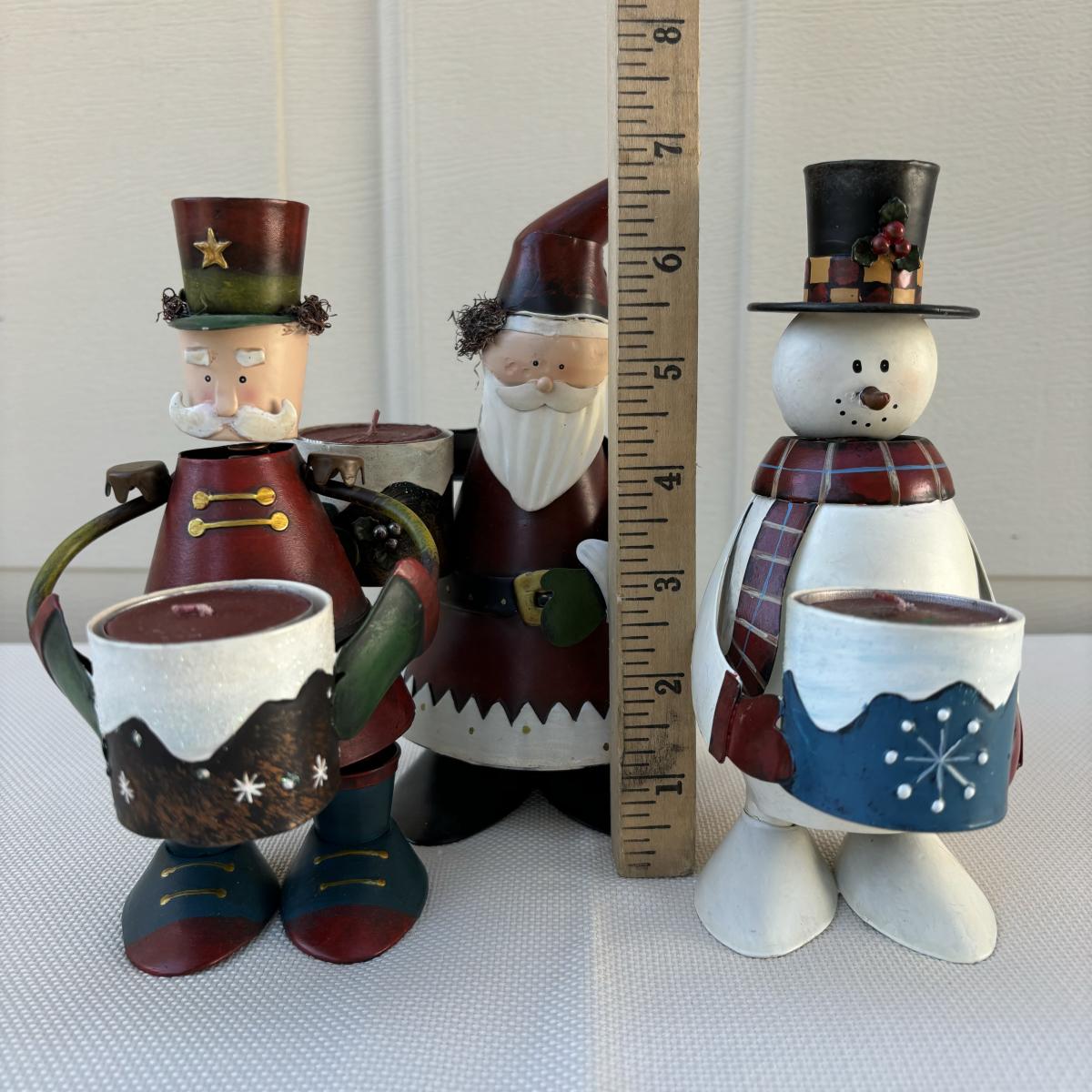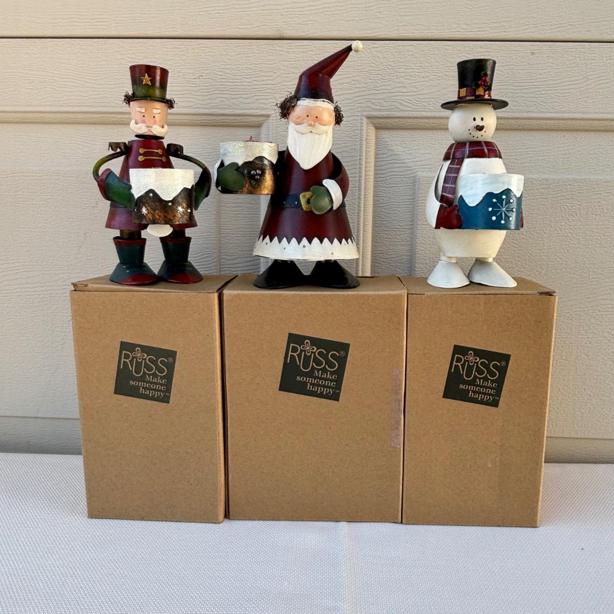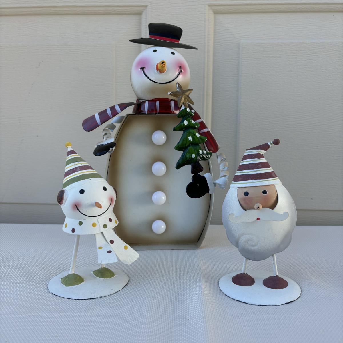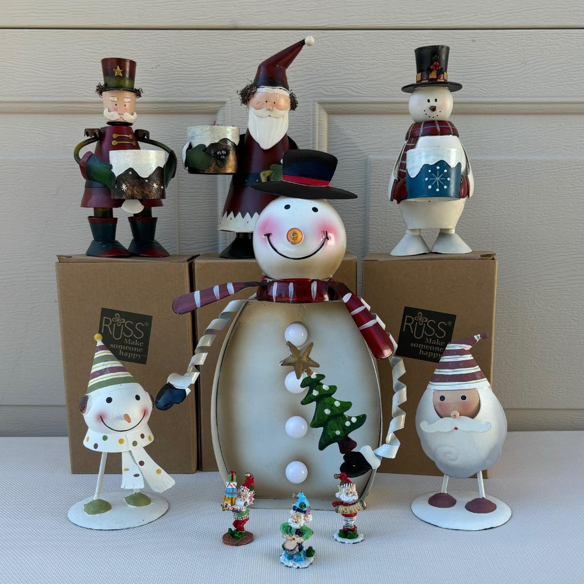 LOT 2: Holiday Decor: Russ Votive Candle Metal Candle Holders, Bobbly Santa & Elf, Light Up Metal Snowman along with 3 Vintage Enesco North Pole Village Pewter Christmas Figurines -1989 Zimnicki