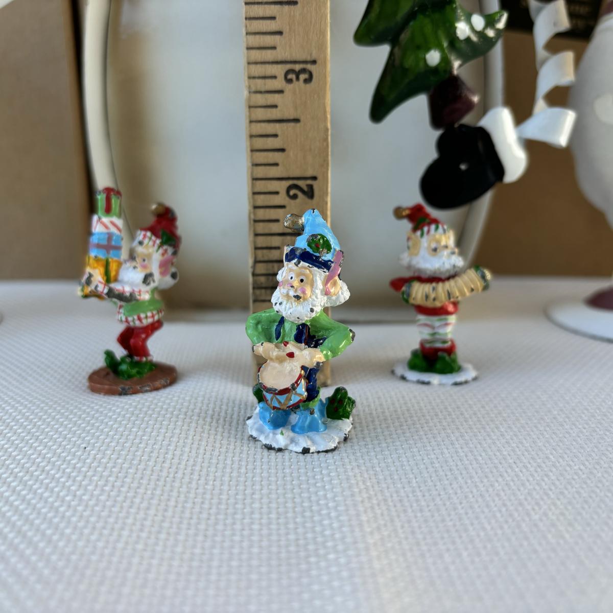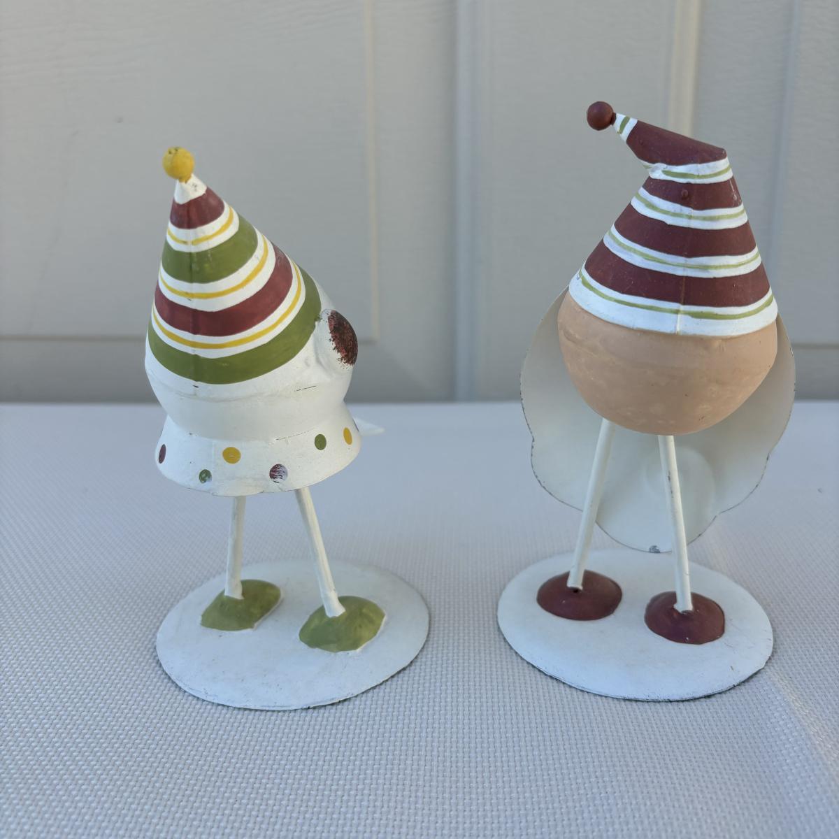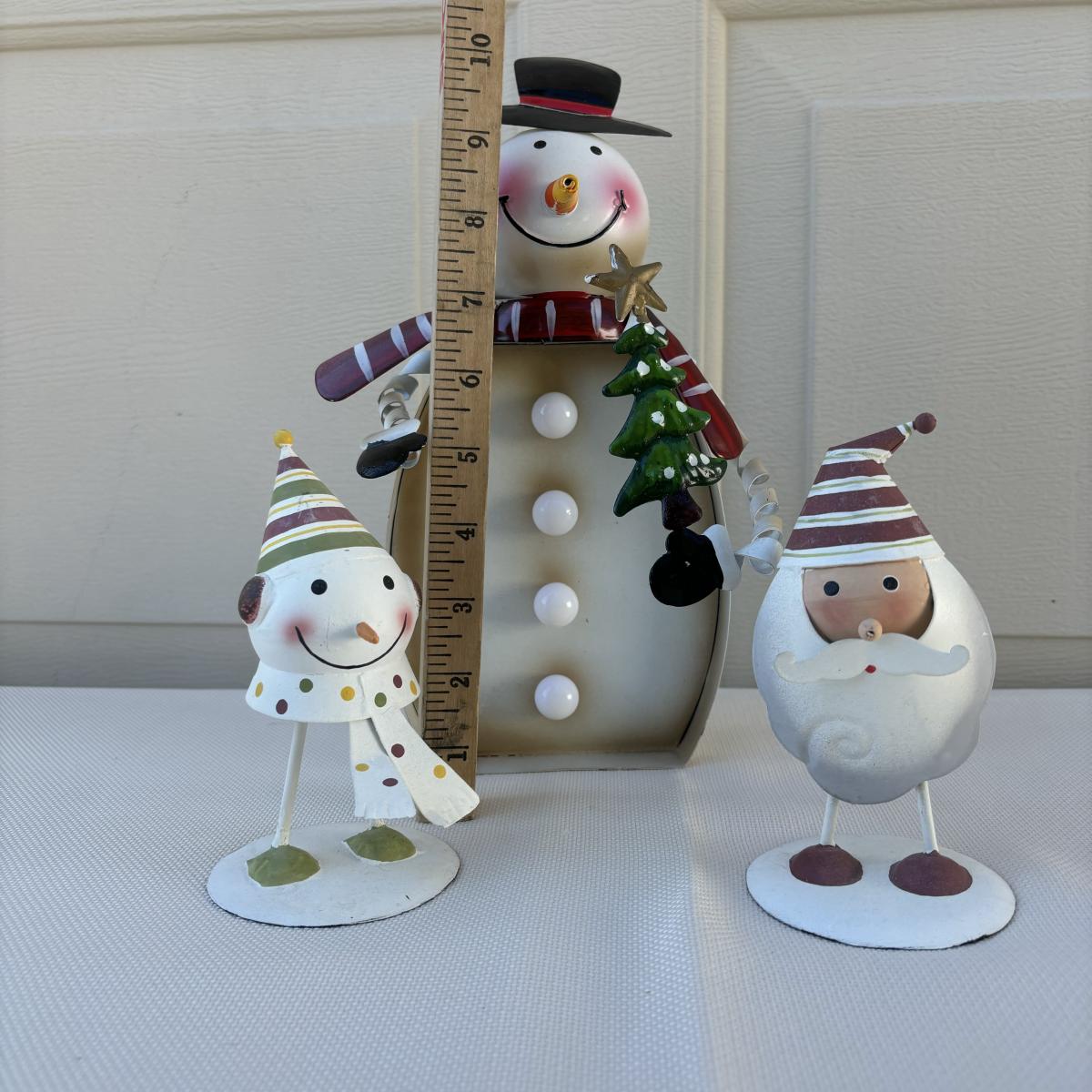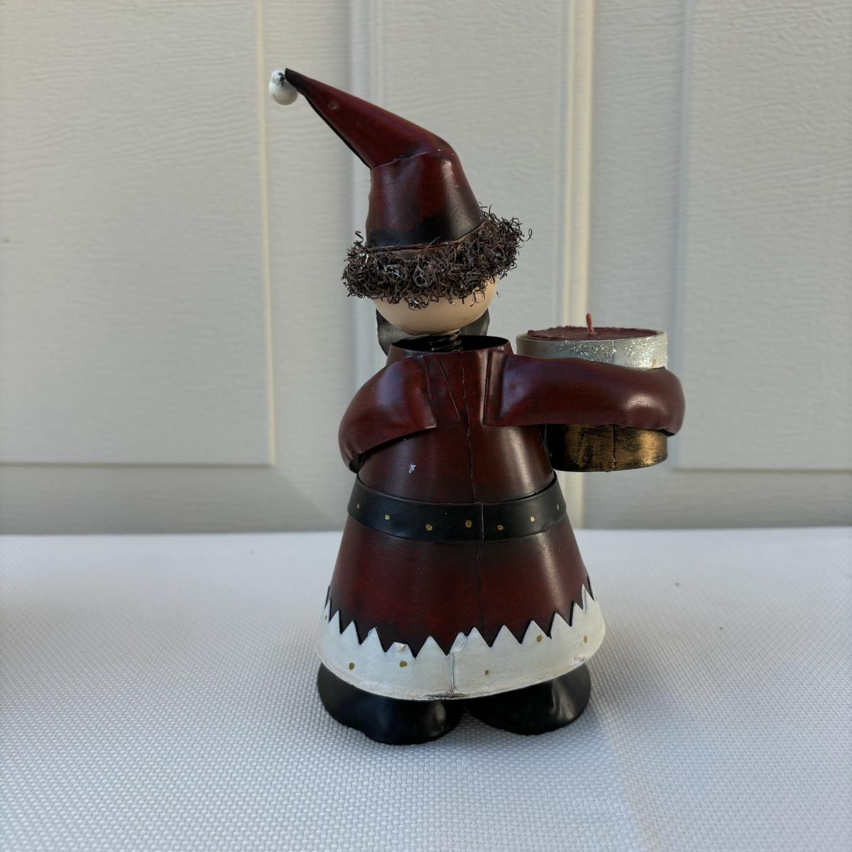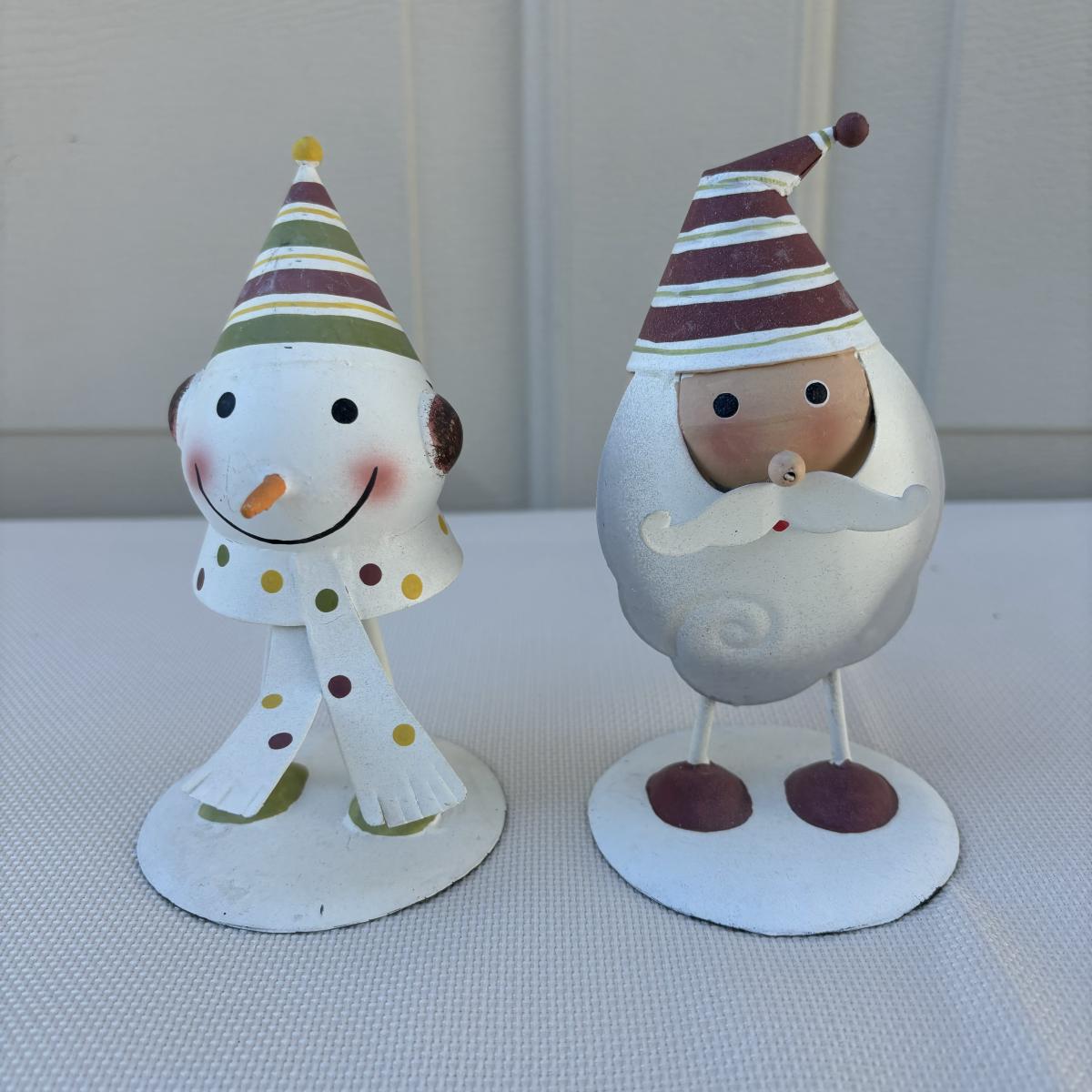 LOT 2: Holiday Decor: Russ Votive Candle Metal Candle Holders, Bobbly Santa & Elf, Light Up Metal Snowman along with 3 Vintage Enesco North Pole Village Pewter Christmas Figurines -1989 Zimnicki