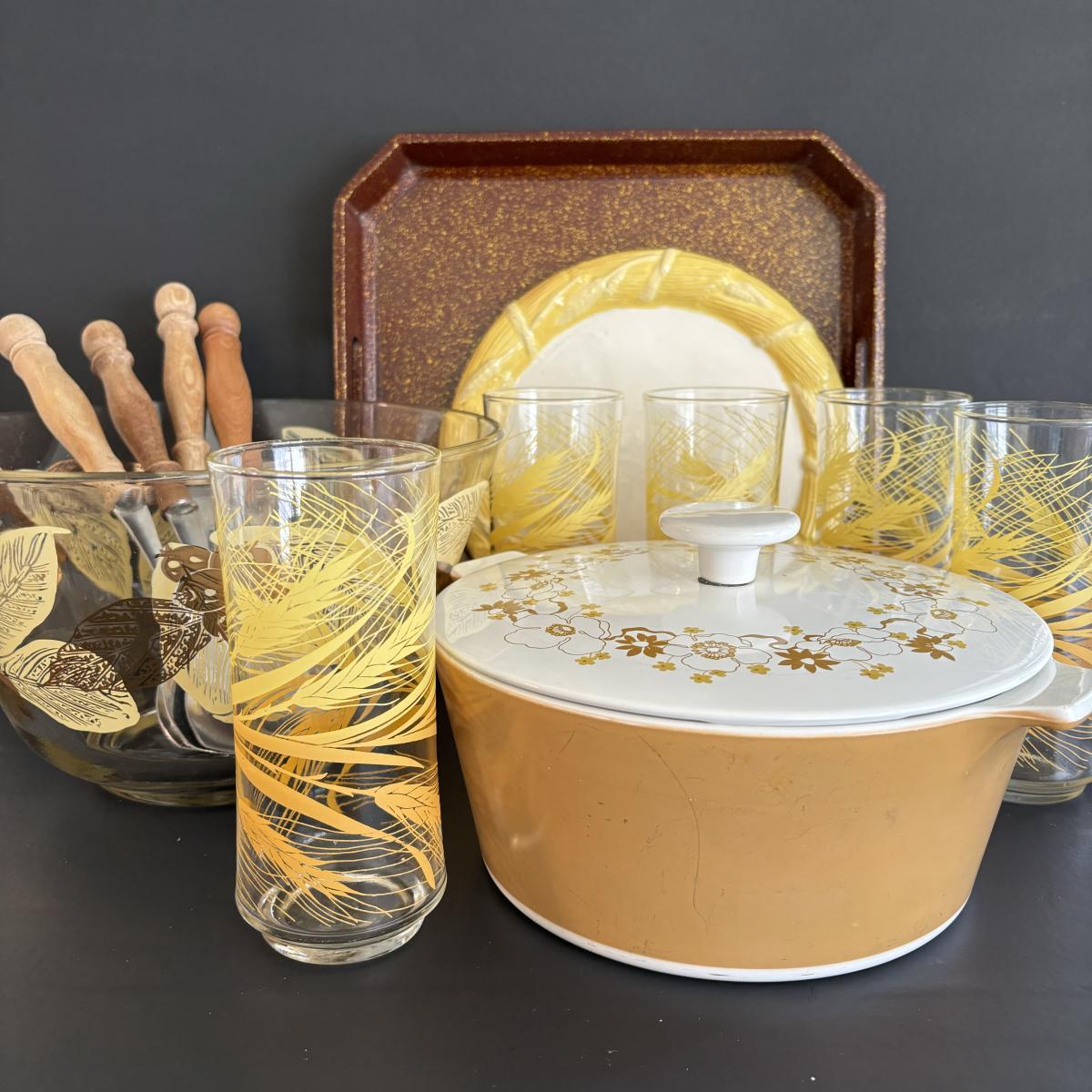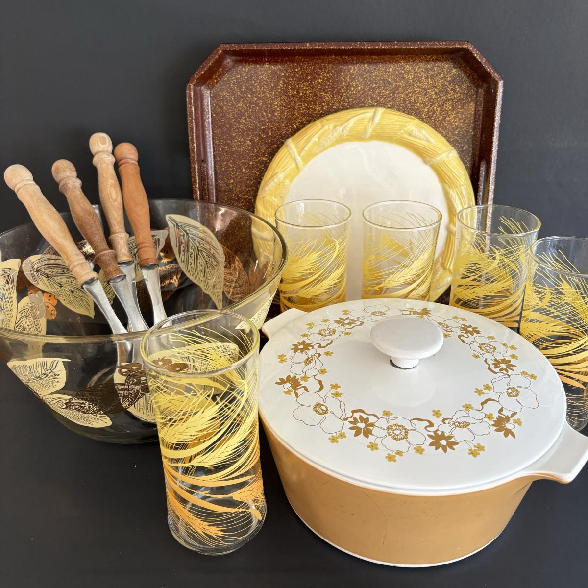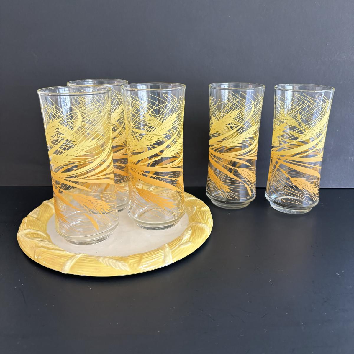 LOT 22: Vintage Libbey Wheat Glasses, MCM Hand painted Lacquer Ware Tray, Centura by Corning Covered Bowl & More