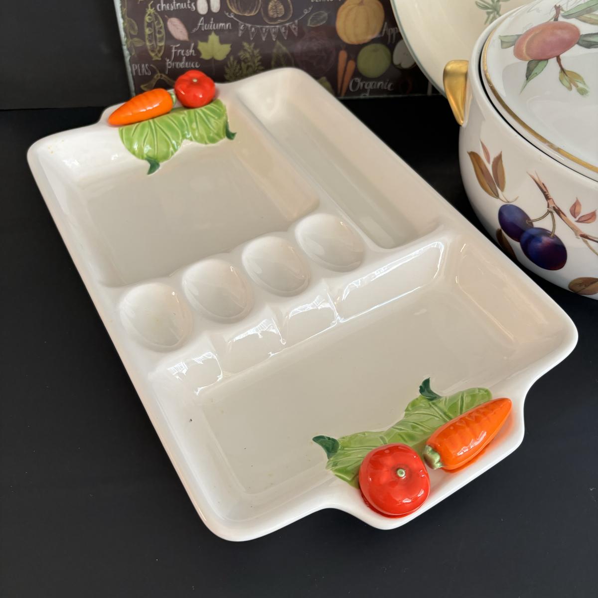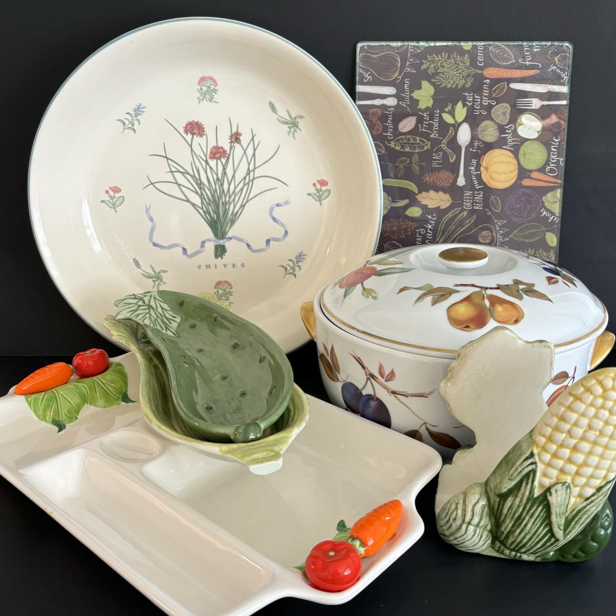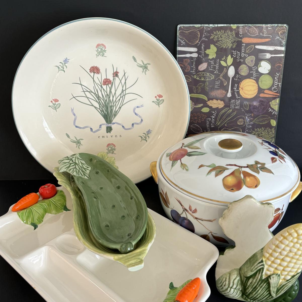 LOT 23: Royal Worcester Evesham Covered Serving Bowl, Woodbine Meadows "Chives" Bowl, Hand Painted/Glazed Ceramics, Egg/Vegetable Tray & More