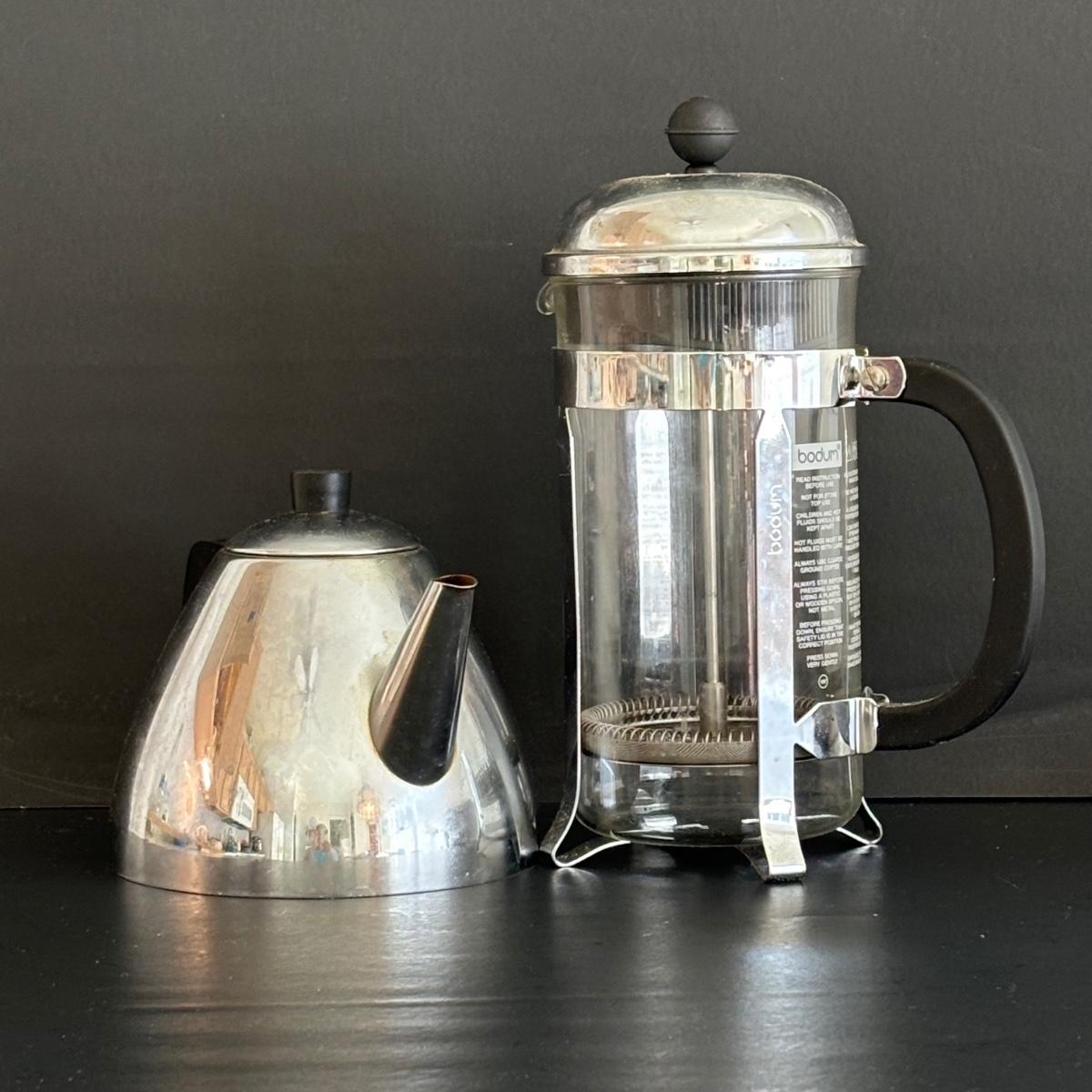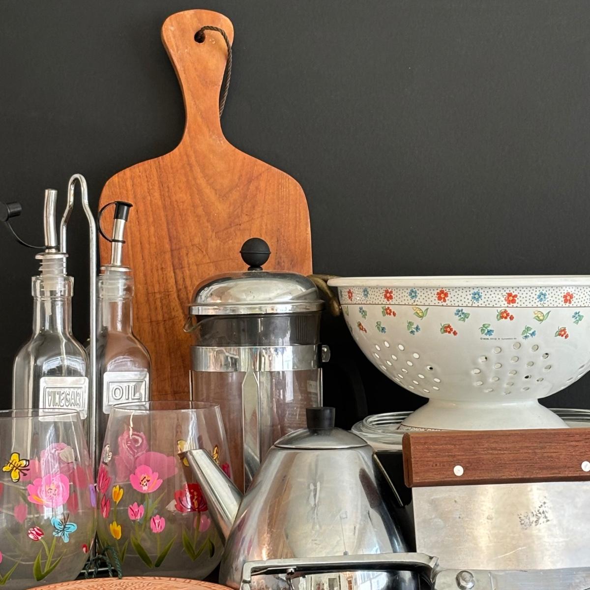 LOT 24: Bodum French Press Coffee Maker, 3qt Corning Ware Casserole Dish, Chro14 Kitchen Scissors, Enamel Colander, Terra Cotta Bread Aarmer and More