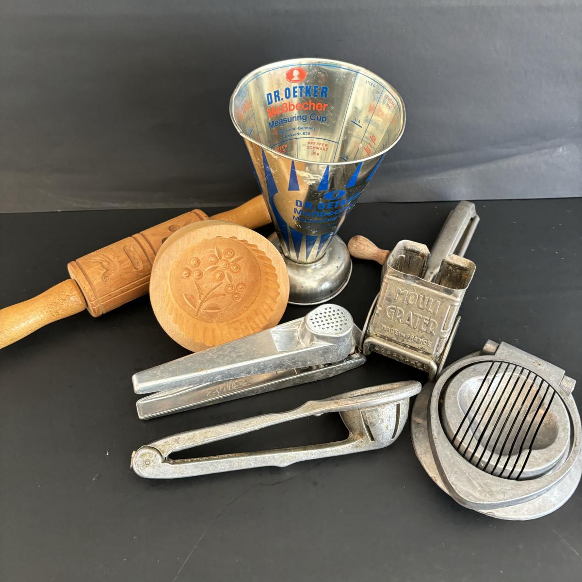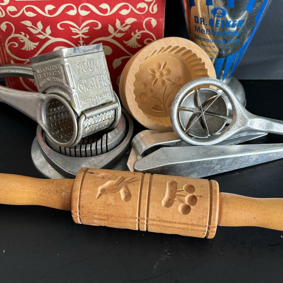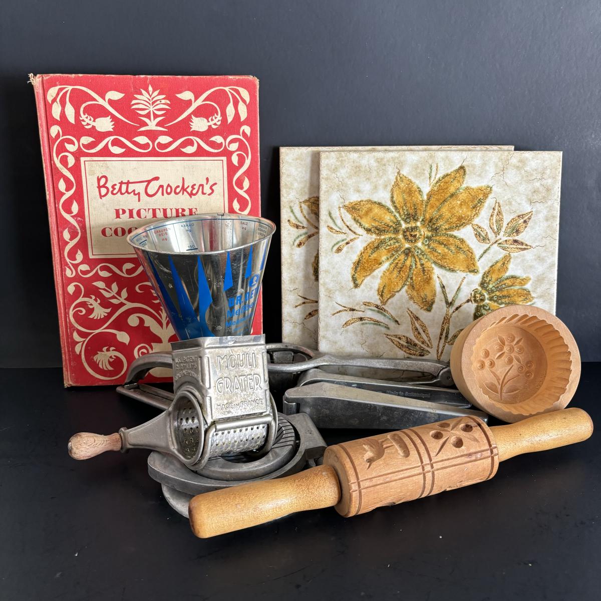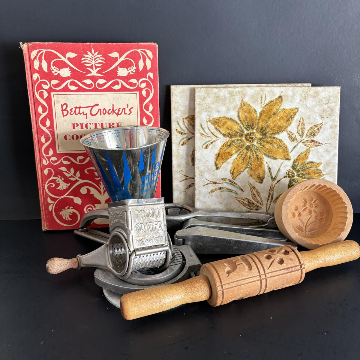 LOT 27: Vintage Kitchen Gadgets: Dr Oetker MeBbecher Metal Measuring Cup, Springerle Rolling Pin, Vintage Ceramiche Girardi Flora Tiles & More