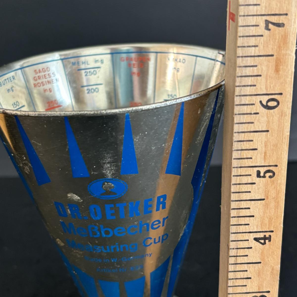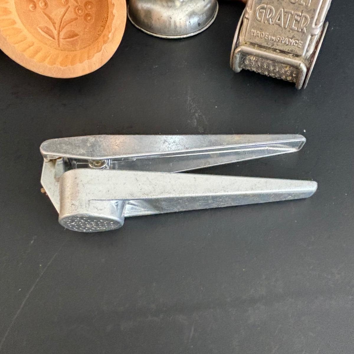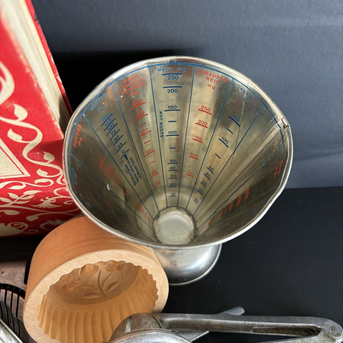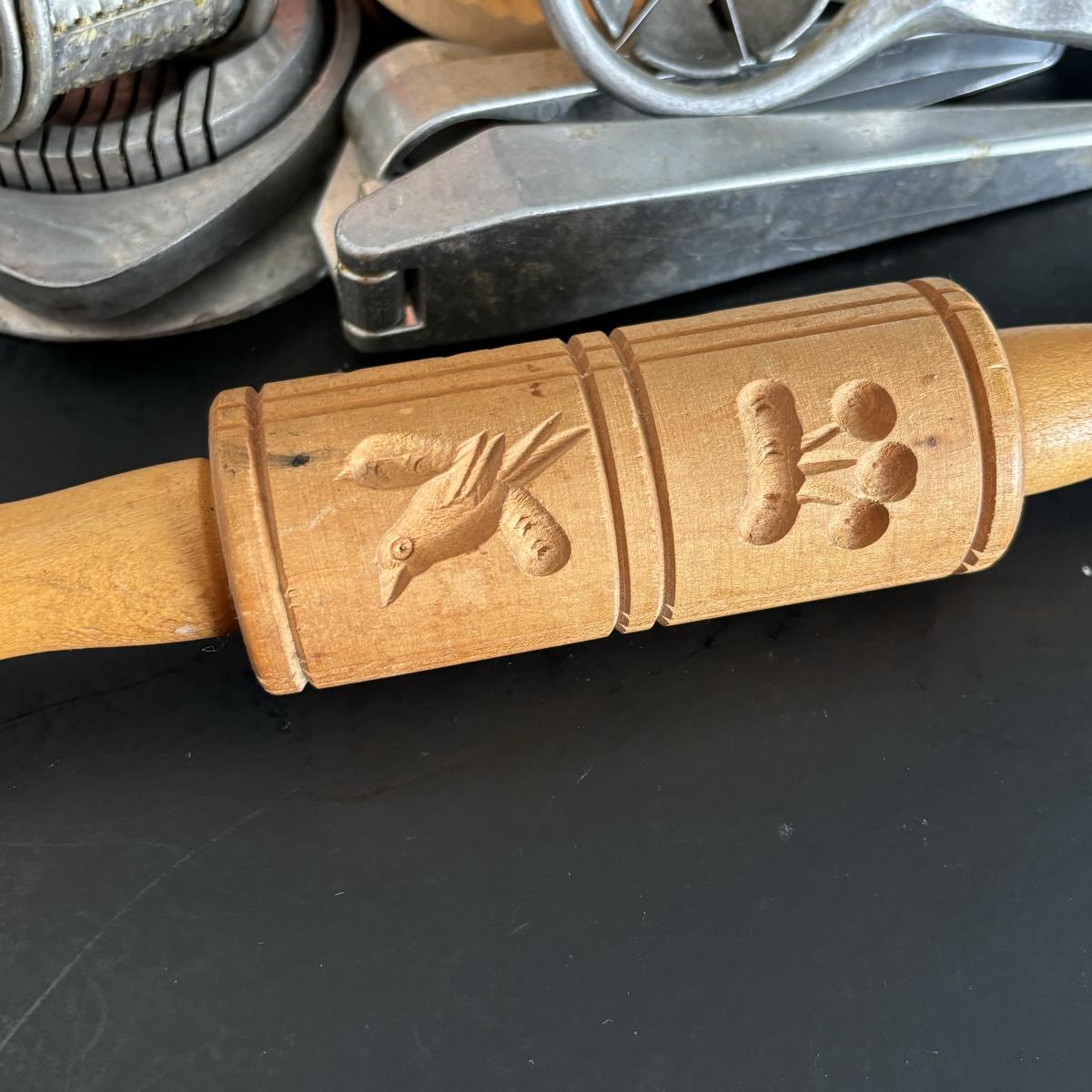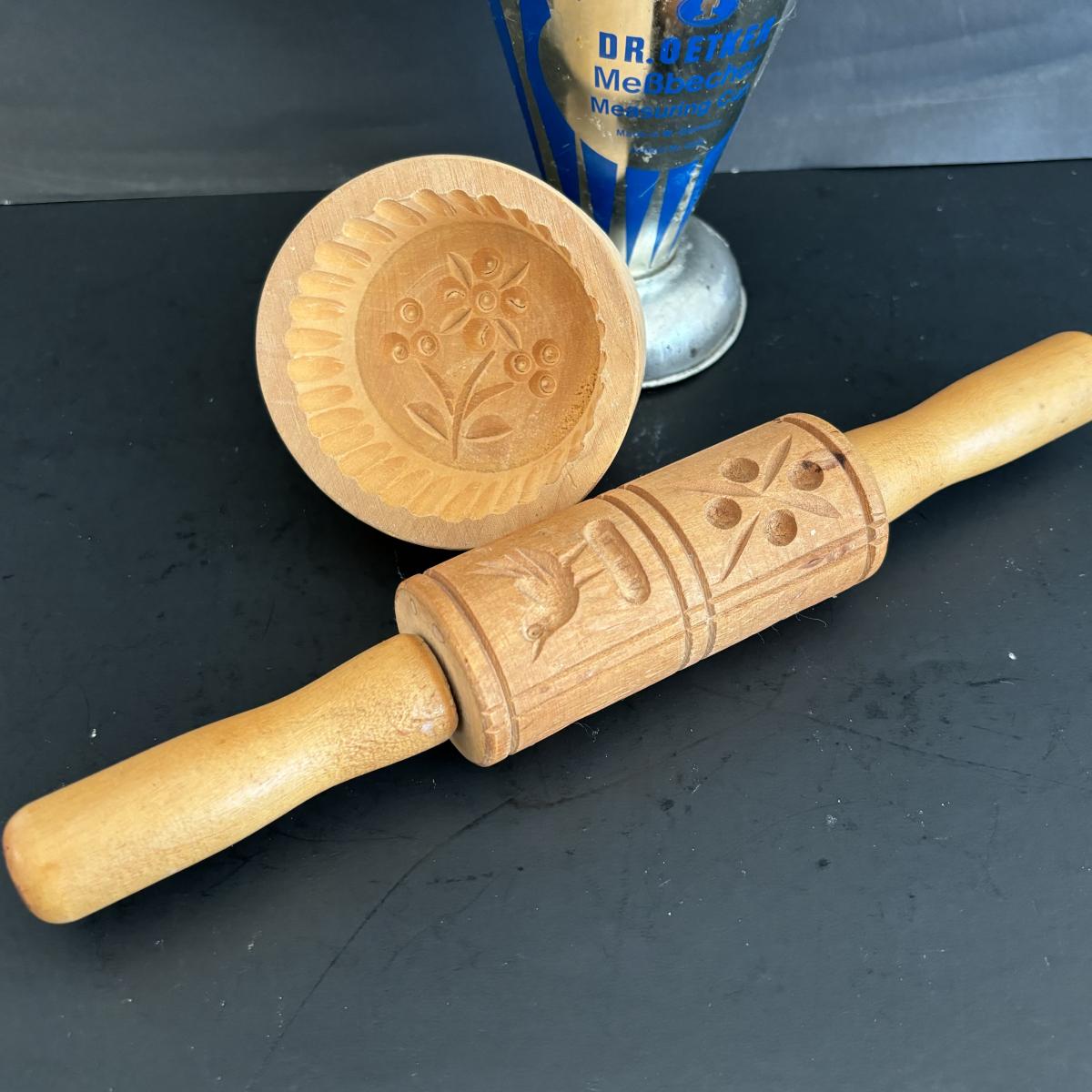 LOT 27: Vintage Kitchen Gadgets: Dr Oetker MeBbecher Metal Measuring Cup, Springerle Rolling Pin, Vintage Ceramiche Girardi Flora Tiles & More