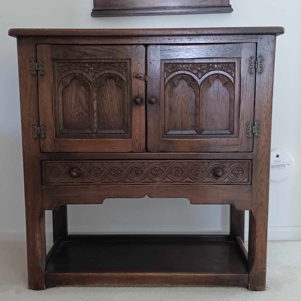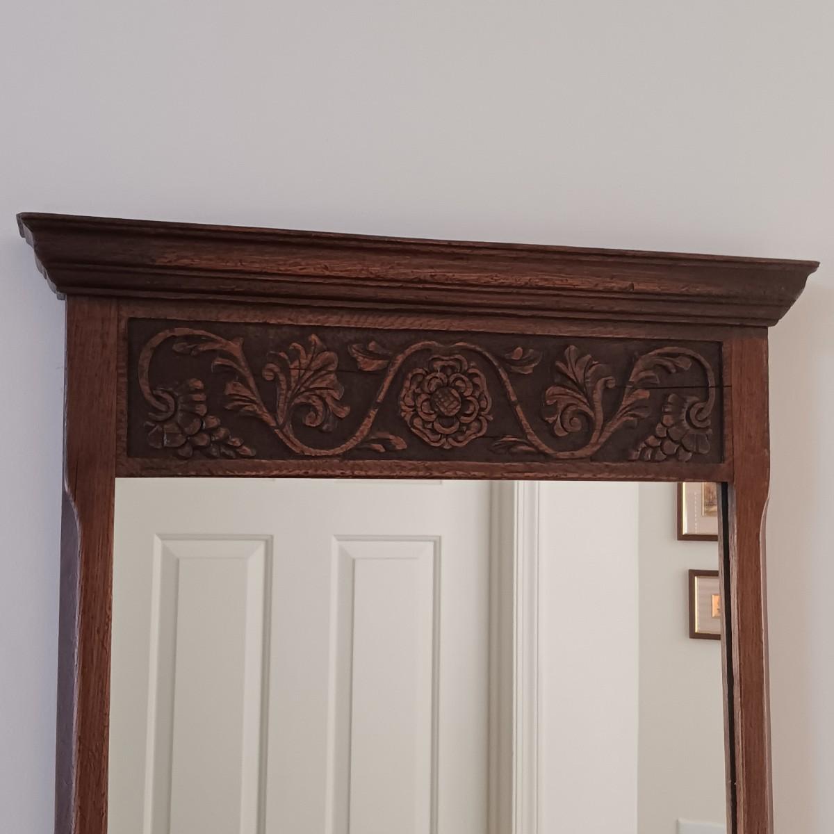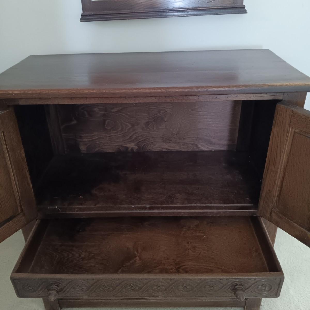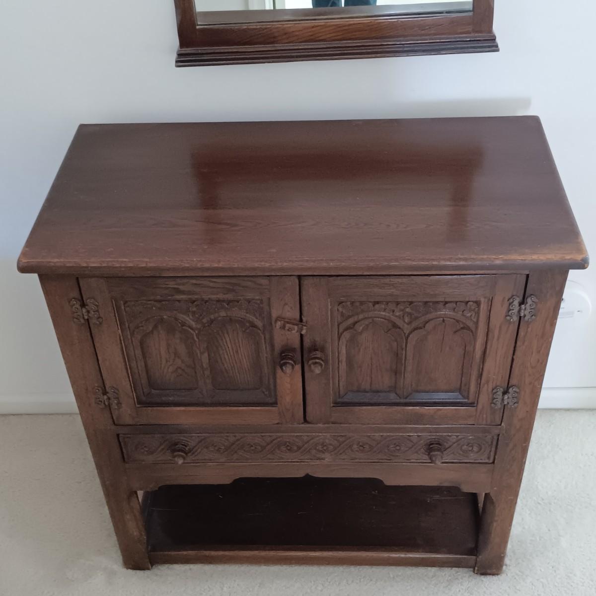 LOT 30: ETHAN ALLEN Royal Charter Oak Jacobean Style Console Cabinet & Ethan Allen Mirror