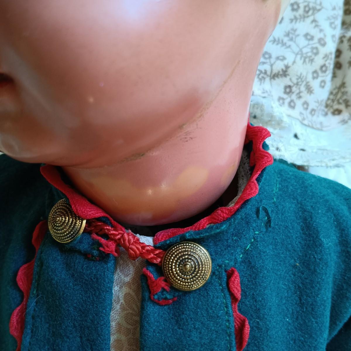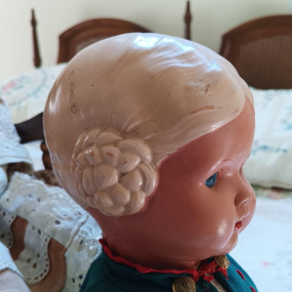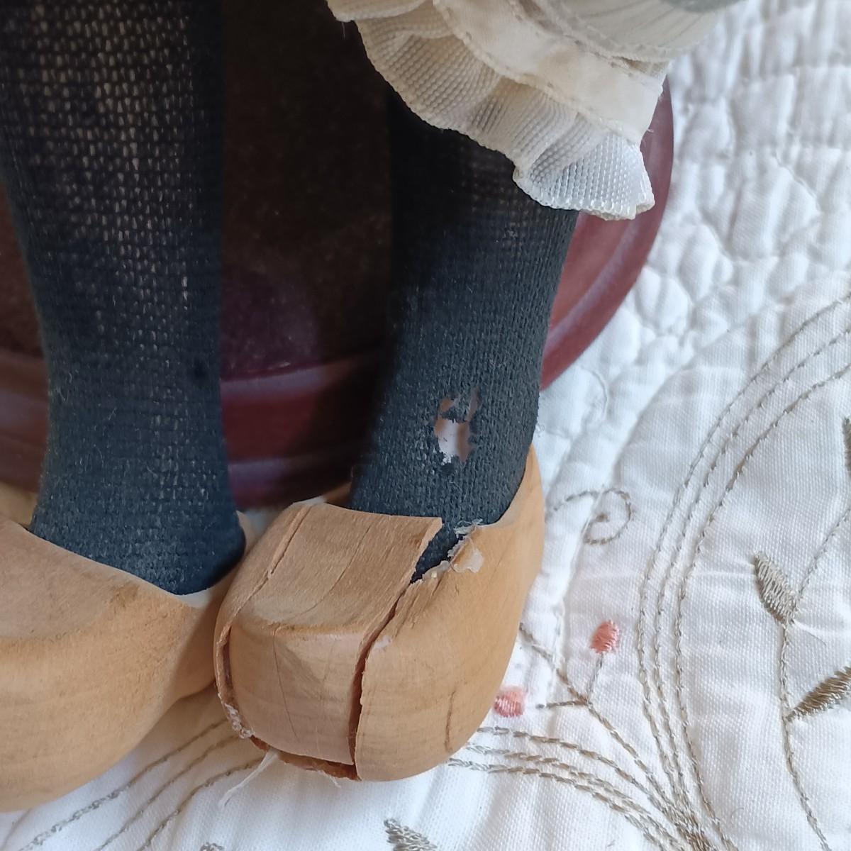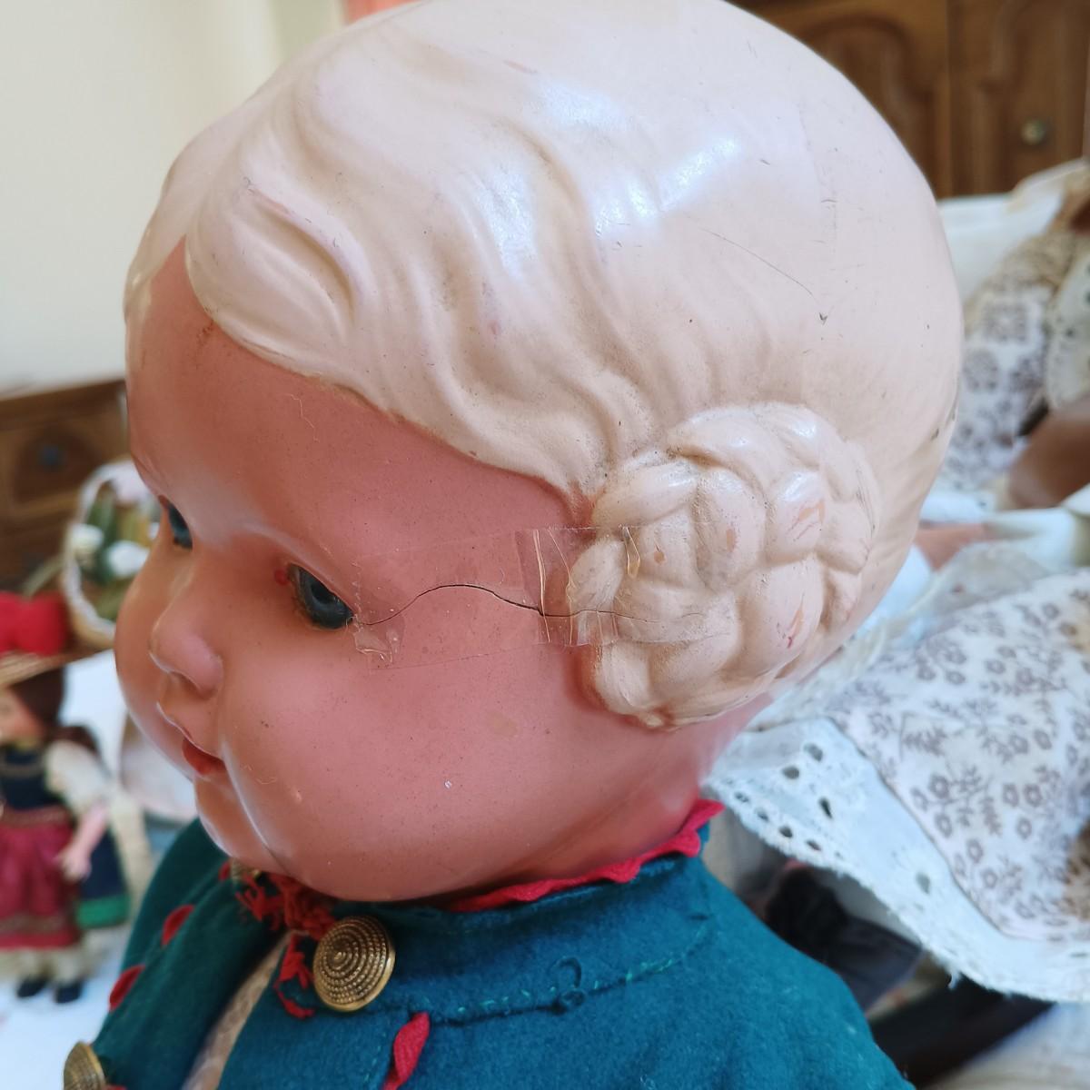 The Celluloid Doll is missing a leg and has some damage to the head and ha d.