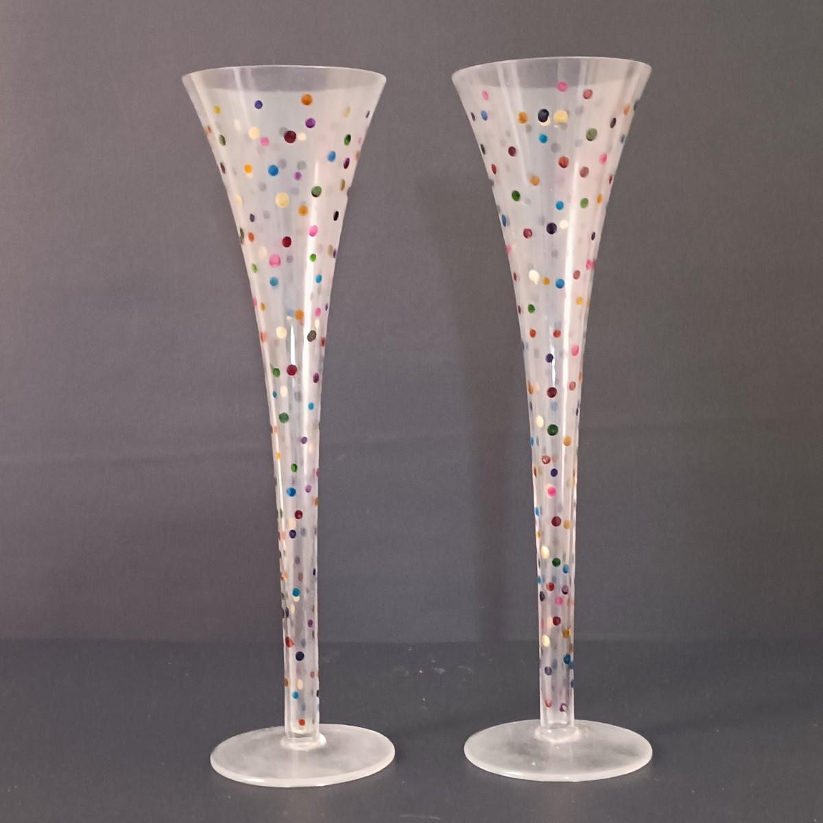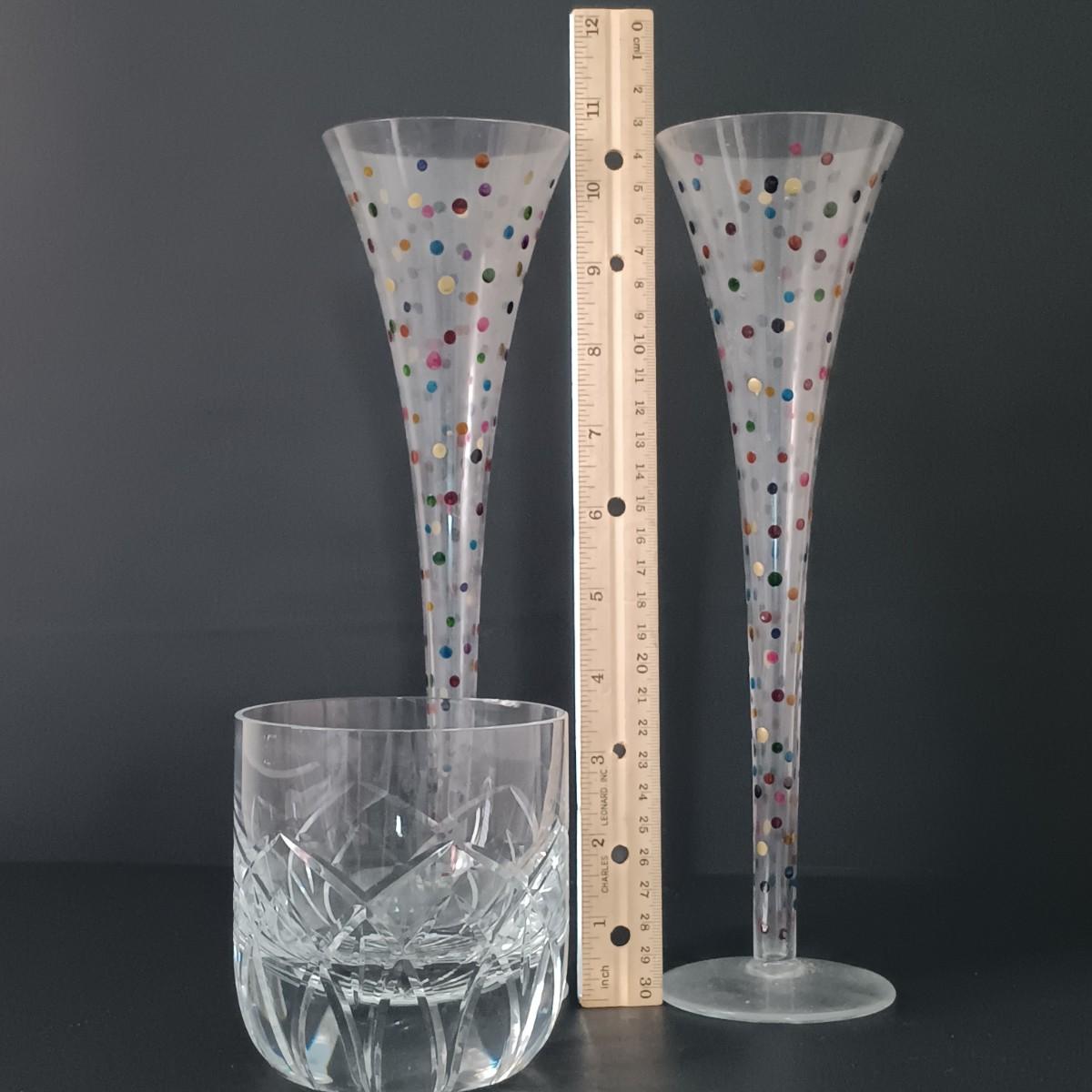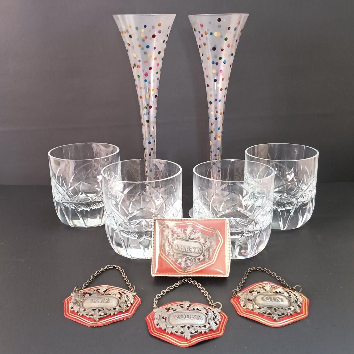 LOT 48: Hoffritz Decanter Tags Set of 4, Polkadot Champagne Flutes and Block Crystal Glasses