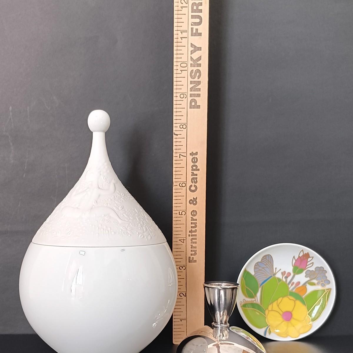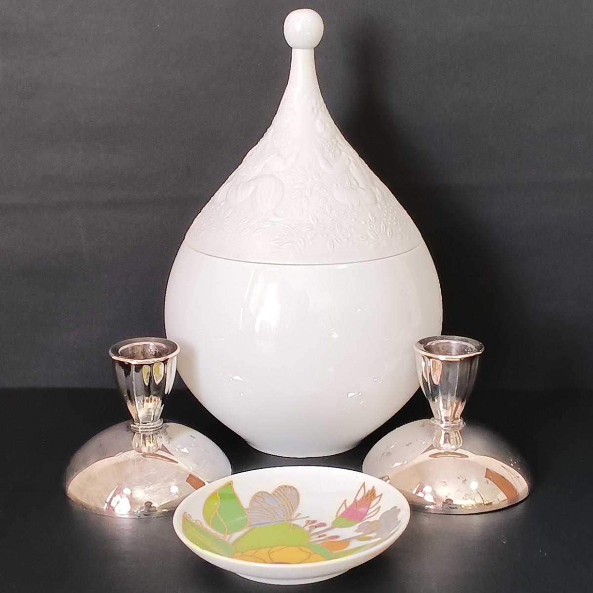 LOT 52: Rosenthal Bjorn Wiinblad Magic Flute Covered Bowl, Small Rosenthal Floral Trinket Dish w/Gilt Detailing & Oneida Plated Candlestick Holders