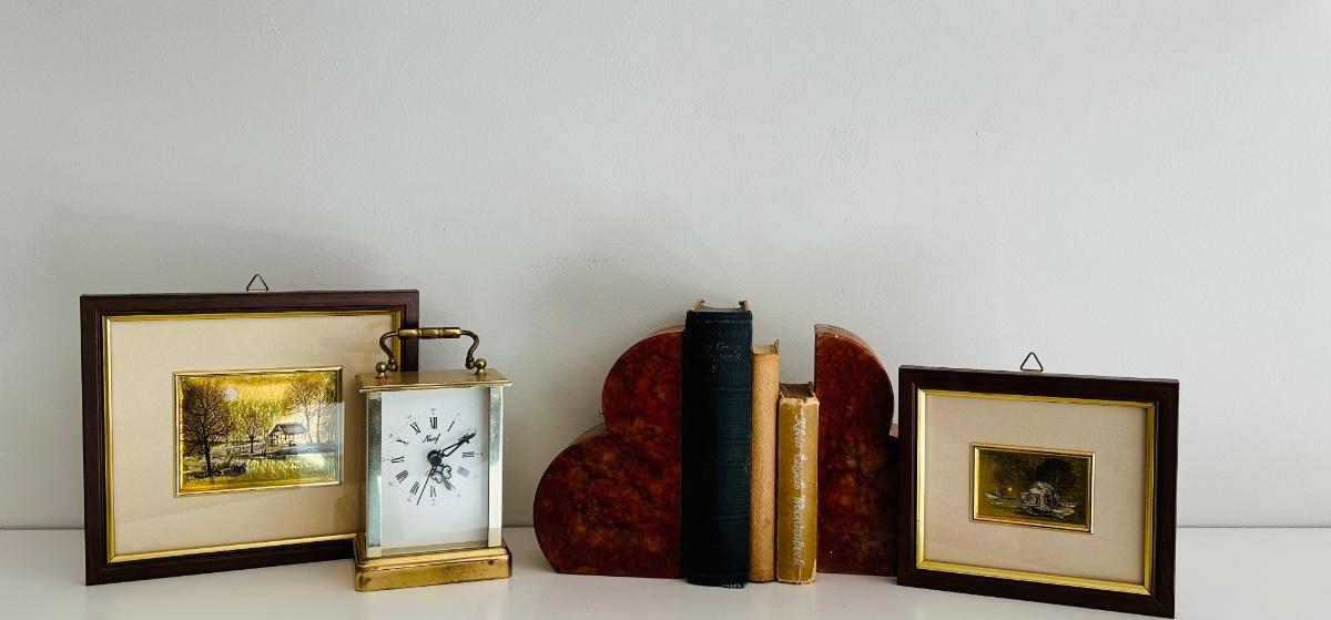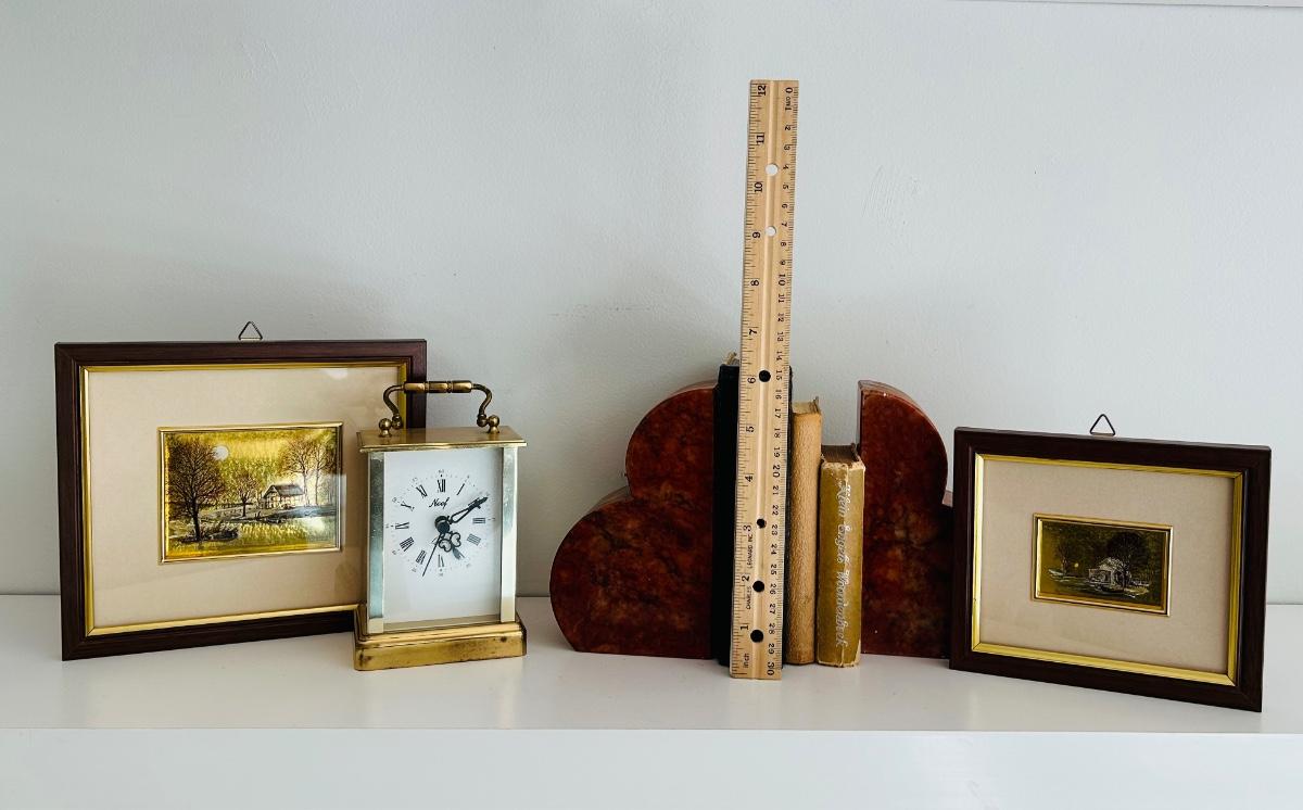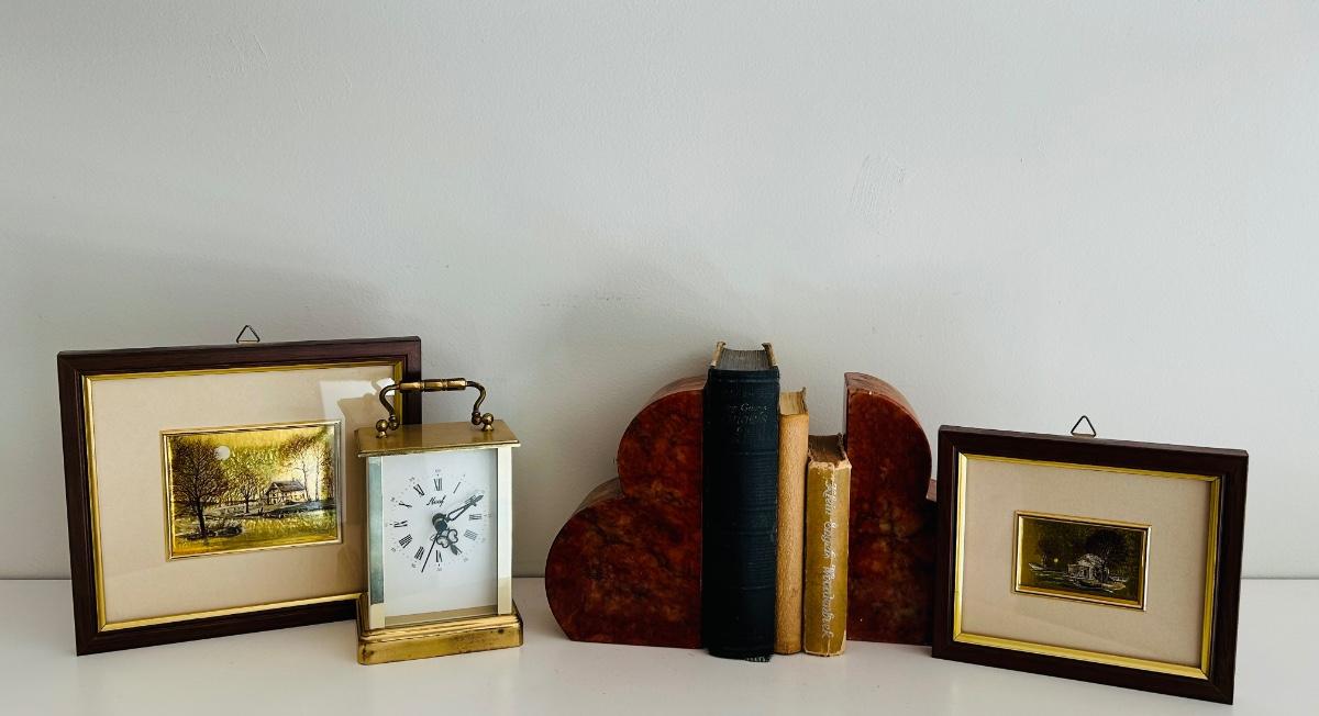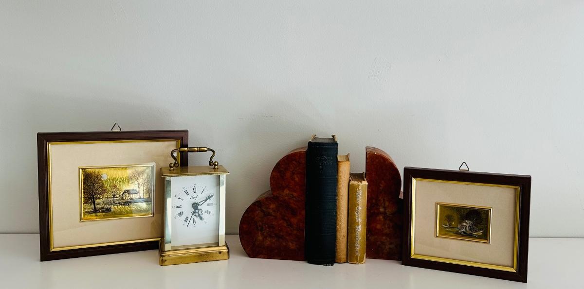 LOT 68: Italian Marble Bookends, Neef Clock, Framed Prints and Little Vintage Books