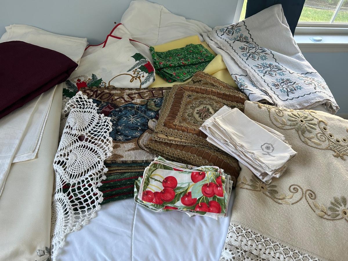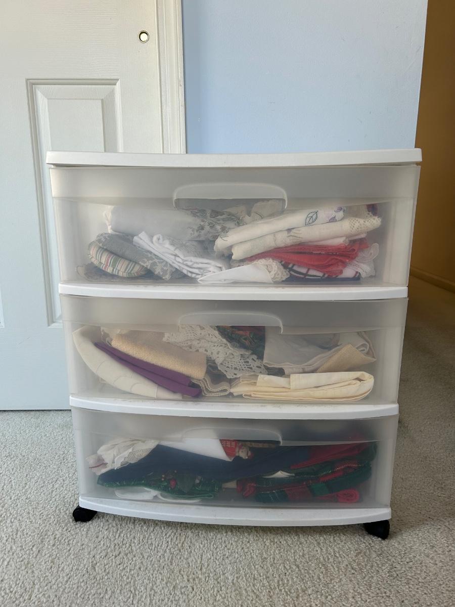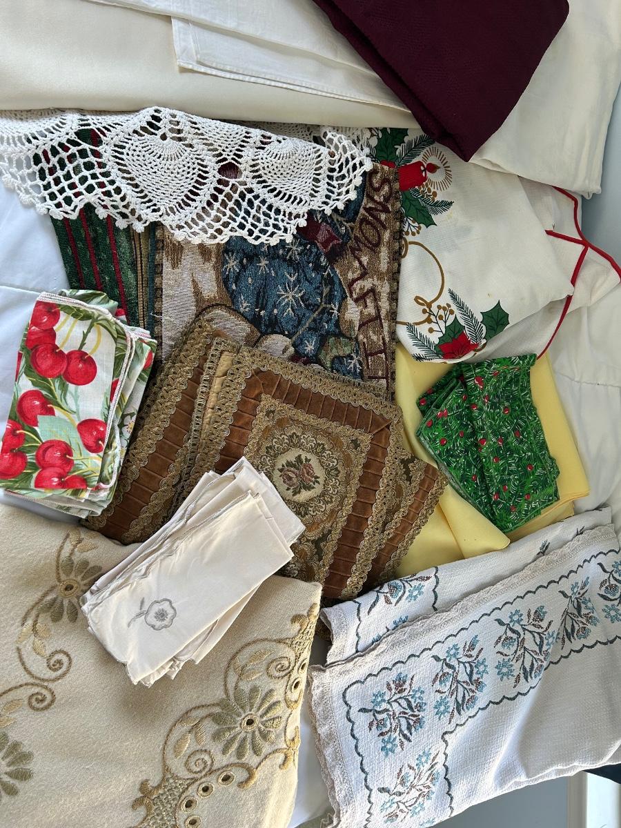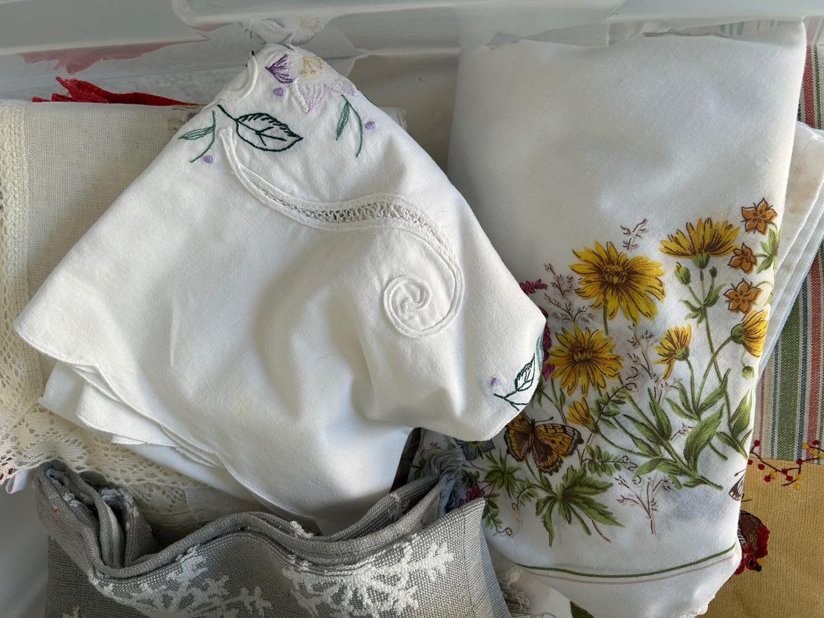 LOT 81: Large Linen Collection and Plastic Closet Dresser For Storage - Tablecloths, Napkins, Doilies, Placemats and more