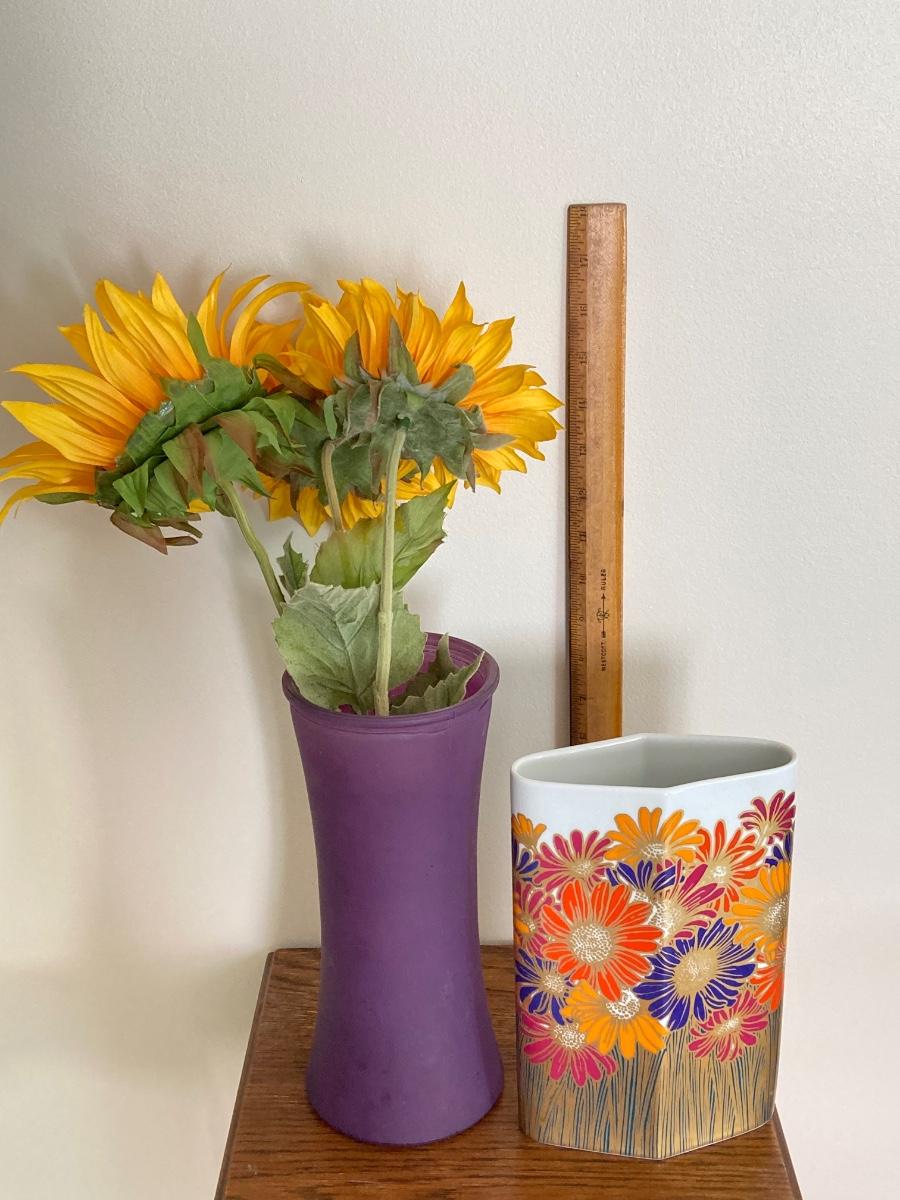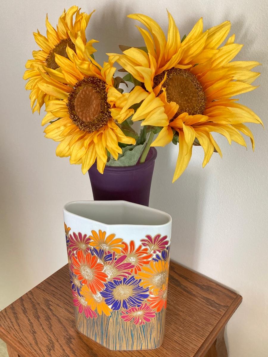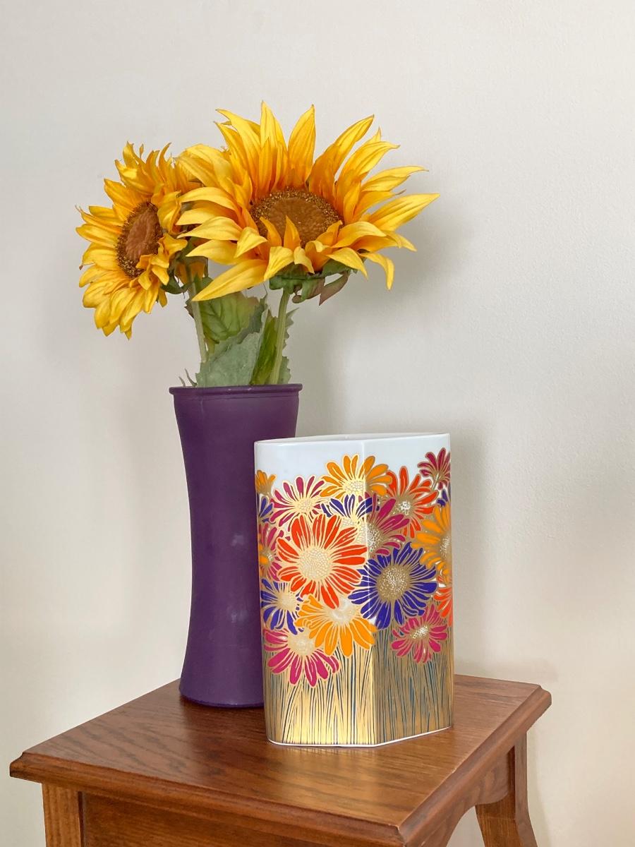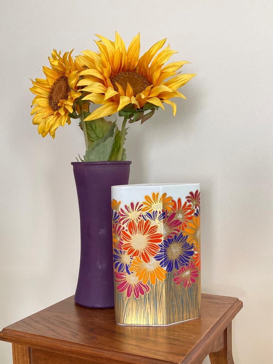 LOT 93L: Rosenthal Germany Studio-Line Diamond Form Vase w/Floral Pattern & Gilt Detailing, Lane Square Accent Table and Frosted Purple Vase with Faux Sunflowers