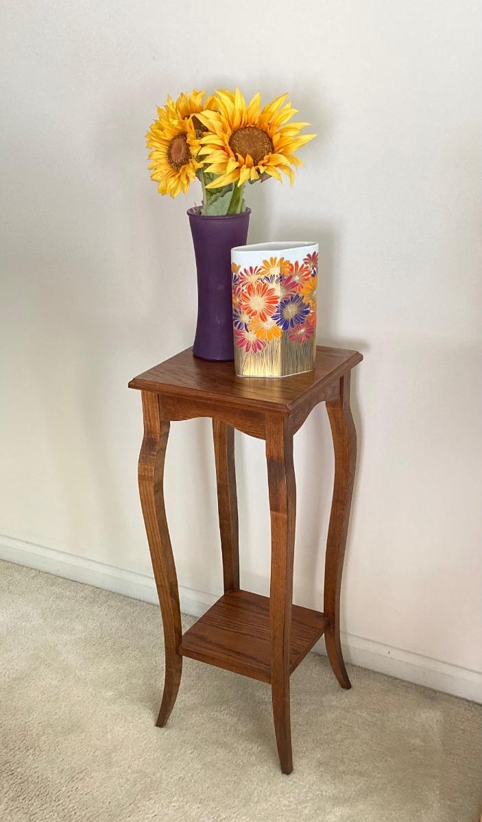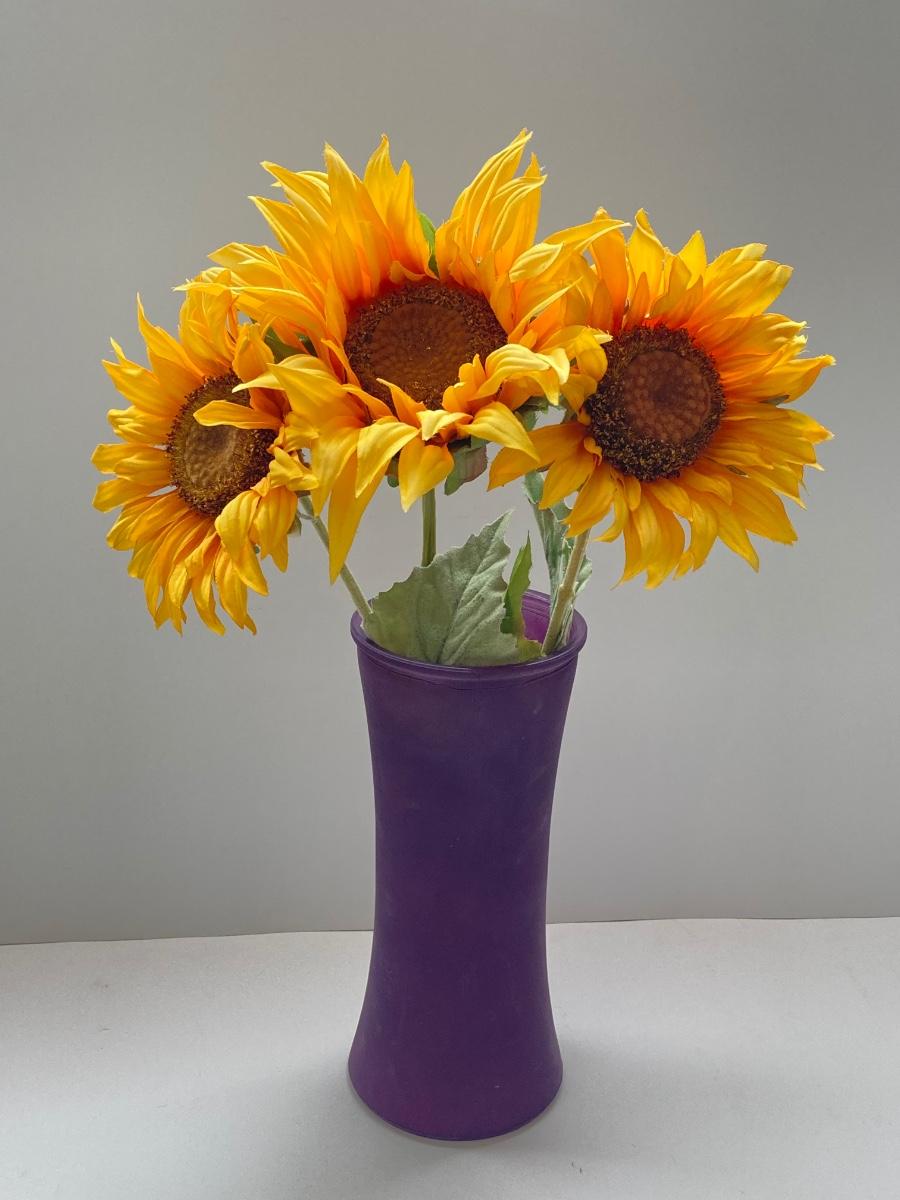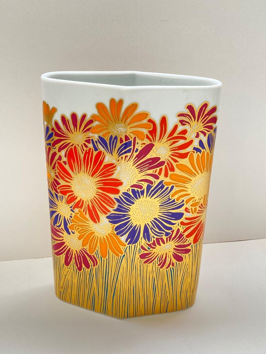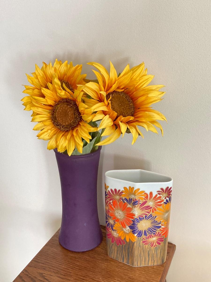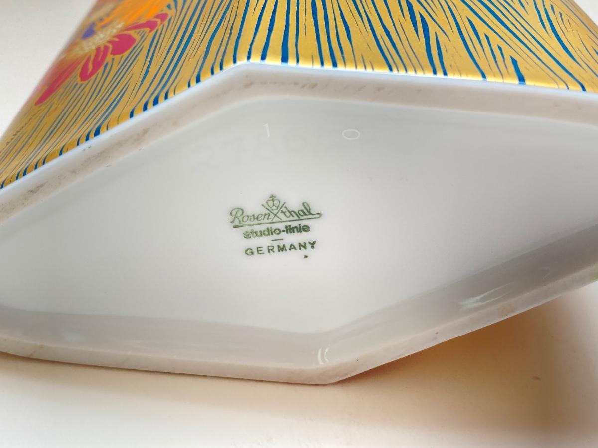 LOT 93L: Rosenthal Germany Studio-Line Diamond Form Vase w/Floral Pattern & Gilt Detailing, Lane Square Accent Table and Frosted Purple Vase with Faux Sunflowers
