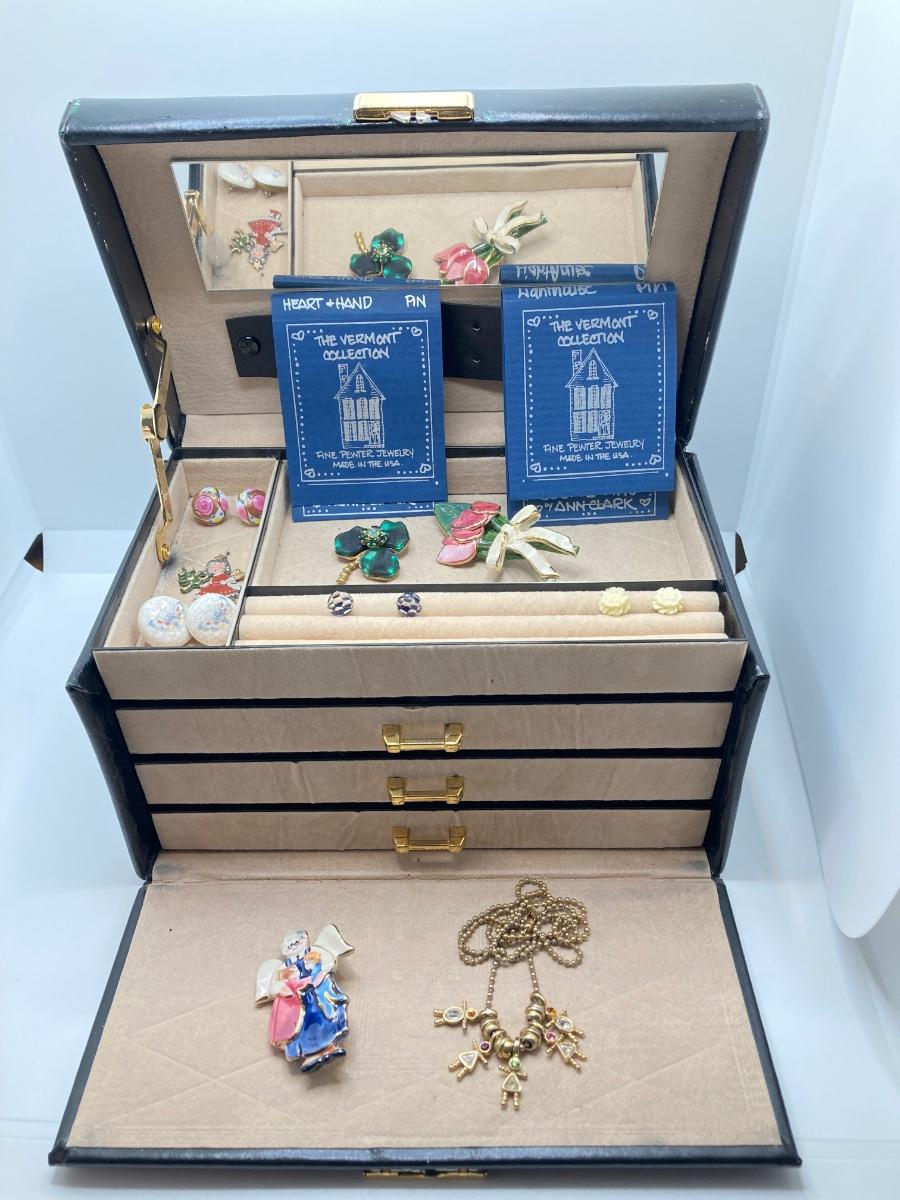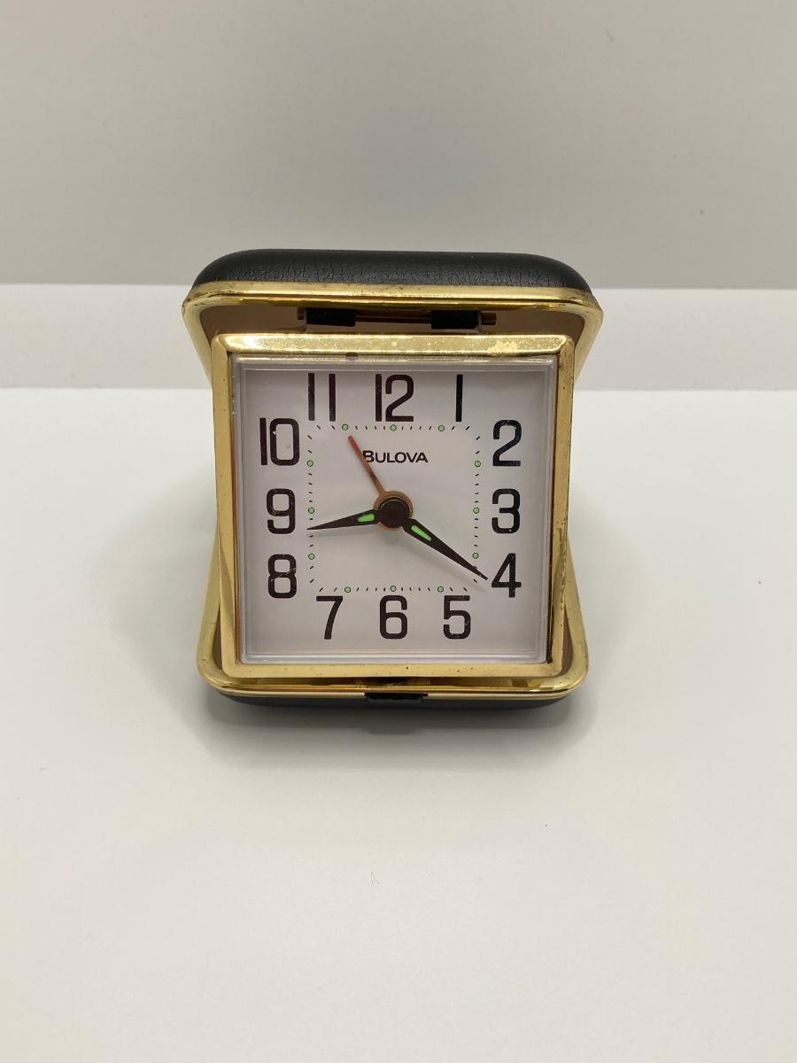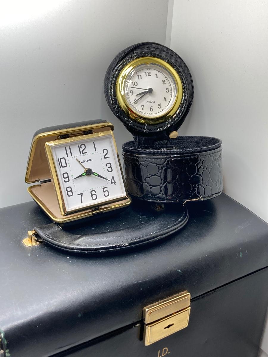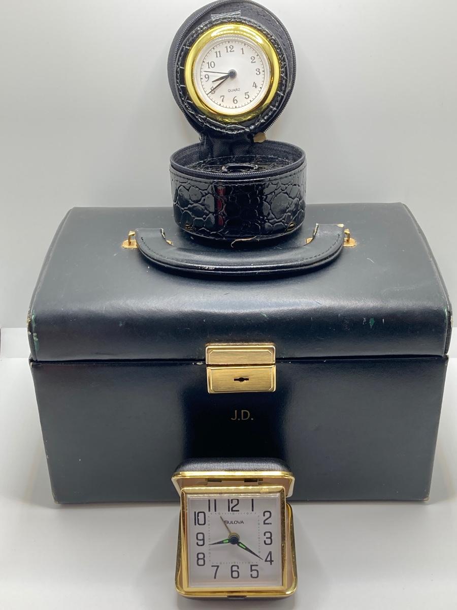 LOT 126J: Jewelry Box with Collection of Jewelry (Avon / BSK and More), Bulova Alarm Clock and Travel Clock