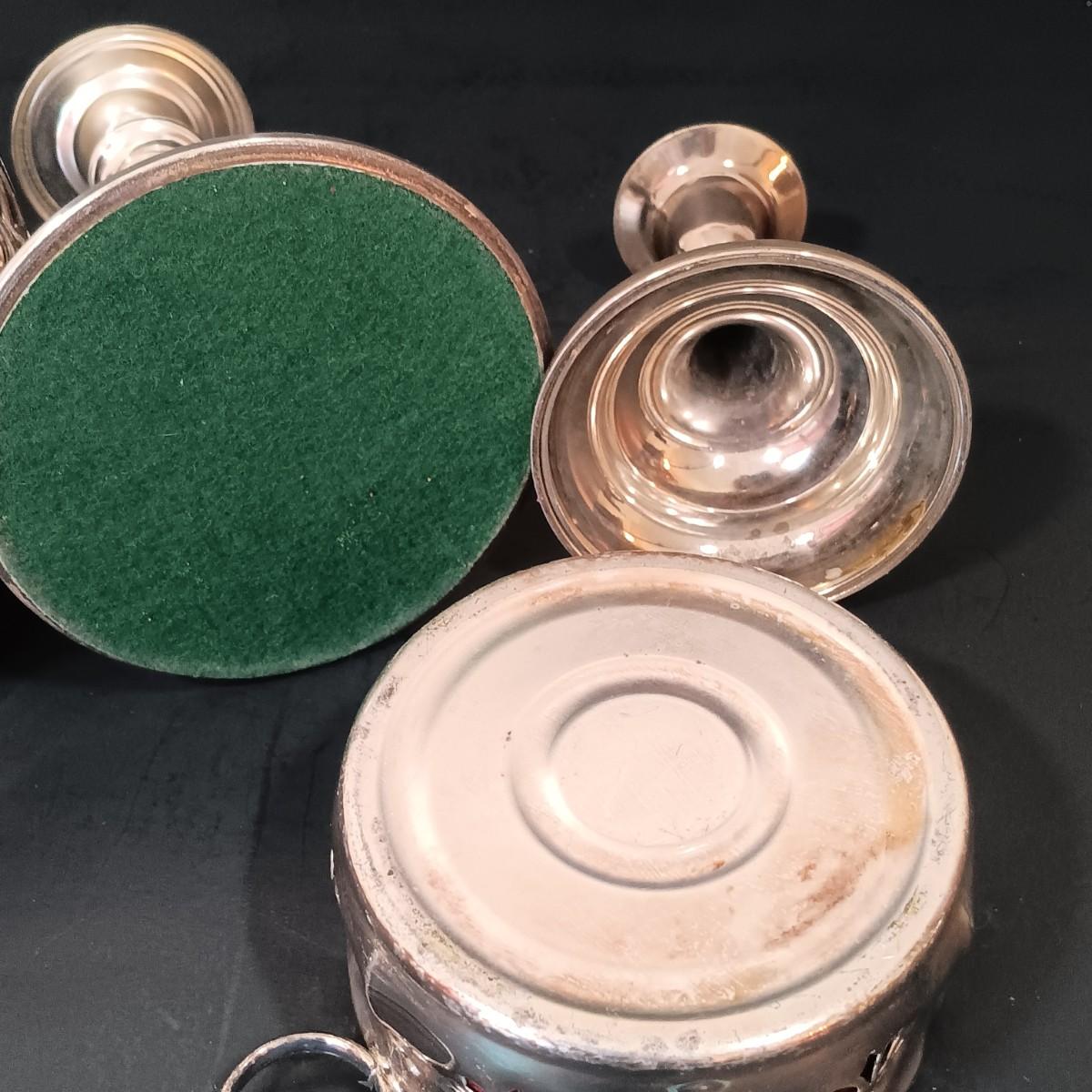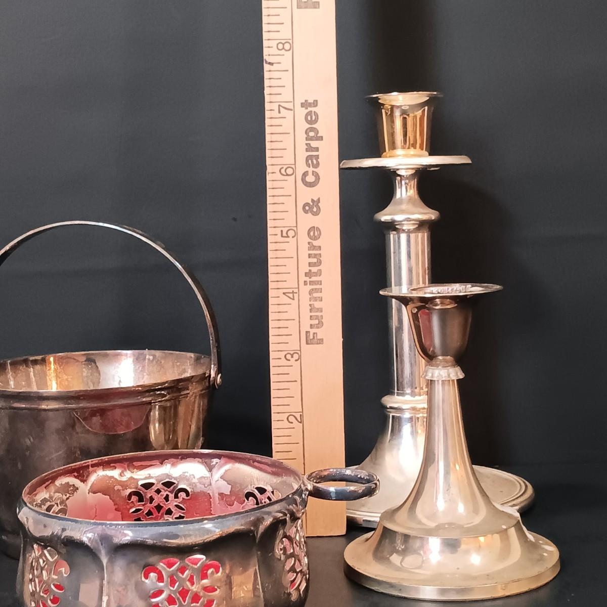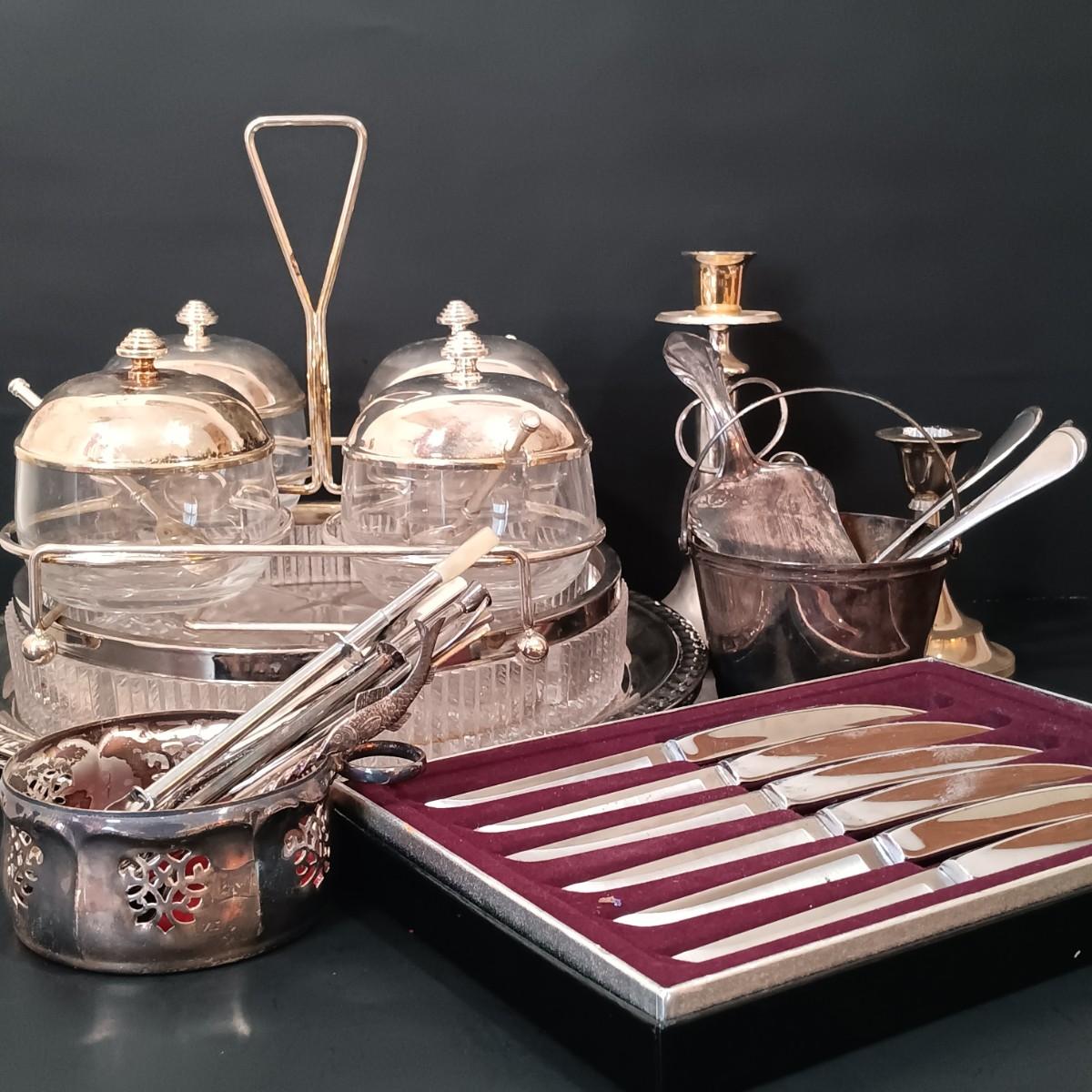 LOT 148: MCM 4-Piece Cruet, Silverplate Dishware & More
