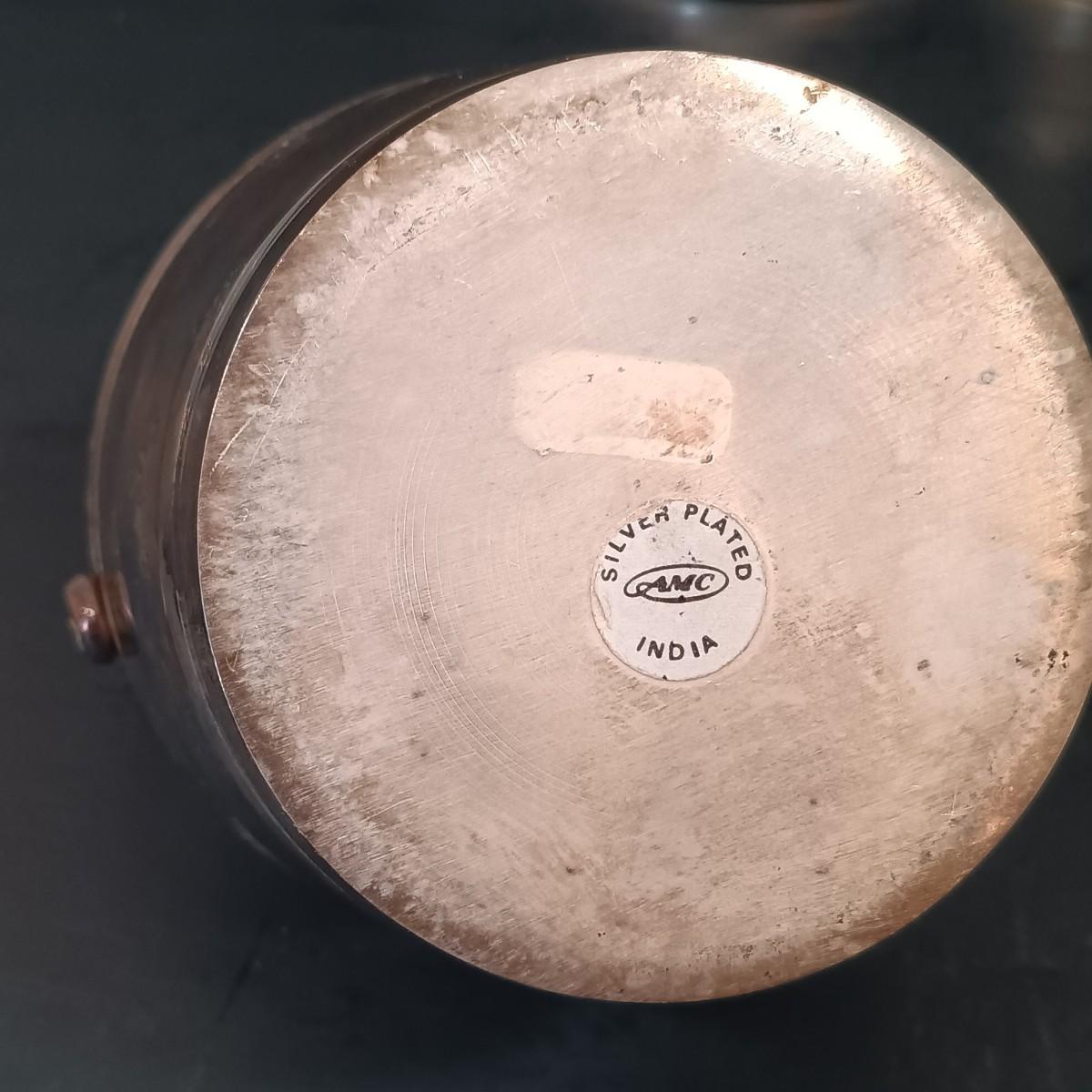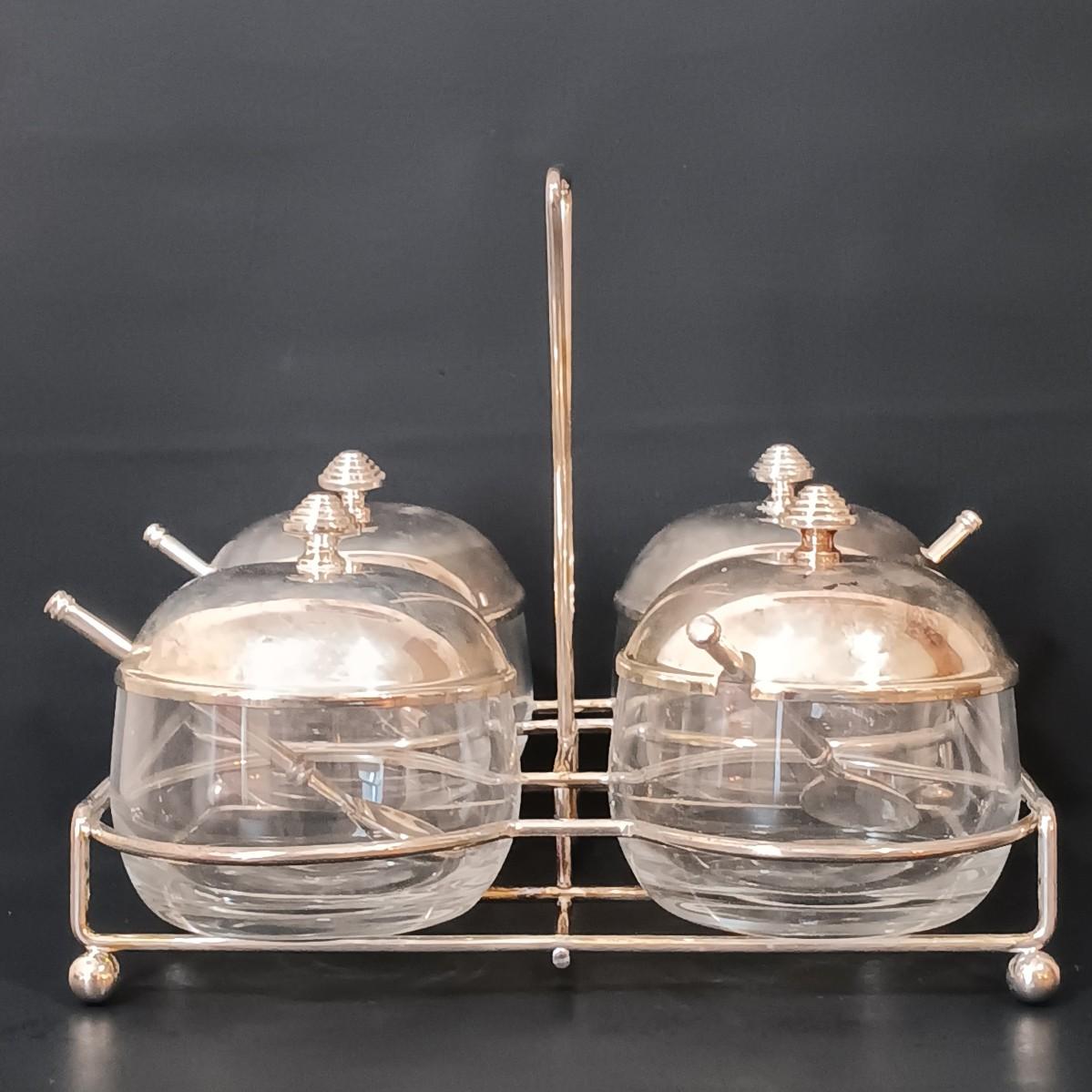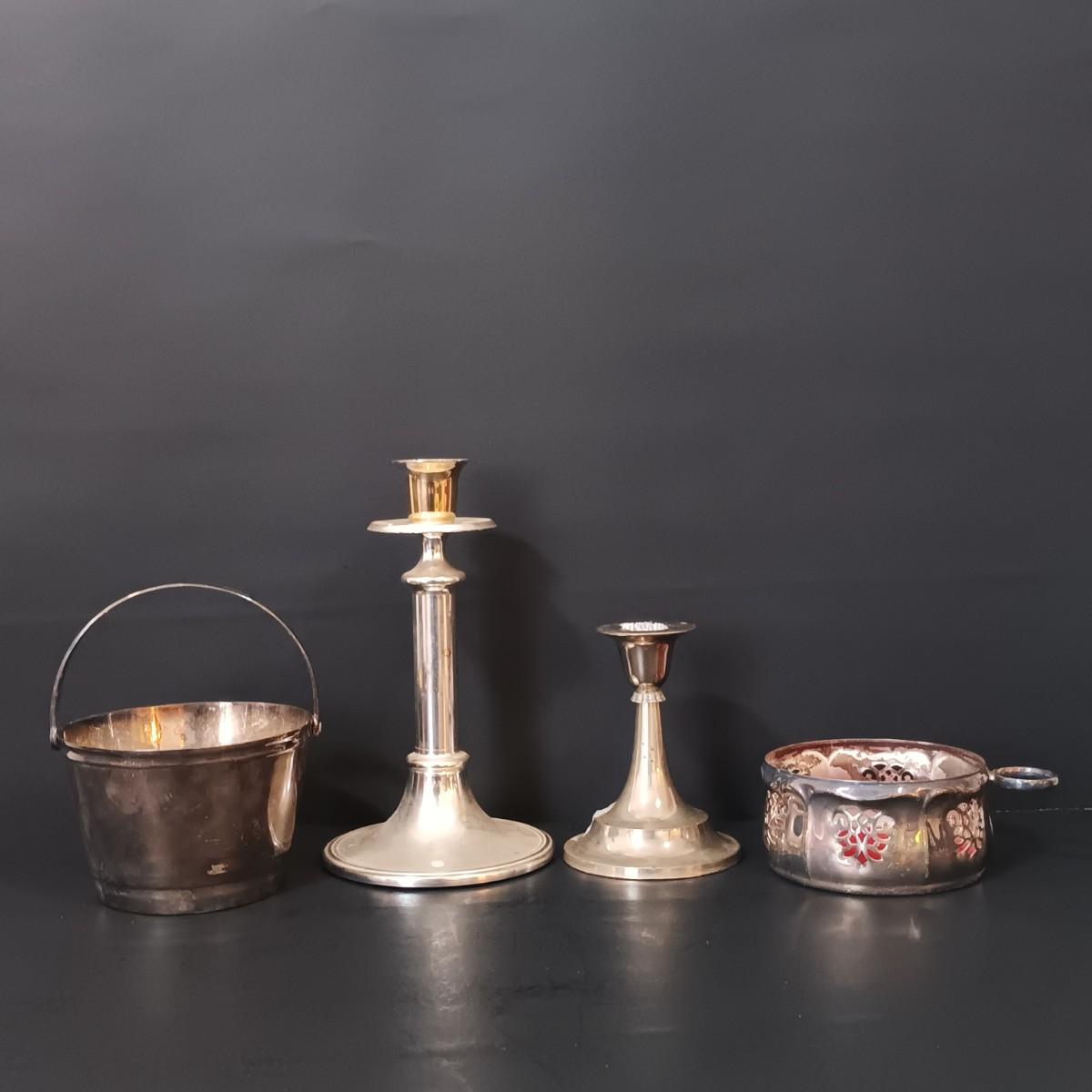 LOT 148: MCM 4-Piece Cruet, Silverplate Dishware & More