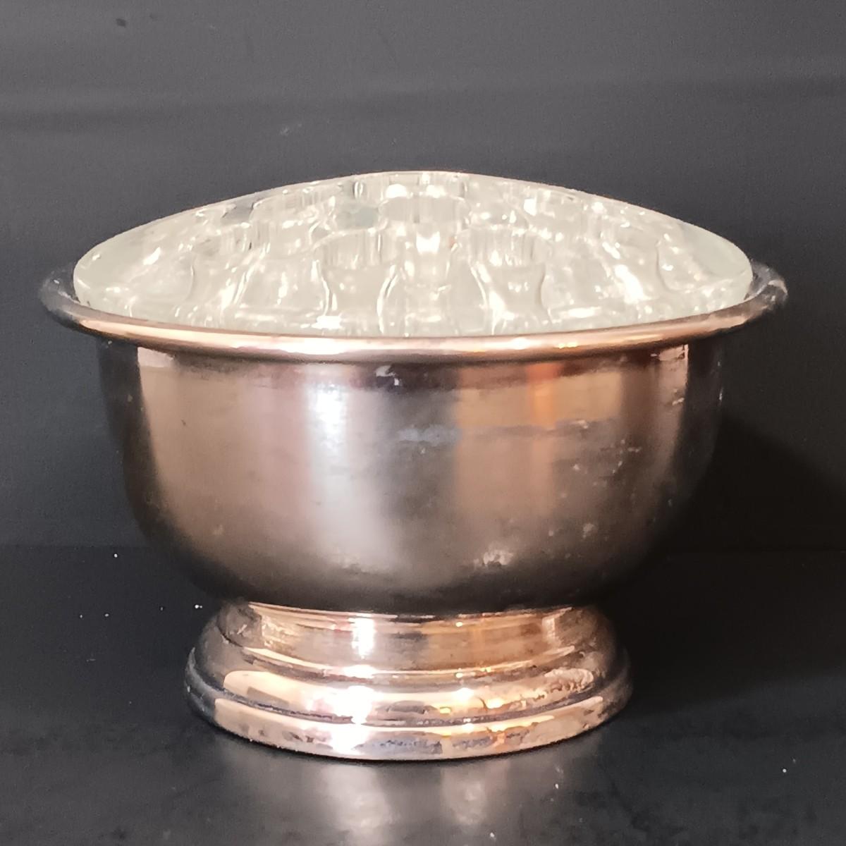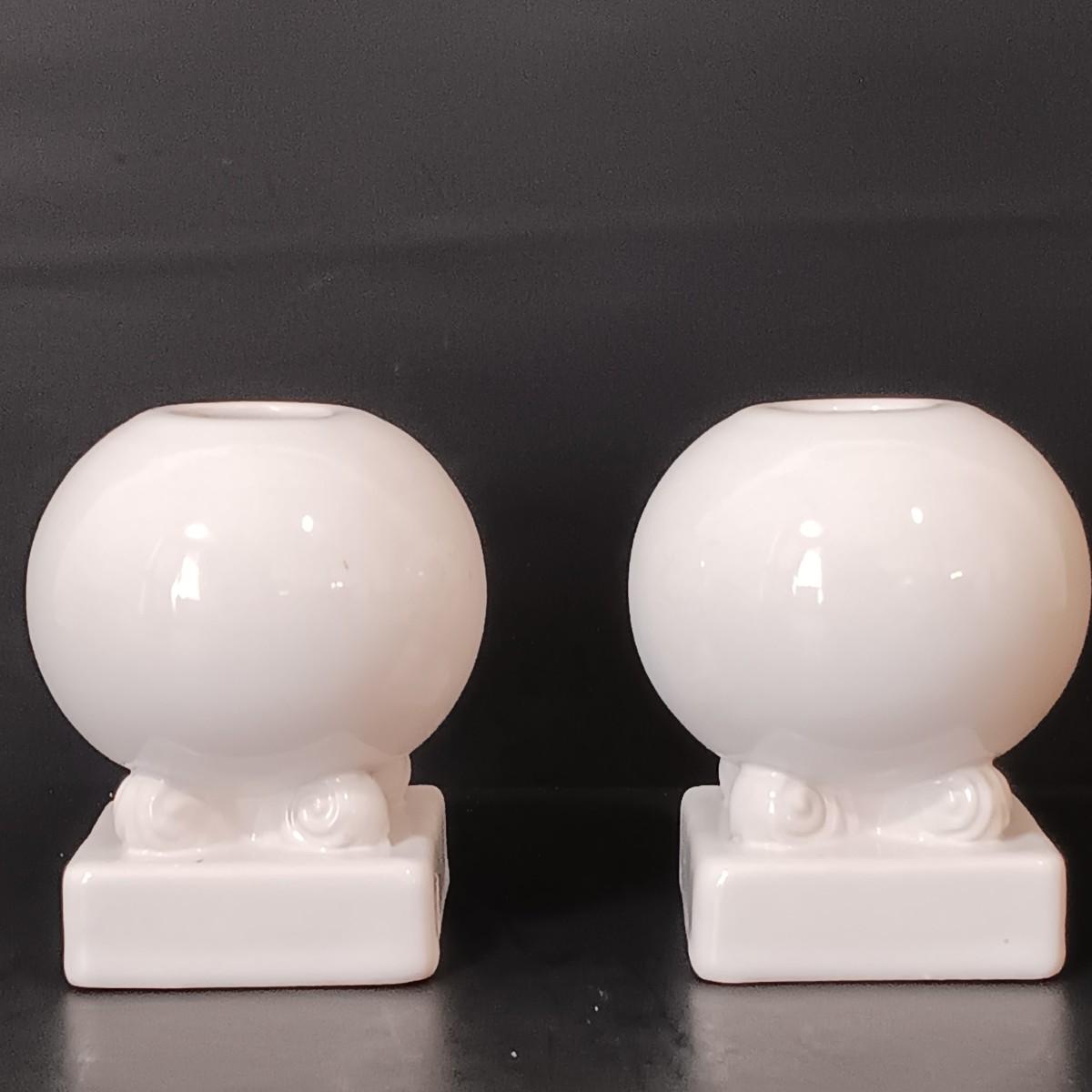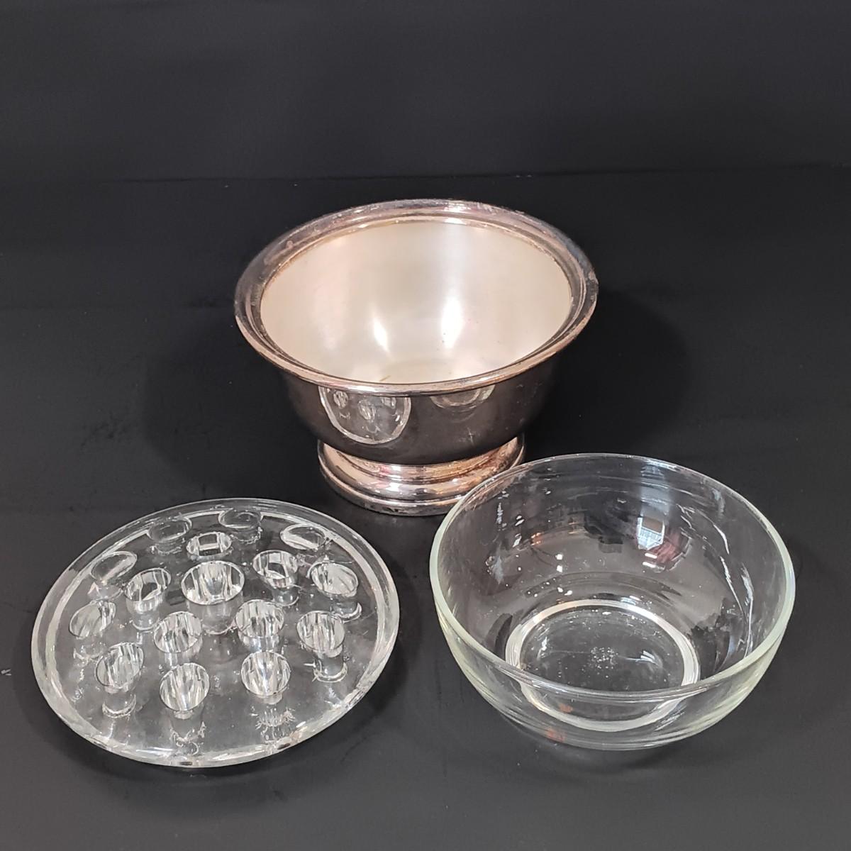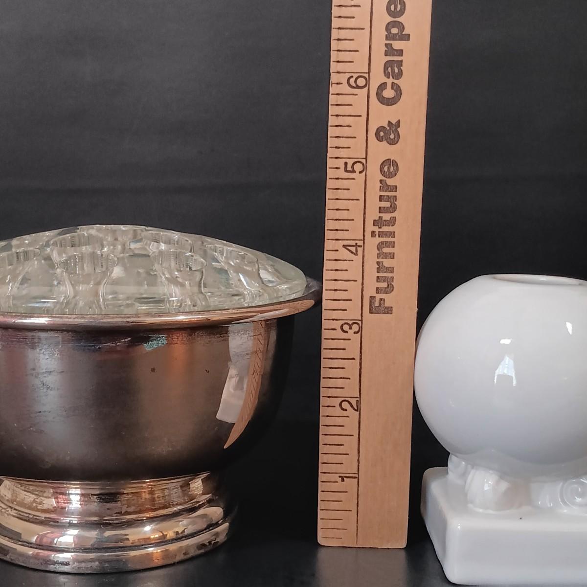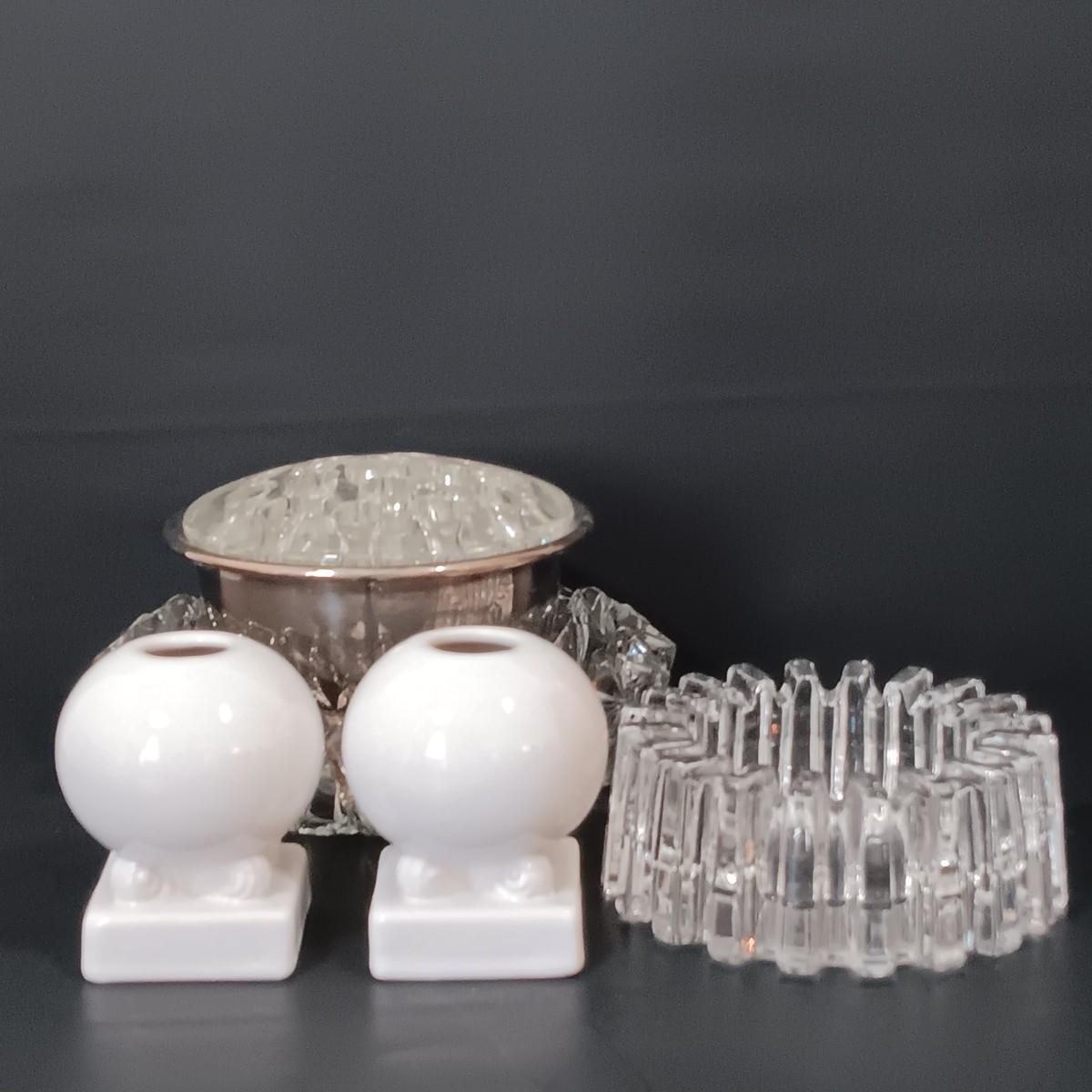 LOT 149: Vintage Baldwin Silverplate Dish with Glass Frog. Fiesta White Bulb Candleholders & Crystal Dishes