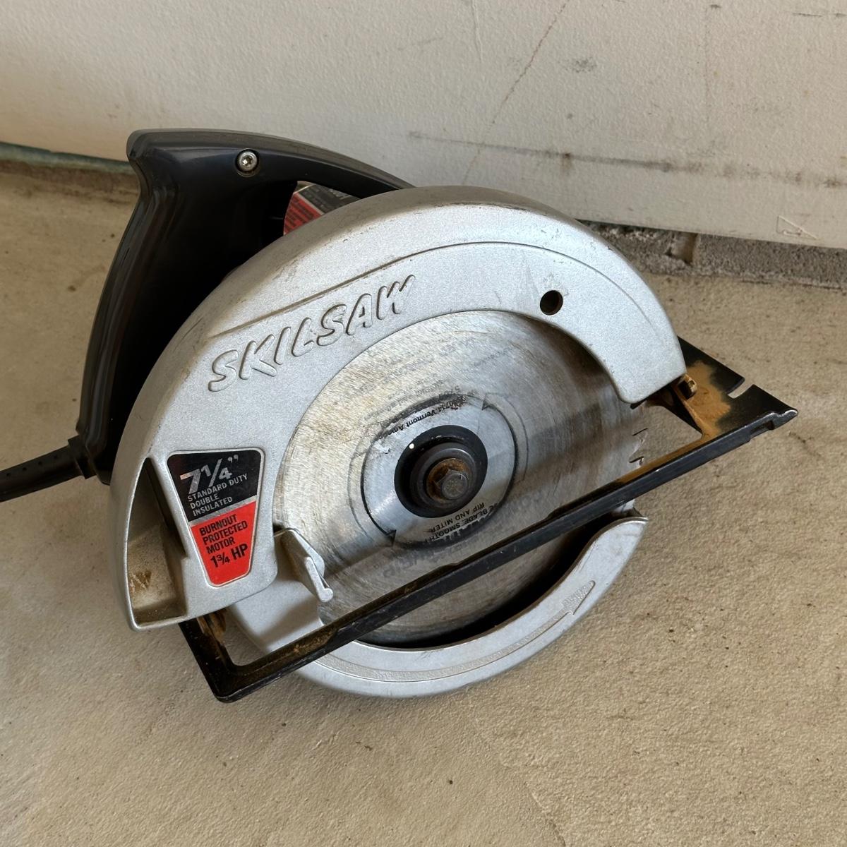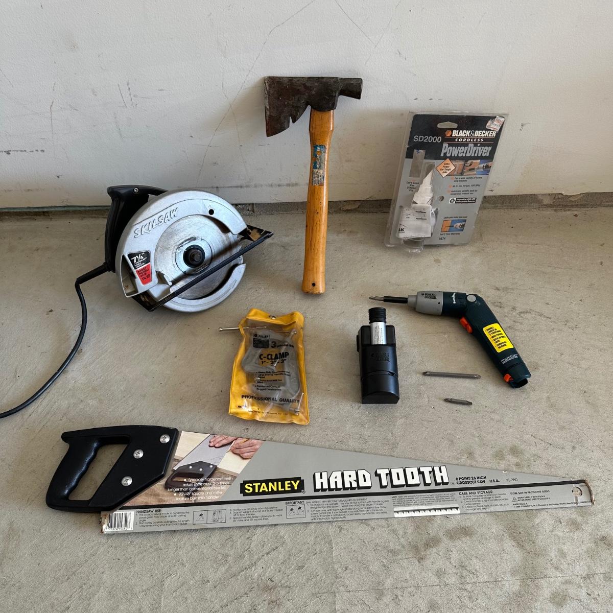 LOT 9G: Stanley Hard Tooth Saw, Skilsaw Circular Saw, Black & Decker Power Driver & More Tools