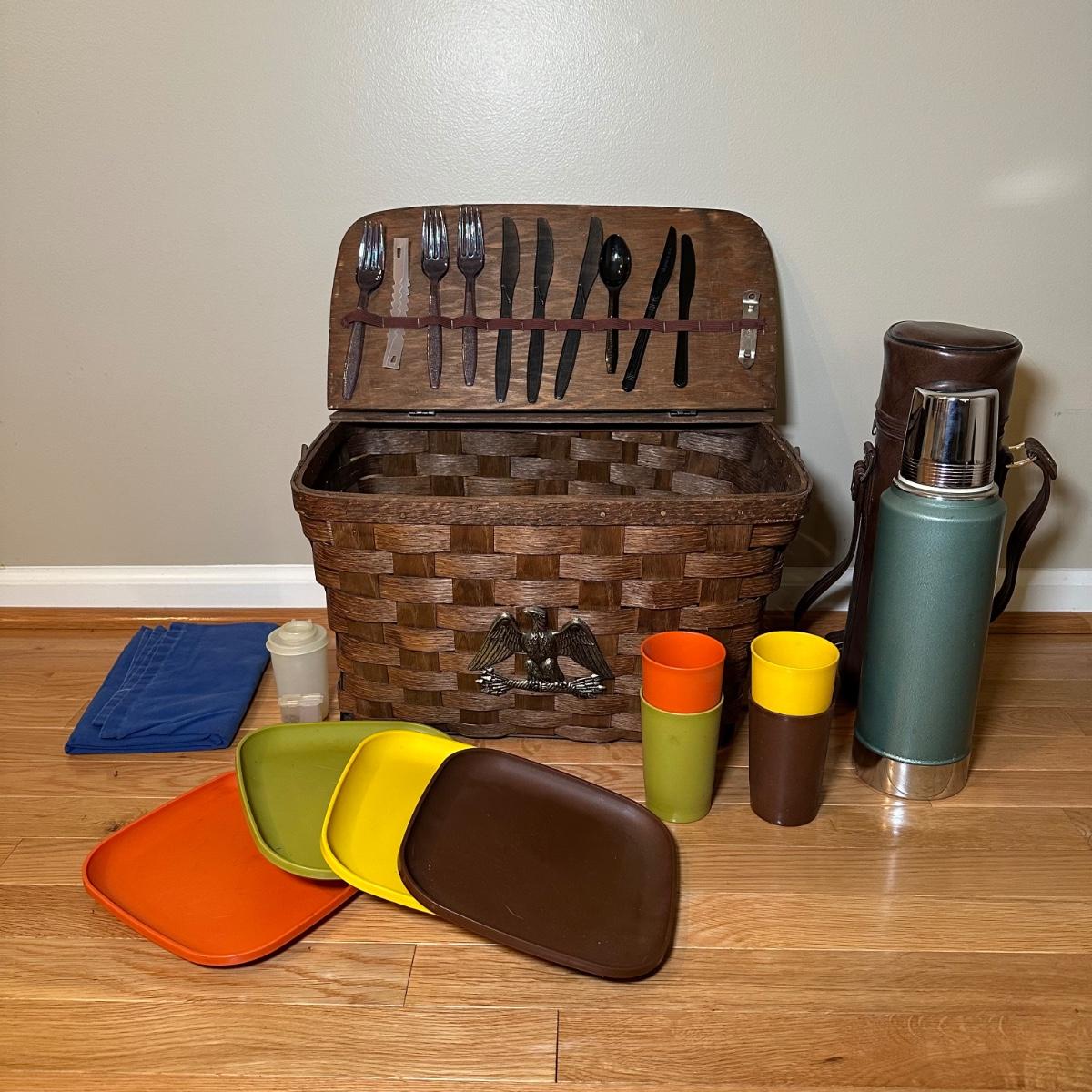 LOT 17K: Vintage Picnic Basket & More! Stanley Thermos w/ Carrying Case, Tupperware & More!