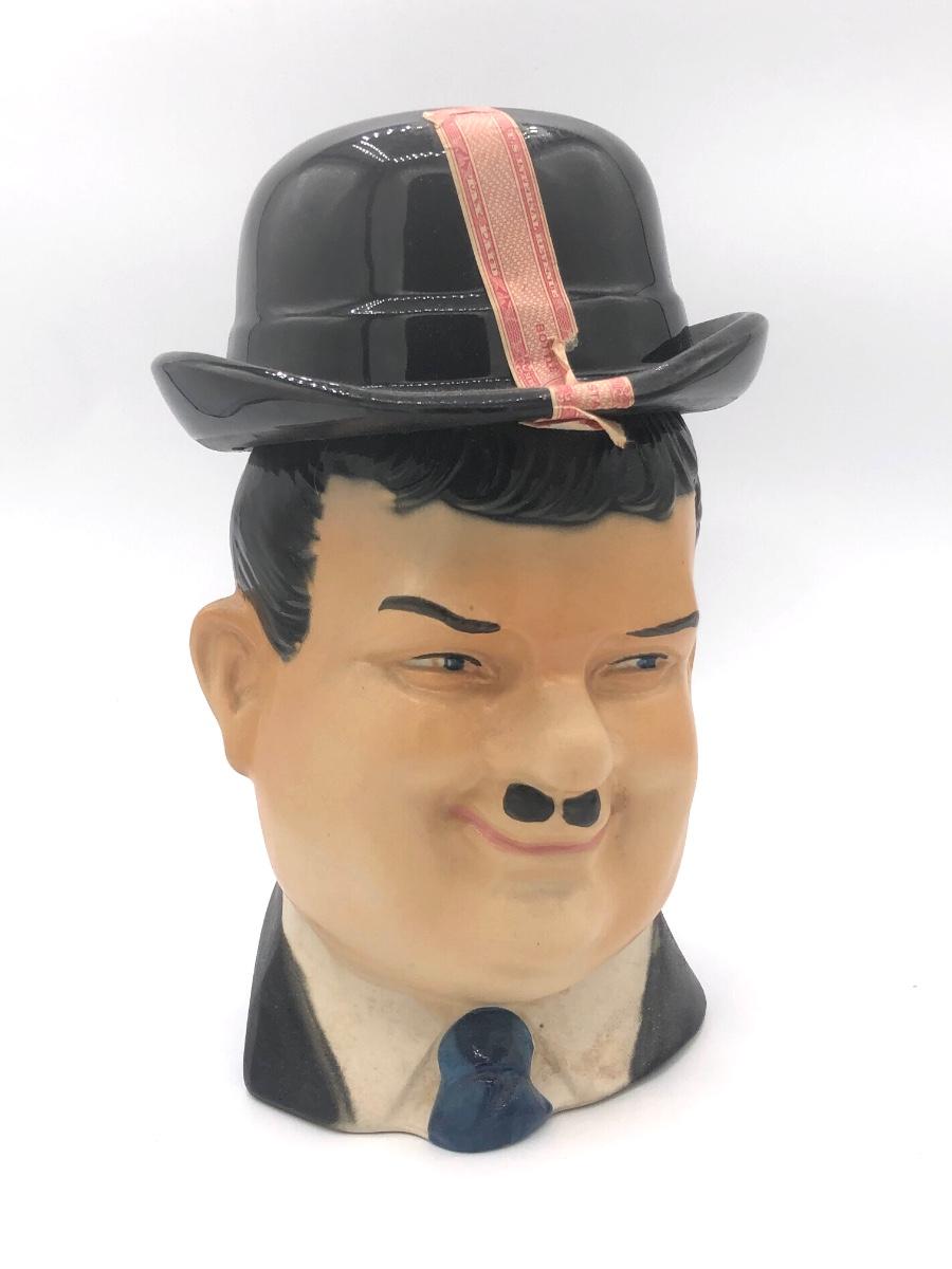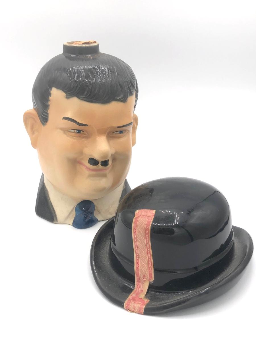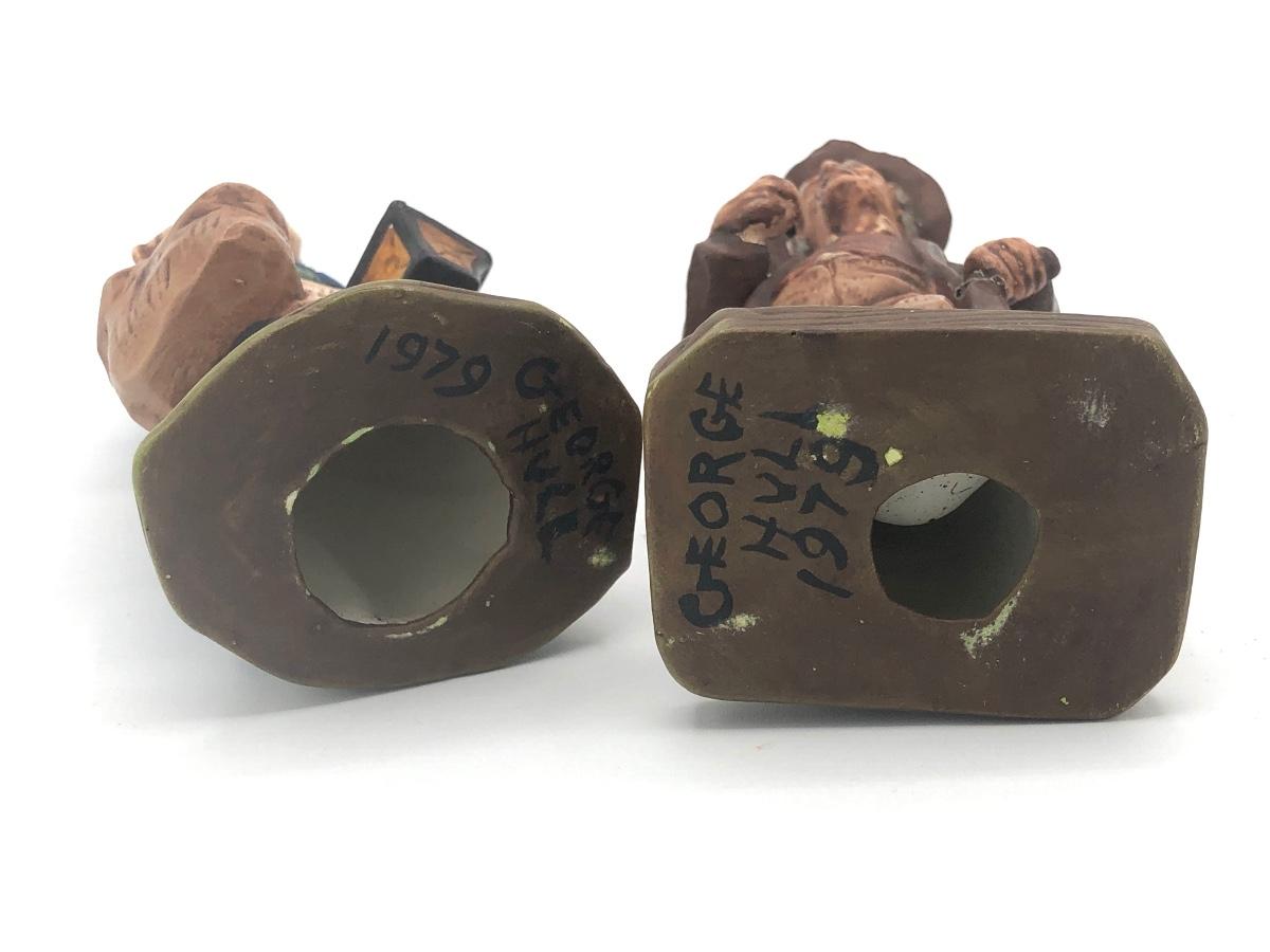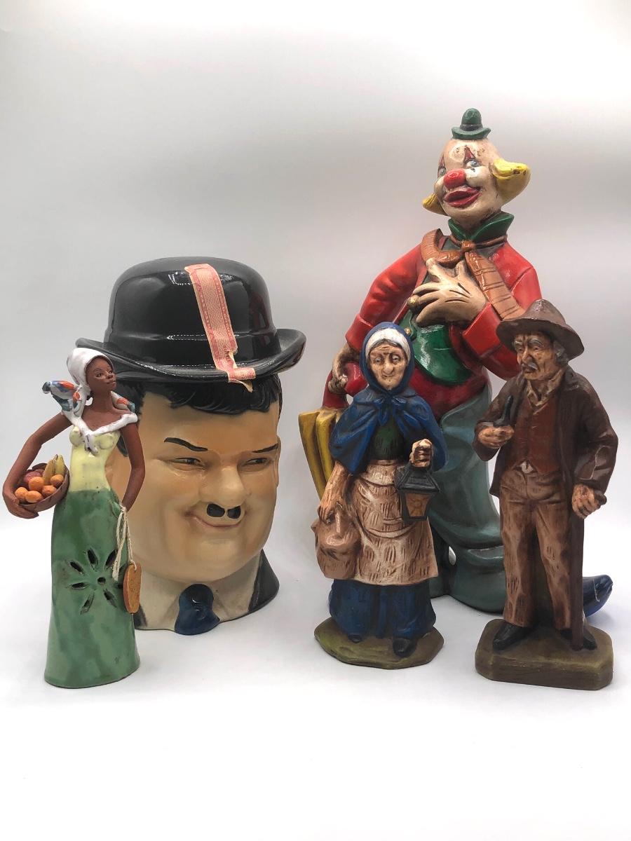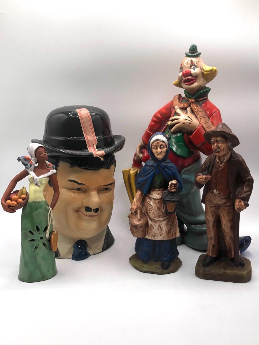 LOT 31L: Vintage 1976 Ezra Brooks Oliver Hardy Whiskey Decanter, Vintage Atlantic Mold Ceramic Circus Clown Figure, 1979 Signed George Hull Villager Figurines & Jamaican Clay Woman Figure