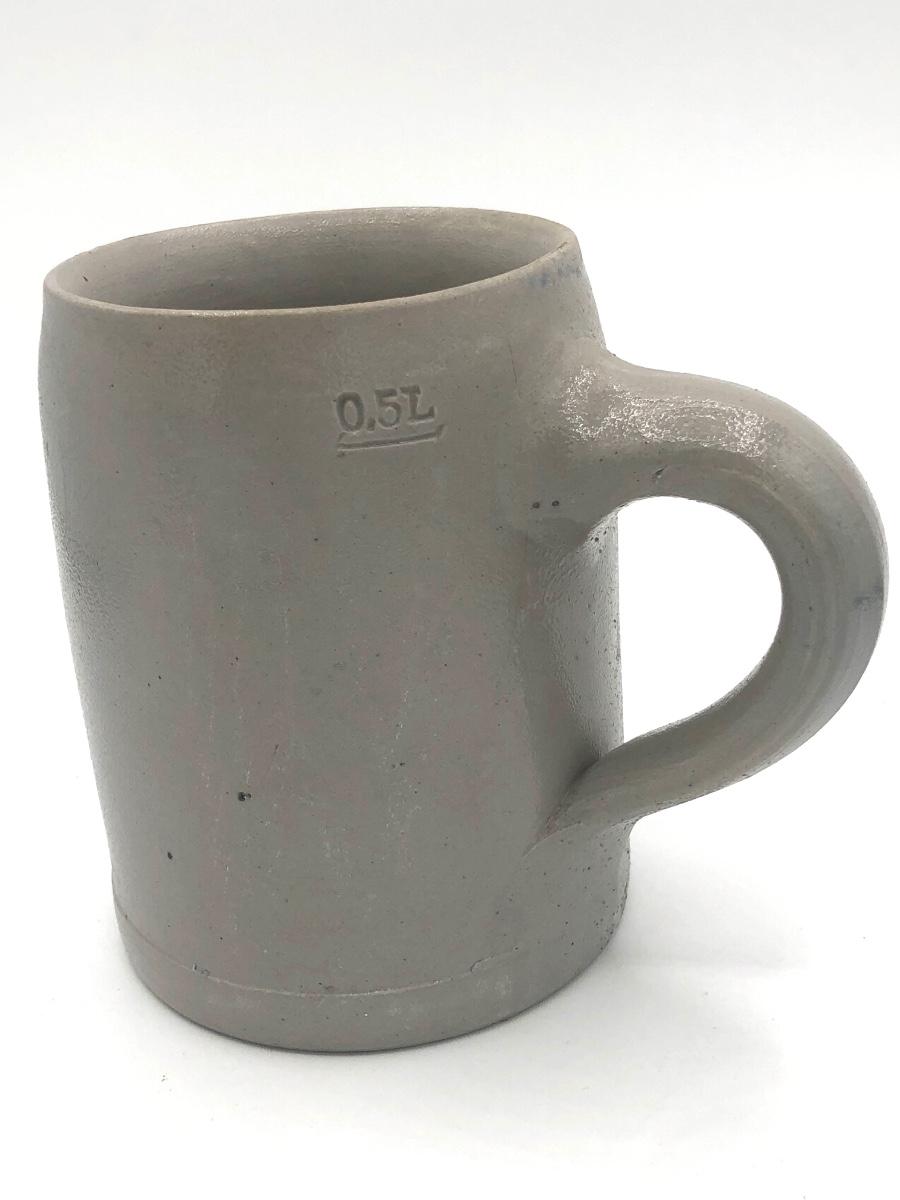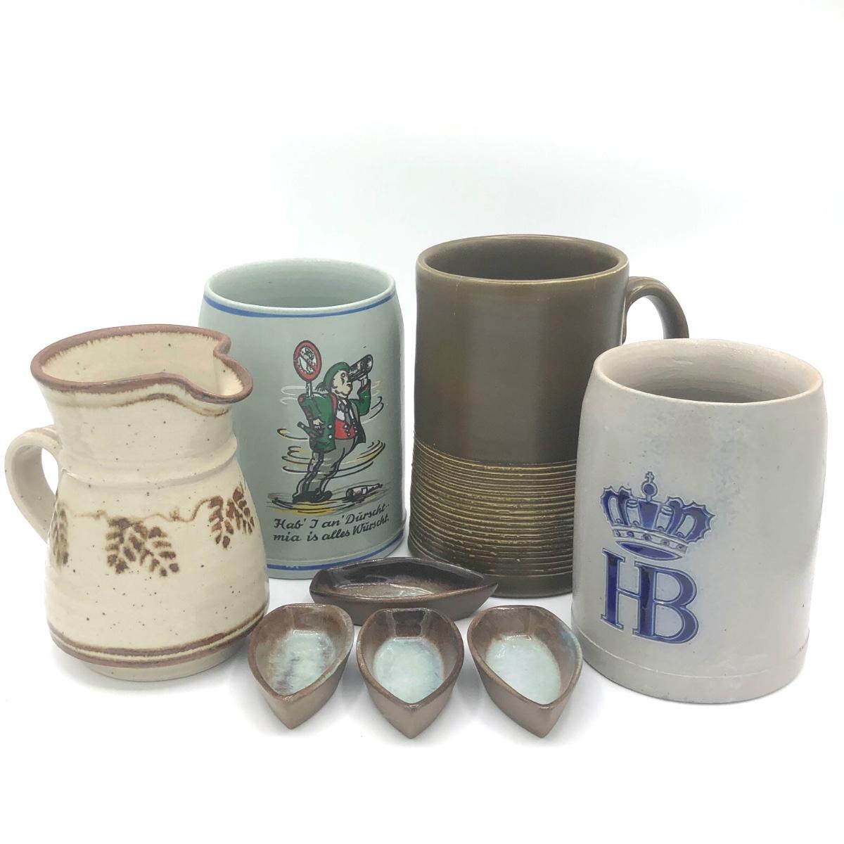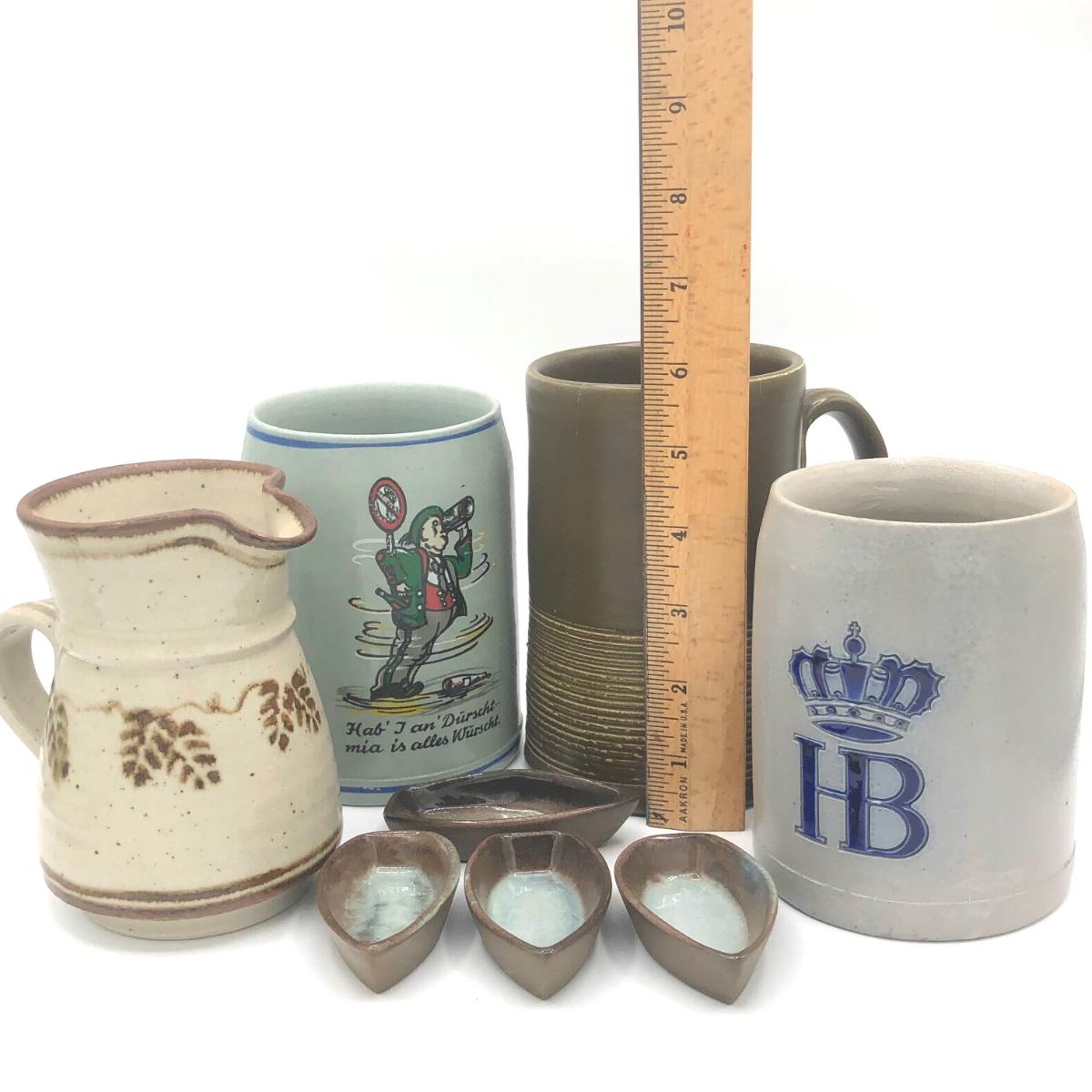 LOT 34L: Stoneware Mugs & More - Signed Salt Dishes, Signed Pitcher, 0.5L Steins