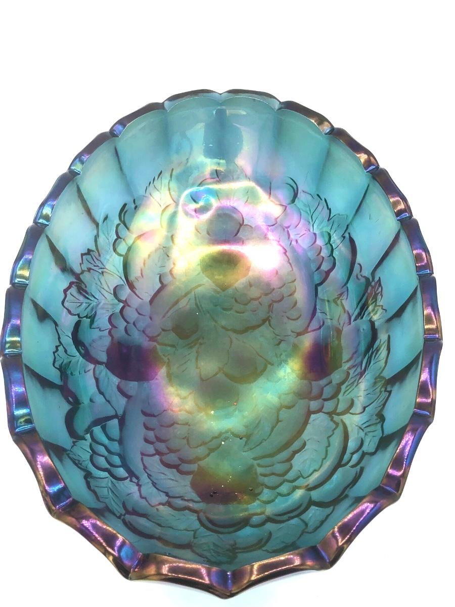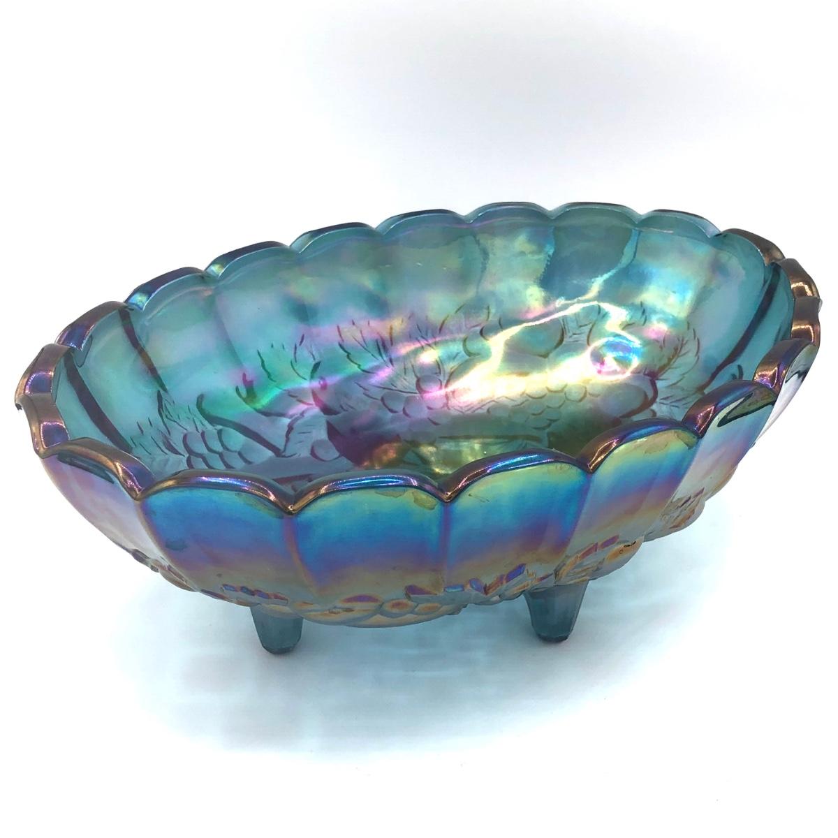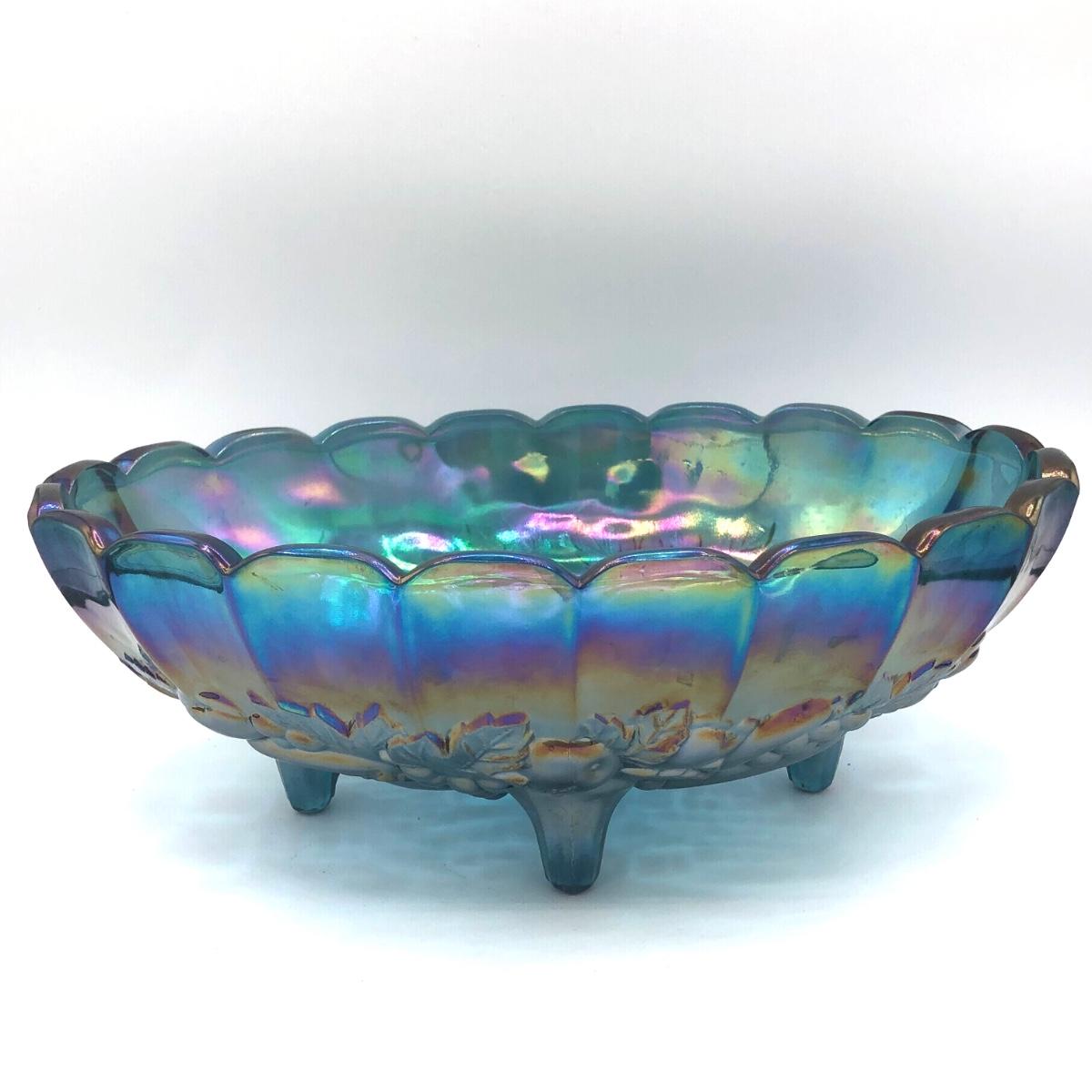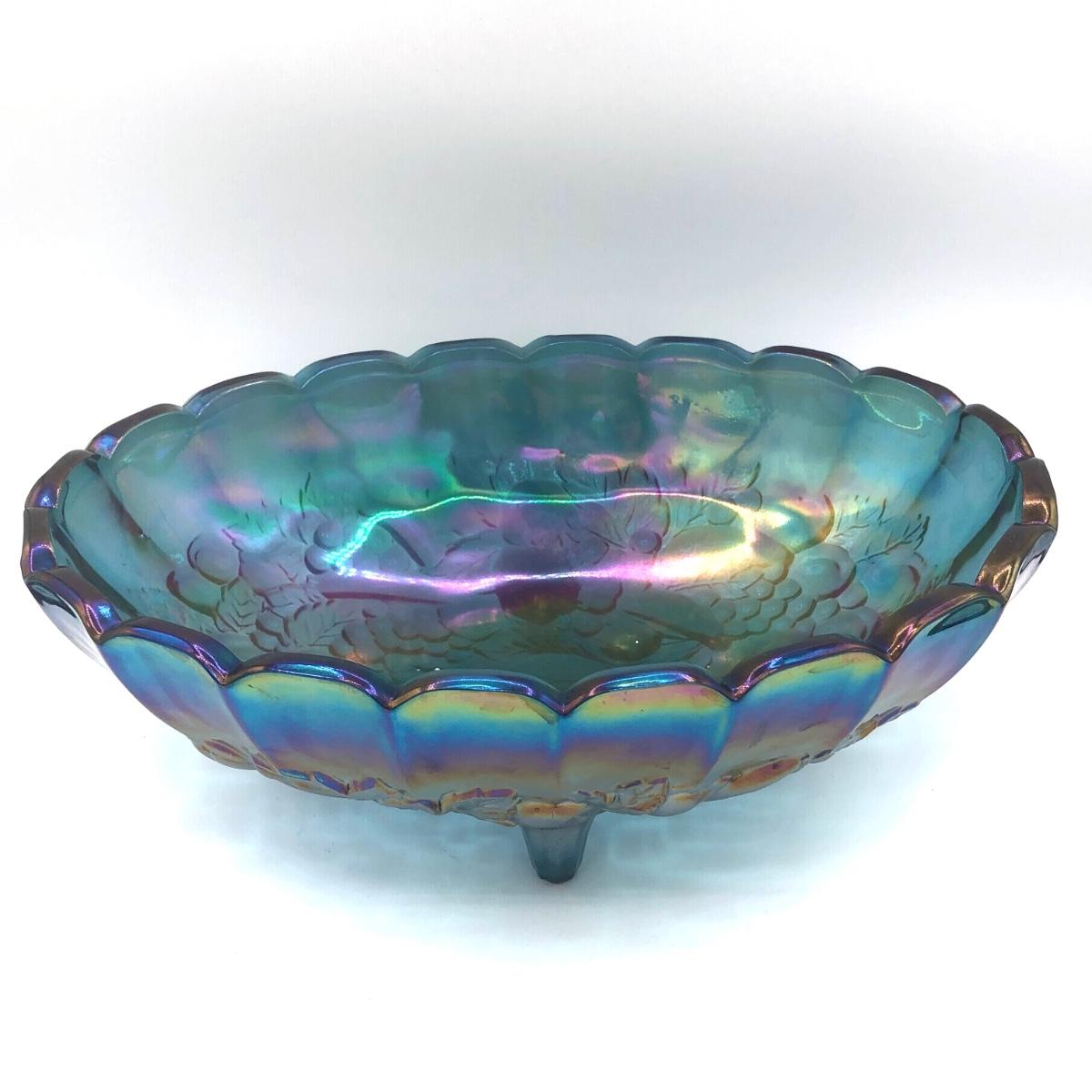 LOT 67K: Vtg. Indiana Glass Harvest Grape Iridescent Blue Carnival Glass Fruit Bowl