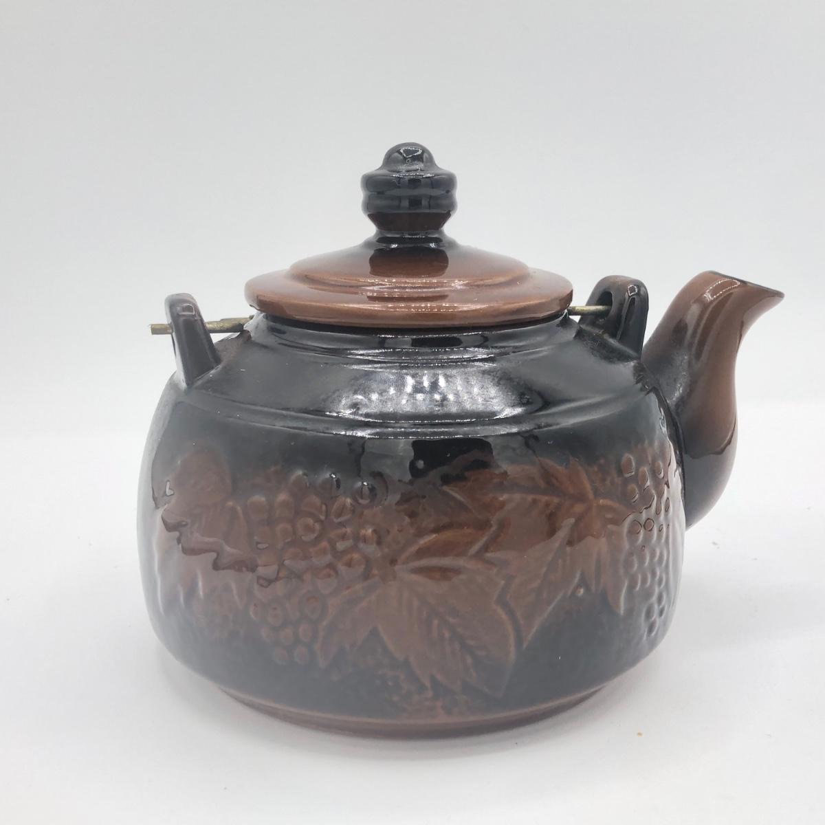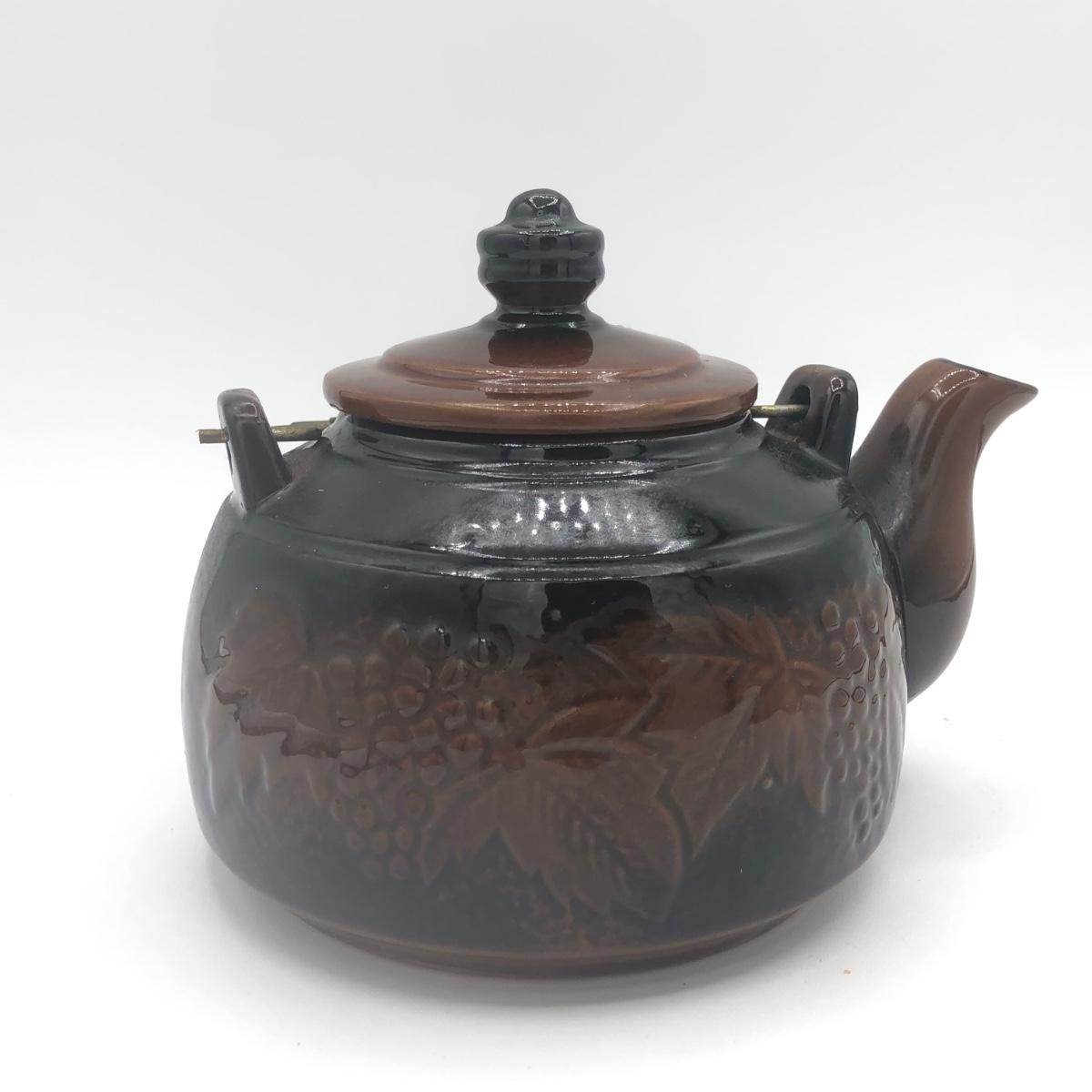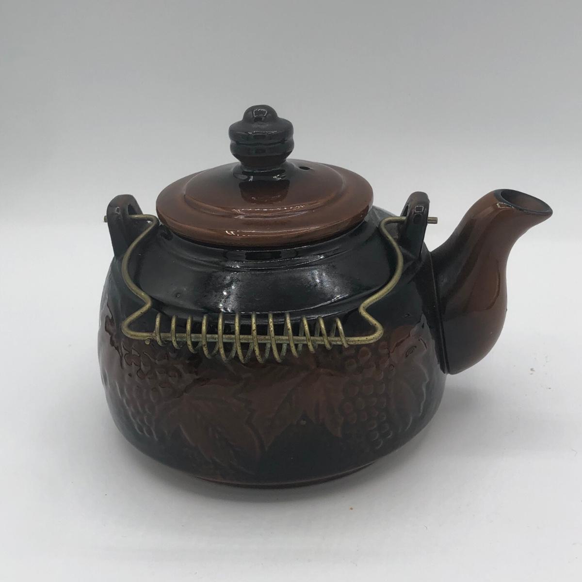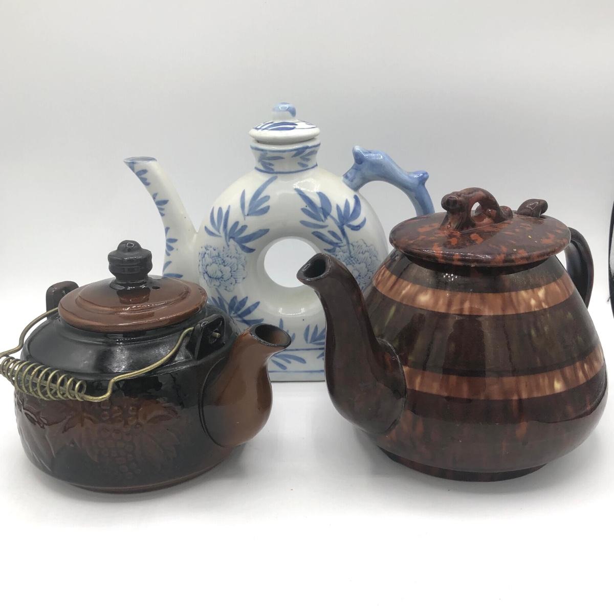 LOT 69K: Vintage Ceramic Teapots - Delft Blue & White Donut Shape, Brown Pottery England, Grape Design w/ Wire Handle