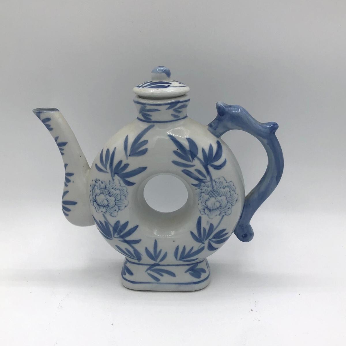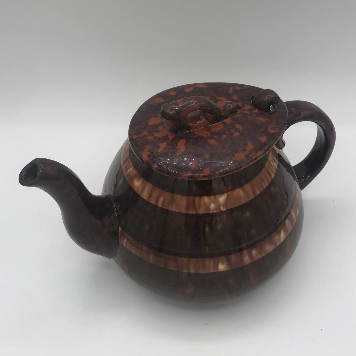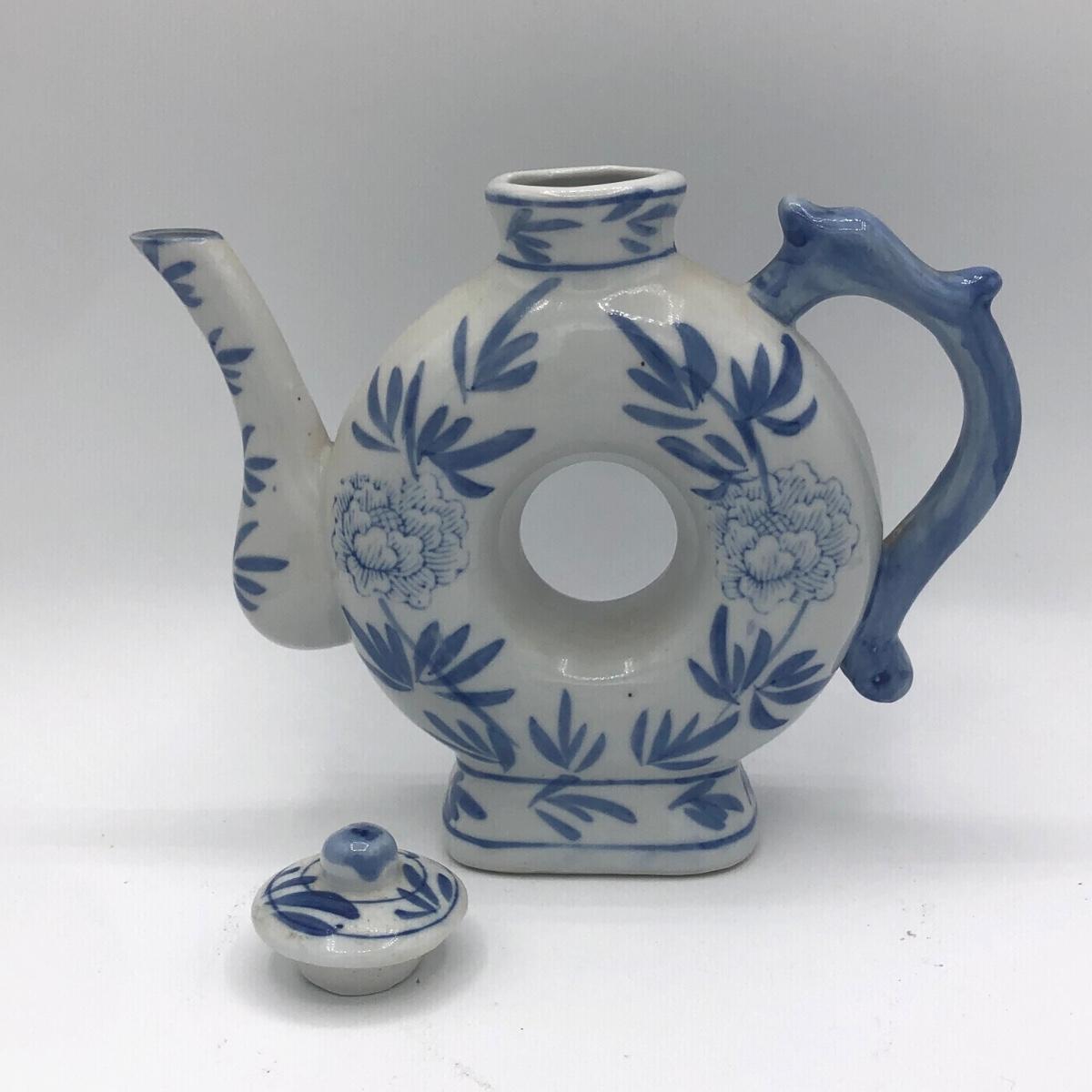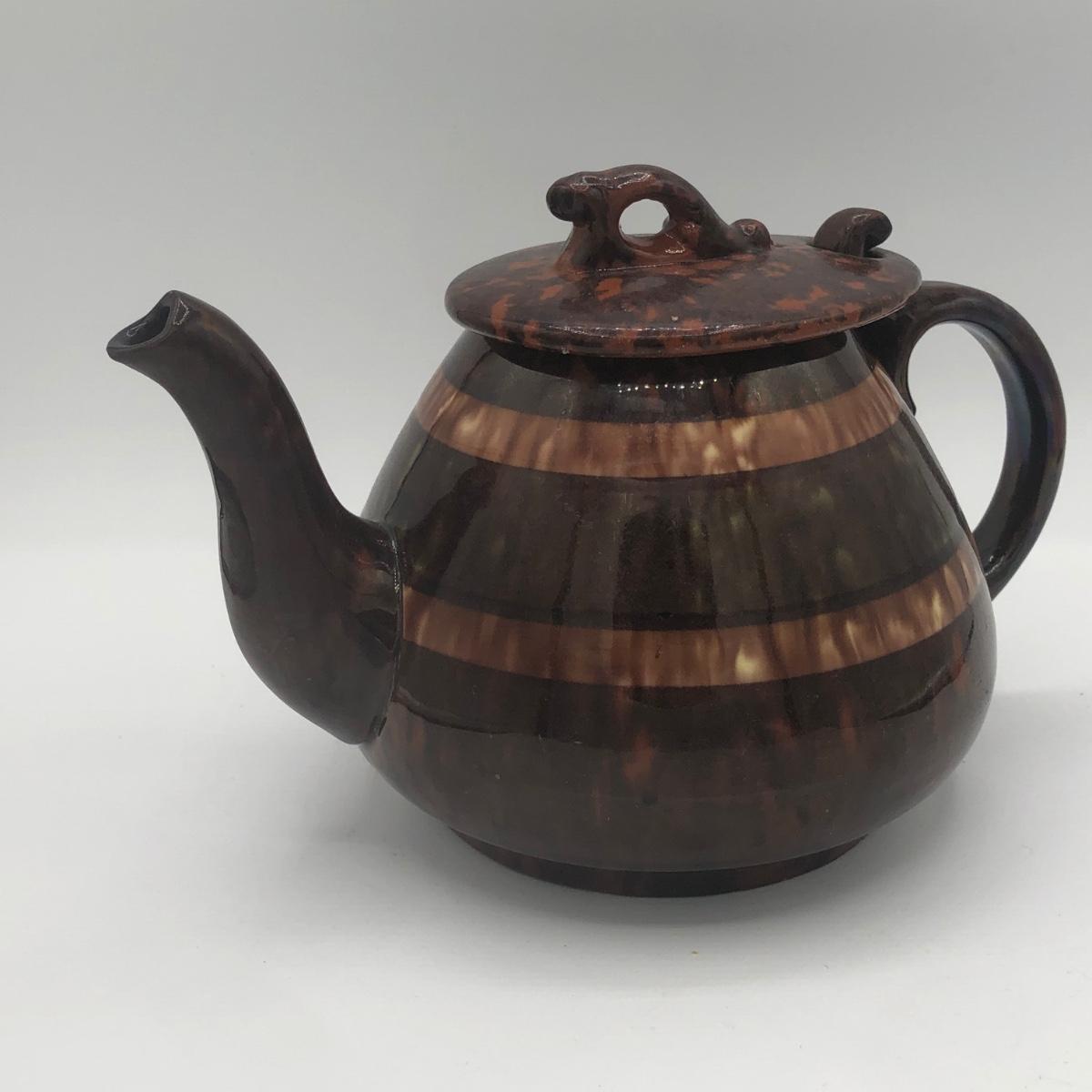 LOT 69K: Vintage Ceramic Teapots - Delft Blue & White Donut Shape, Brown Pottery England, Grape Design w/ Wire Handle
