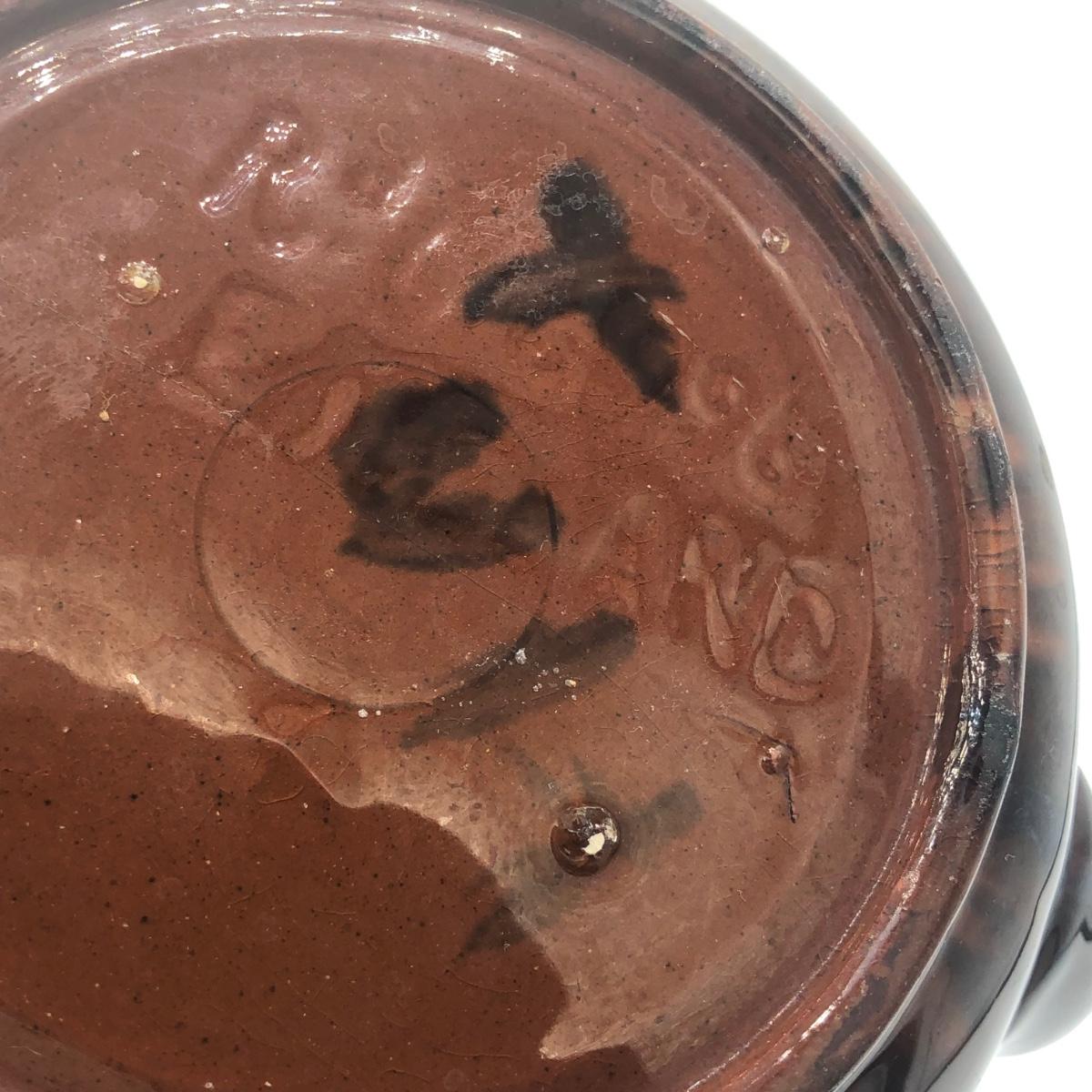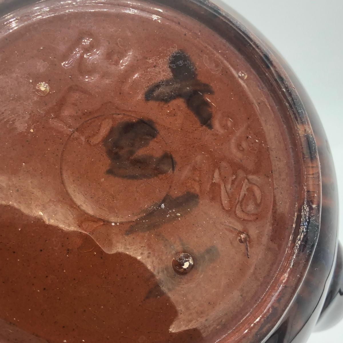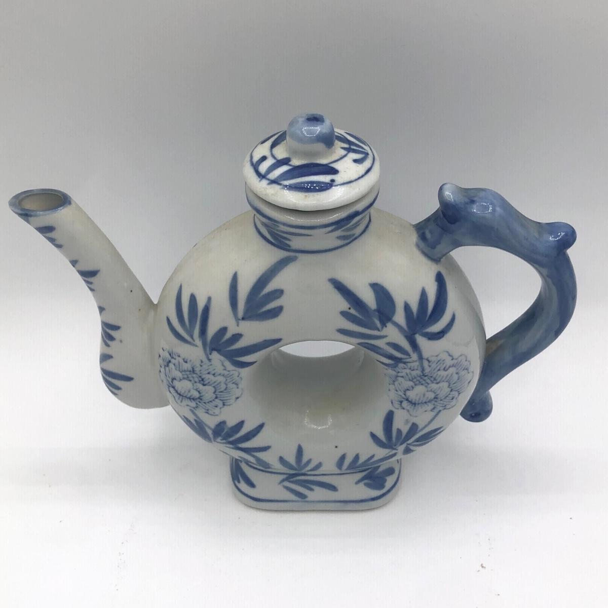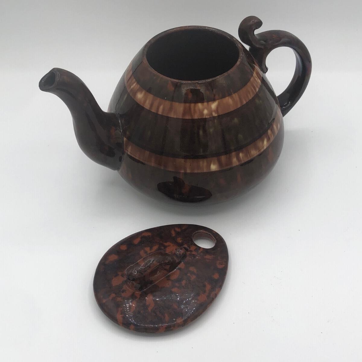 LOT 69K: Vintage Ceramic Teapots - Delft Blue & White Donut Shape, Brown Pottery England, Grape Design w/ Wire Handle