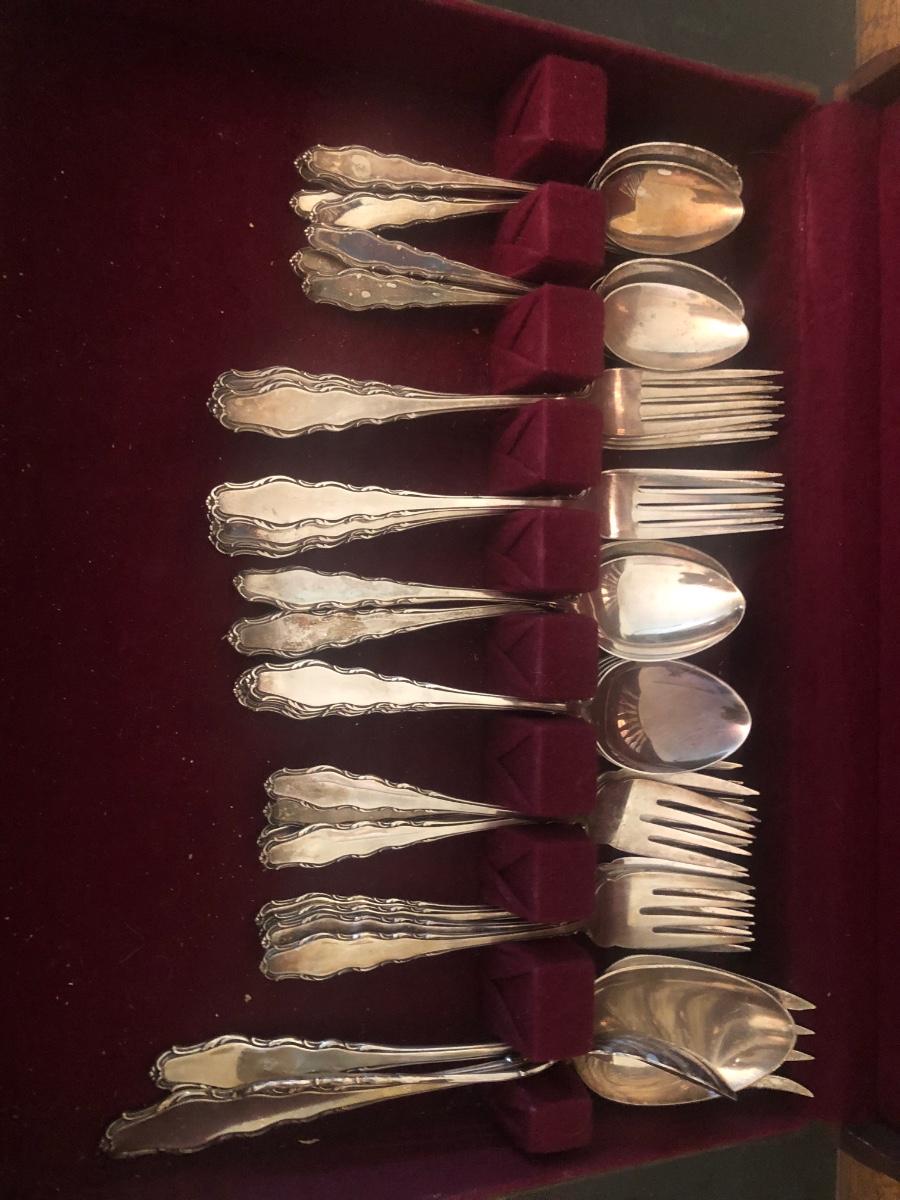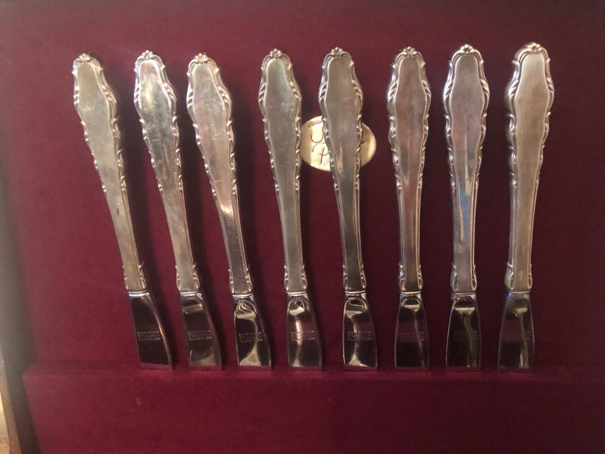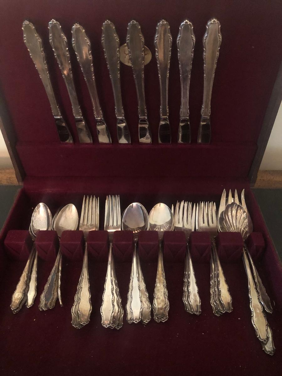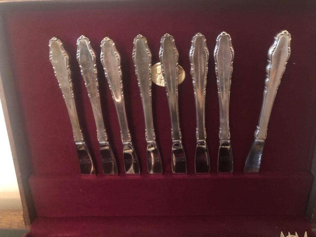 LOT 72L: Vintage Reed & Barton Sterling Silver English Provincial Pattern Silverware Set - 8 Place Settings + Serving Pieces in Tarnish Proof Box (tw: 1,646g)