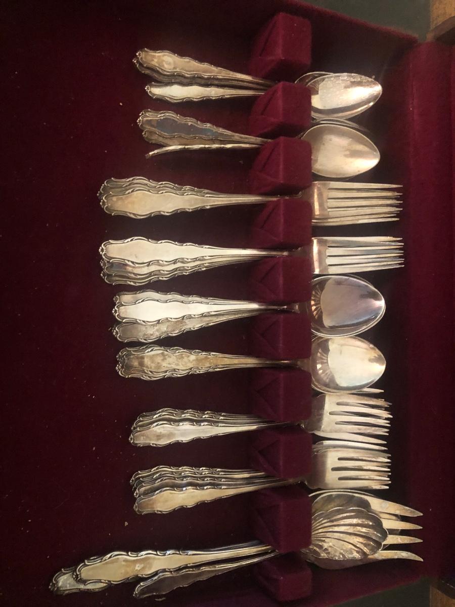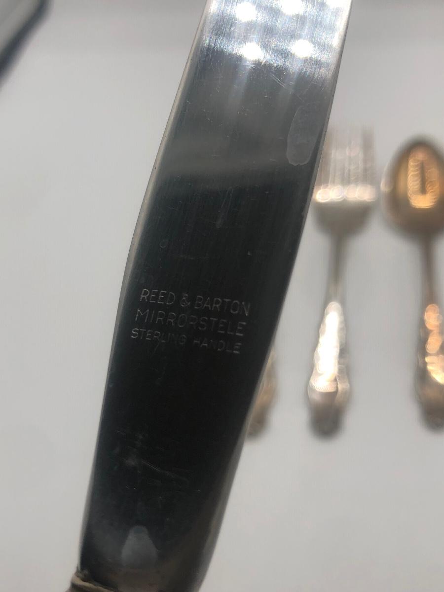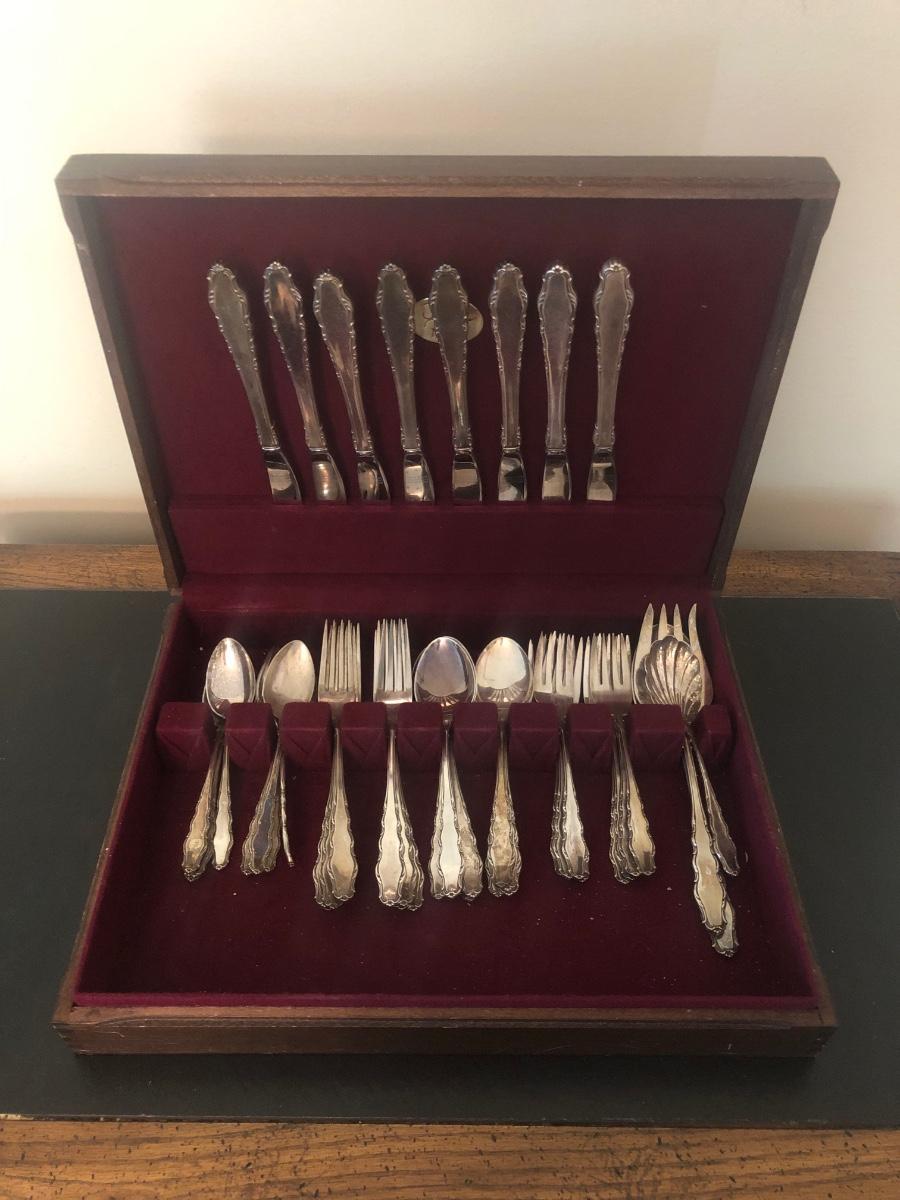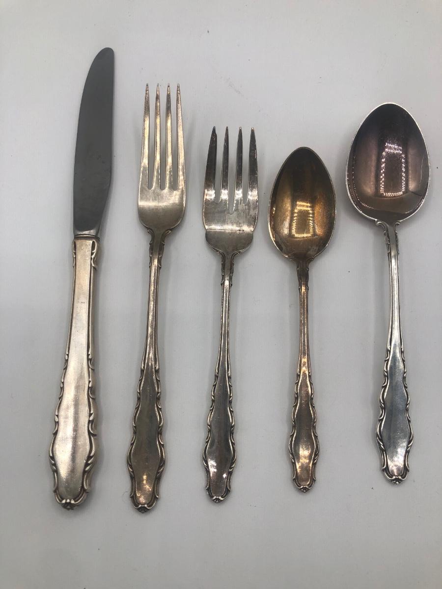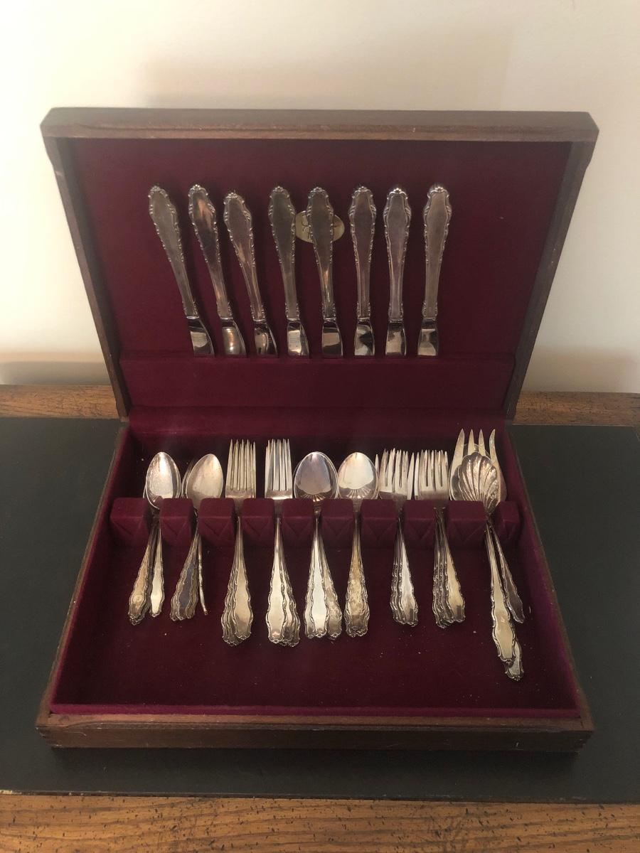 LOT 72L: Vintage Reed & Barton Sterling Silver English Provincial Pattern Silverware Set - 8 Place Settings + Serving Pieces in Tarnish Proof Box (tw: 1,646g)