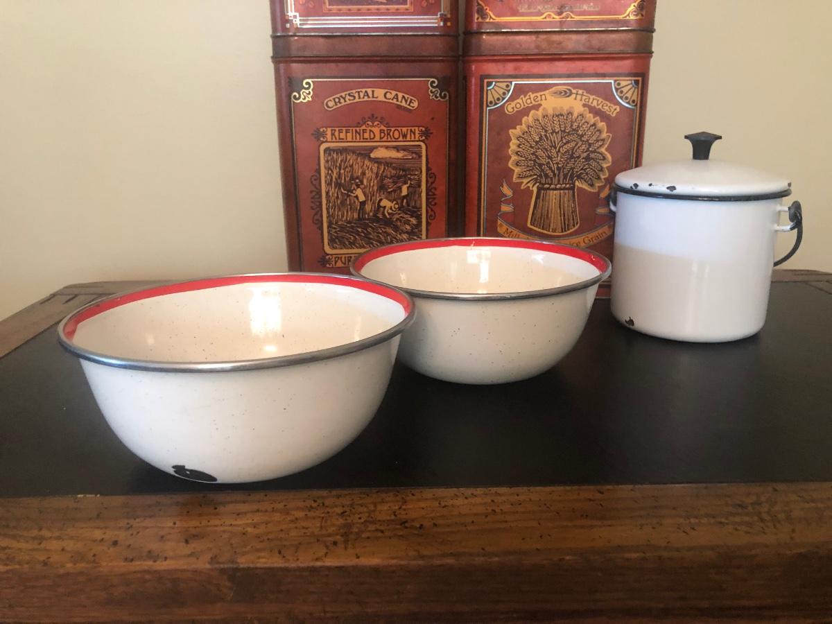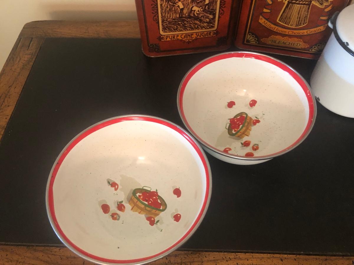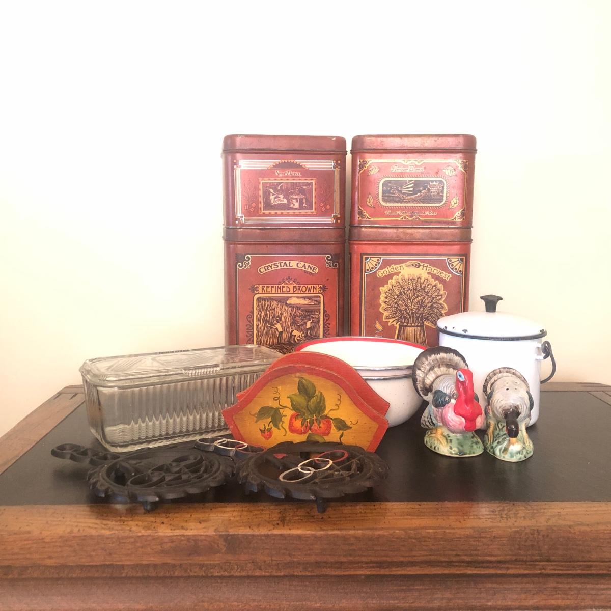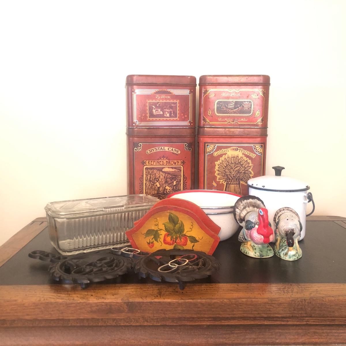 LOT 73K: Vintage Kitchen - Glass Refrigerator Dish, Tea Tins, Trivets, Enamel Apple Bowls & More