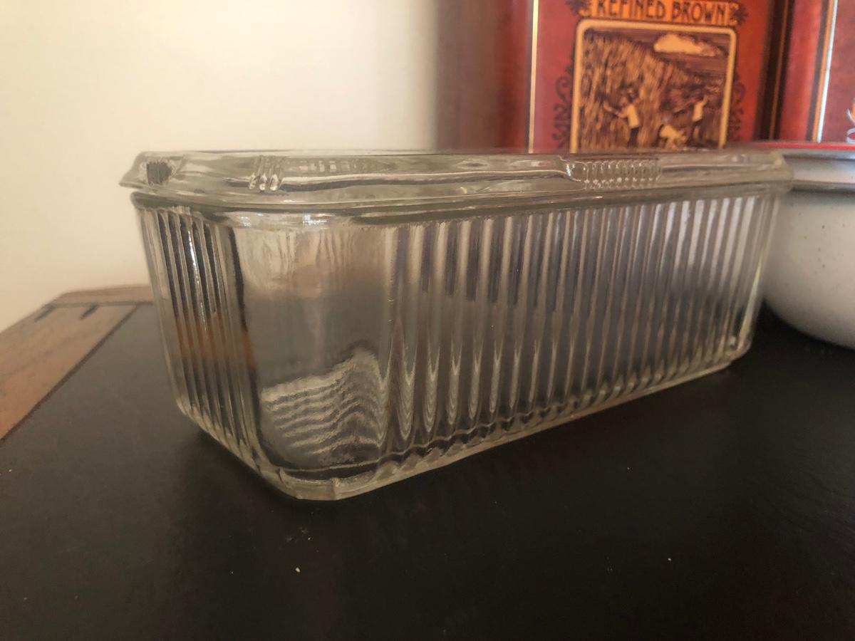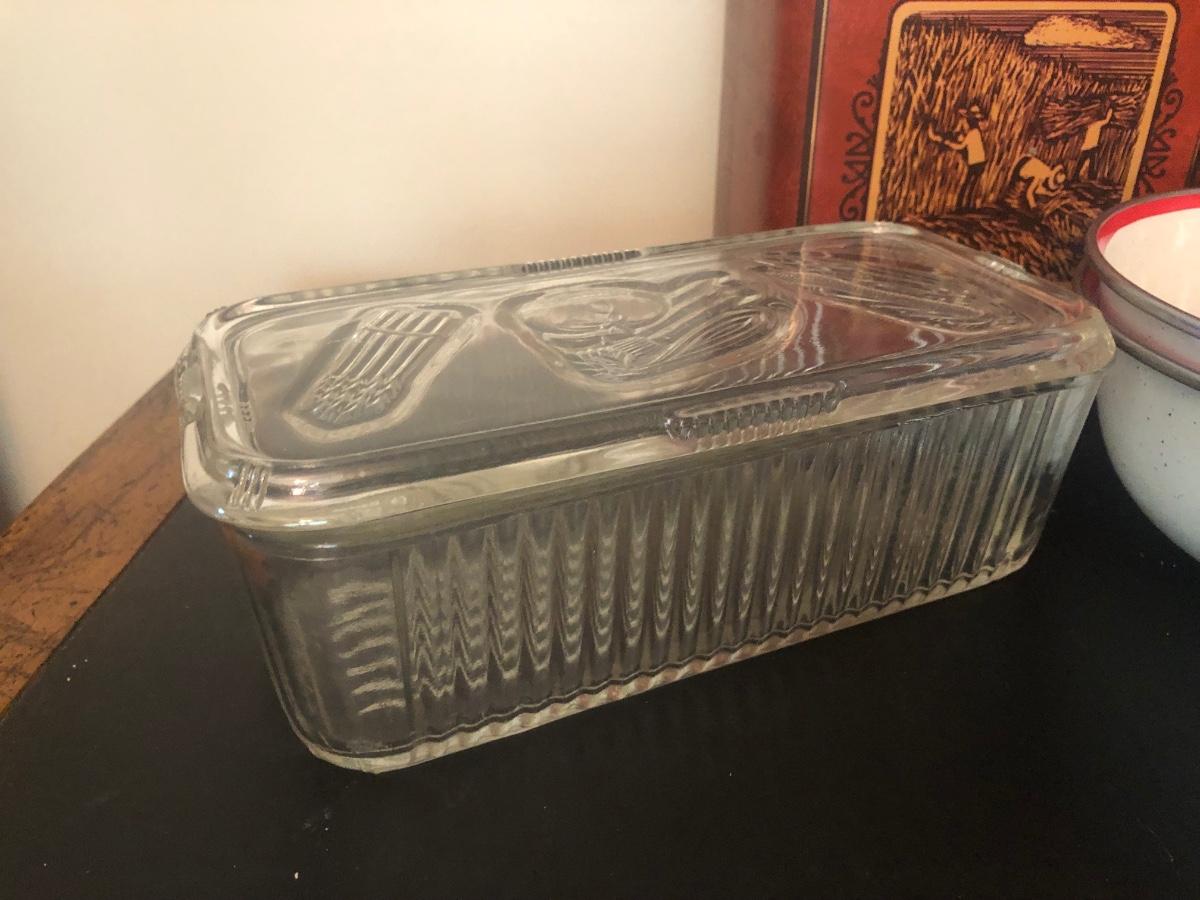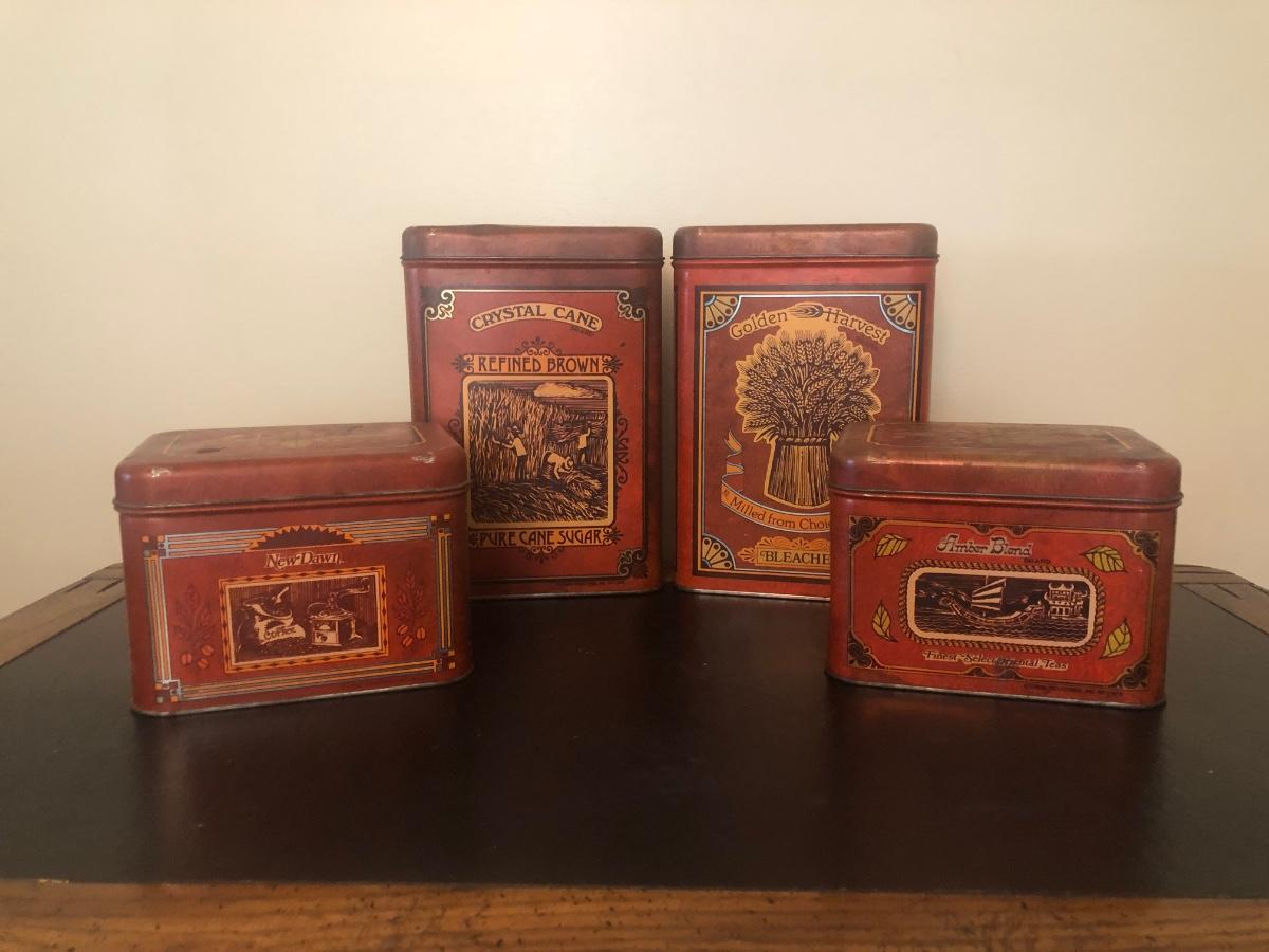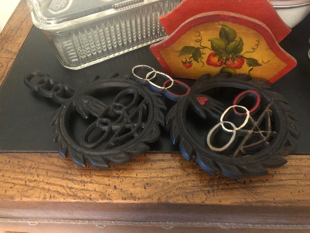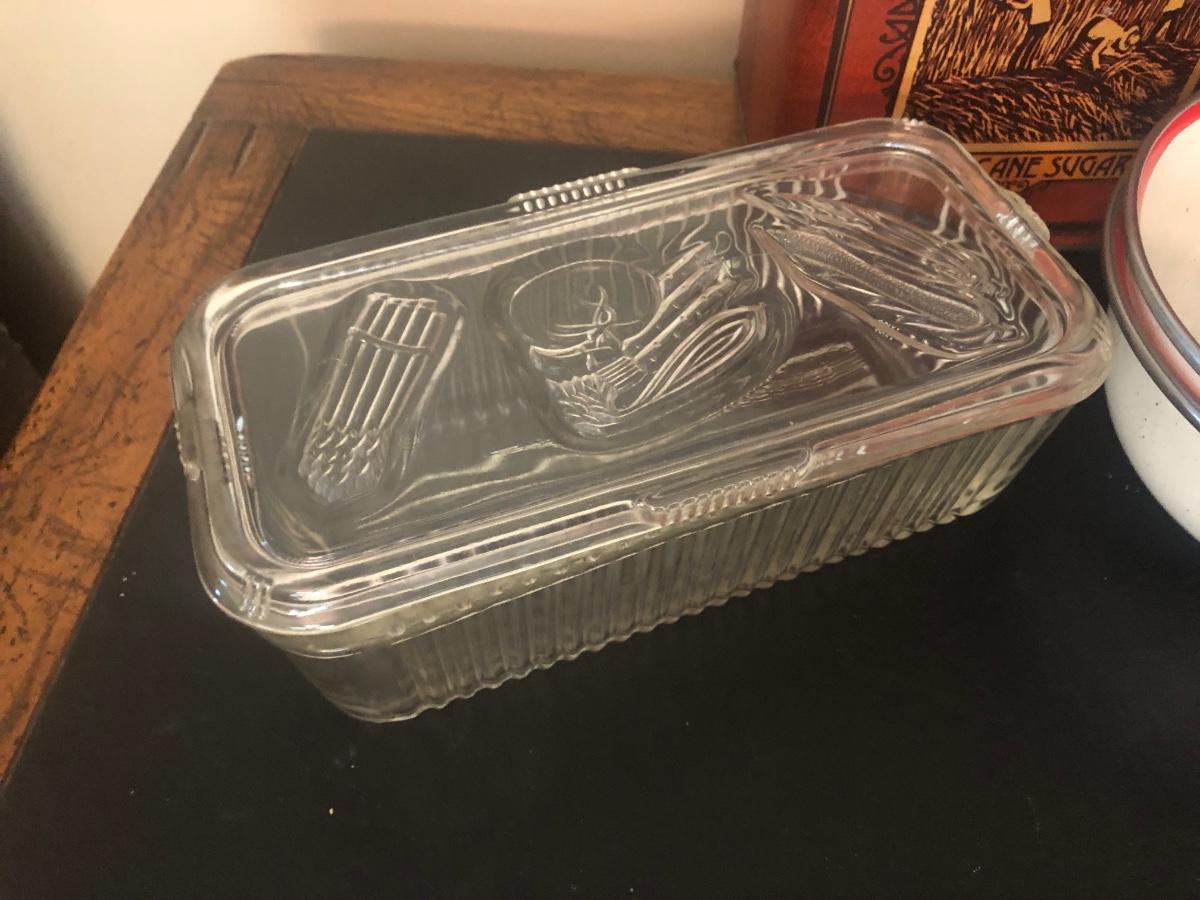 LOT 73K: Vintage Kitchen - Glass Refrigerator Dish, Tea Tins, Trivets, Enamel Apple Bowls & More