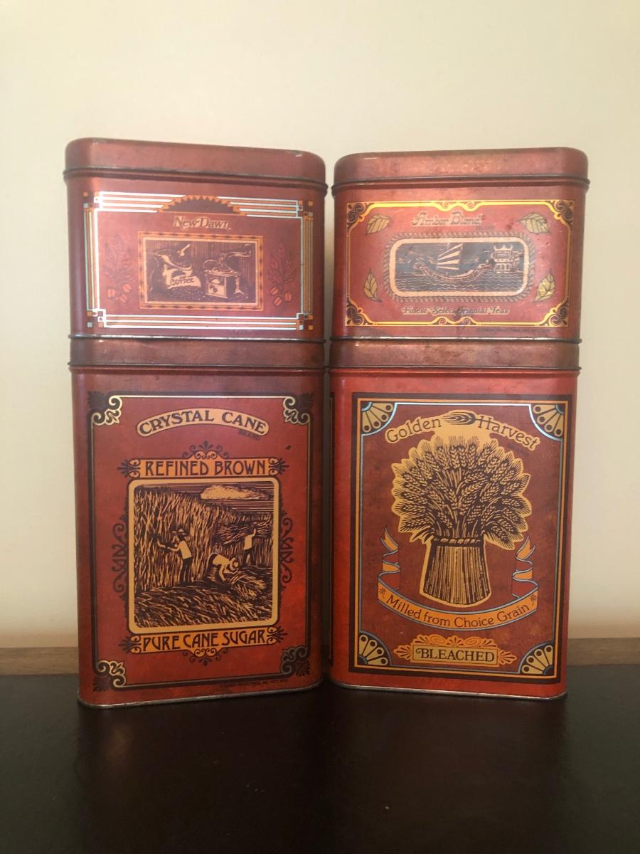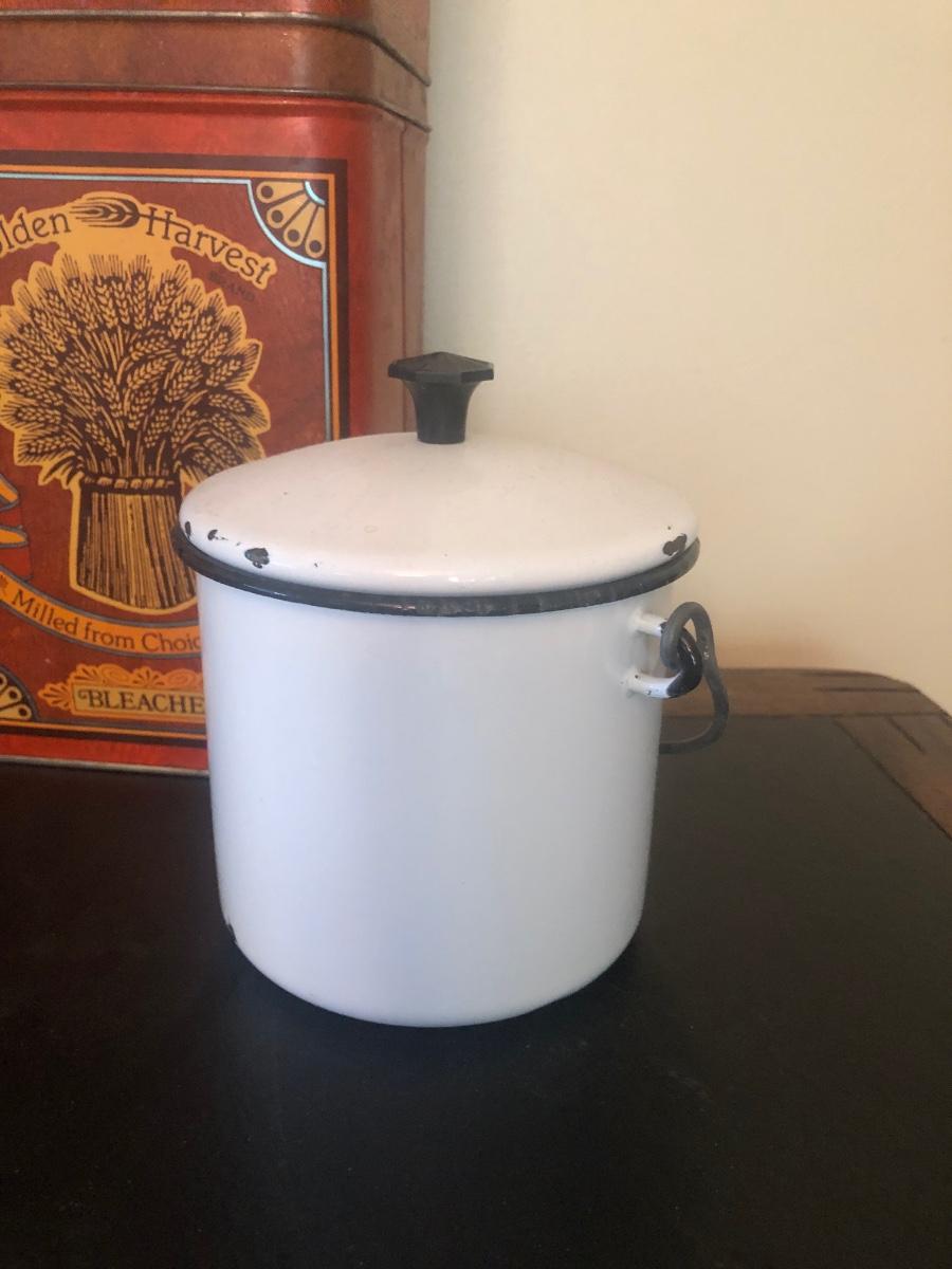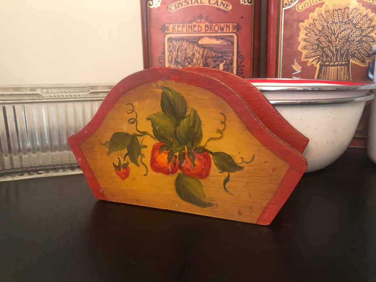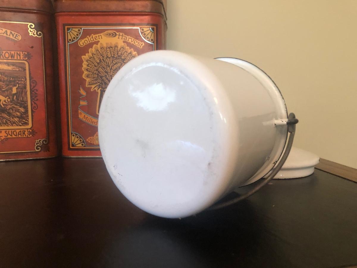 LOT 73K: Vintage Kitchen - Glass Refrigerator Dish, Tea Tins, Trivets, Enamel Apple Bowls & More