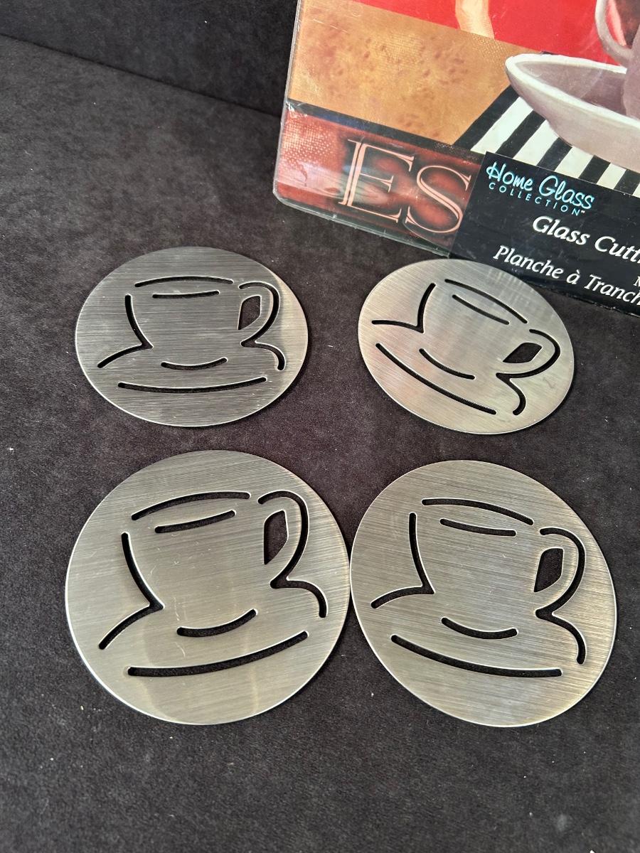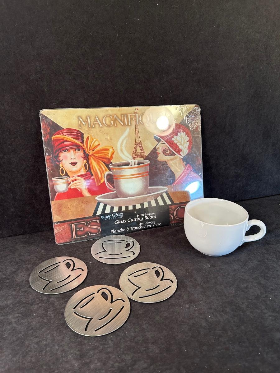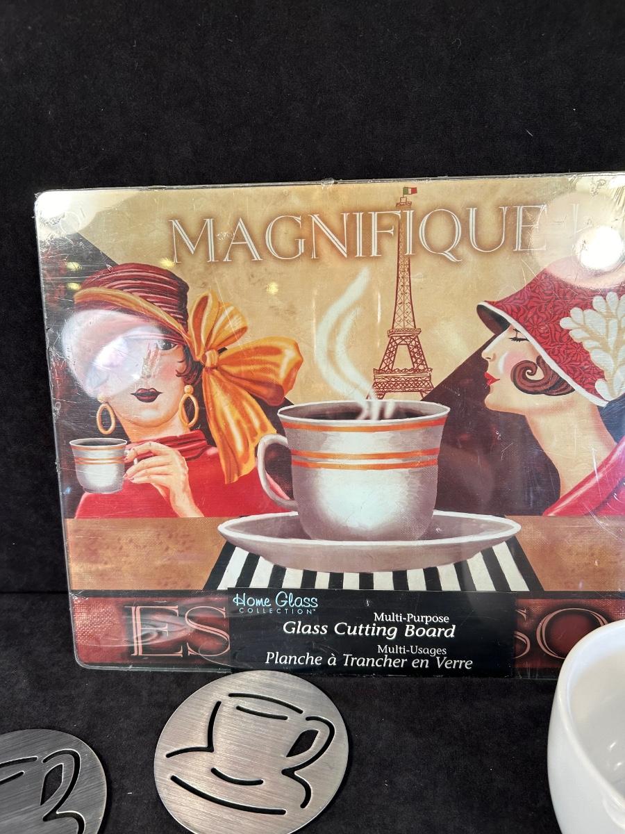 Printed glass cutting board, 4 brushed stainless coasters and an oversized latte mug