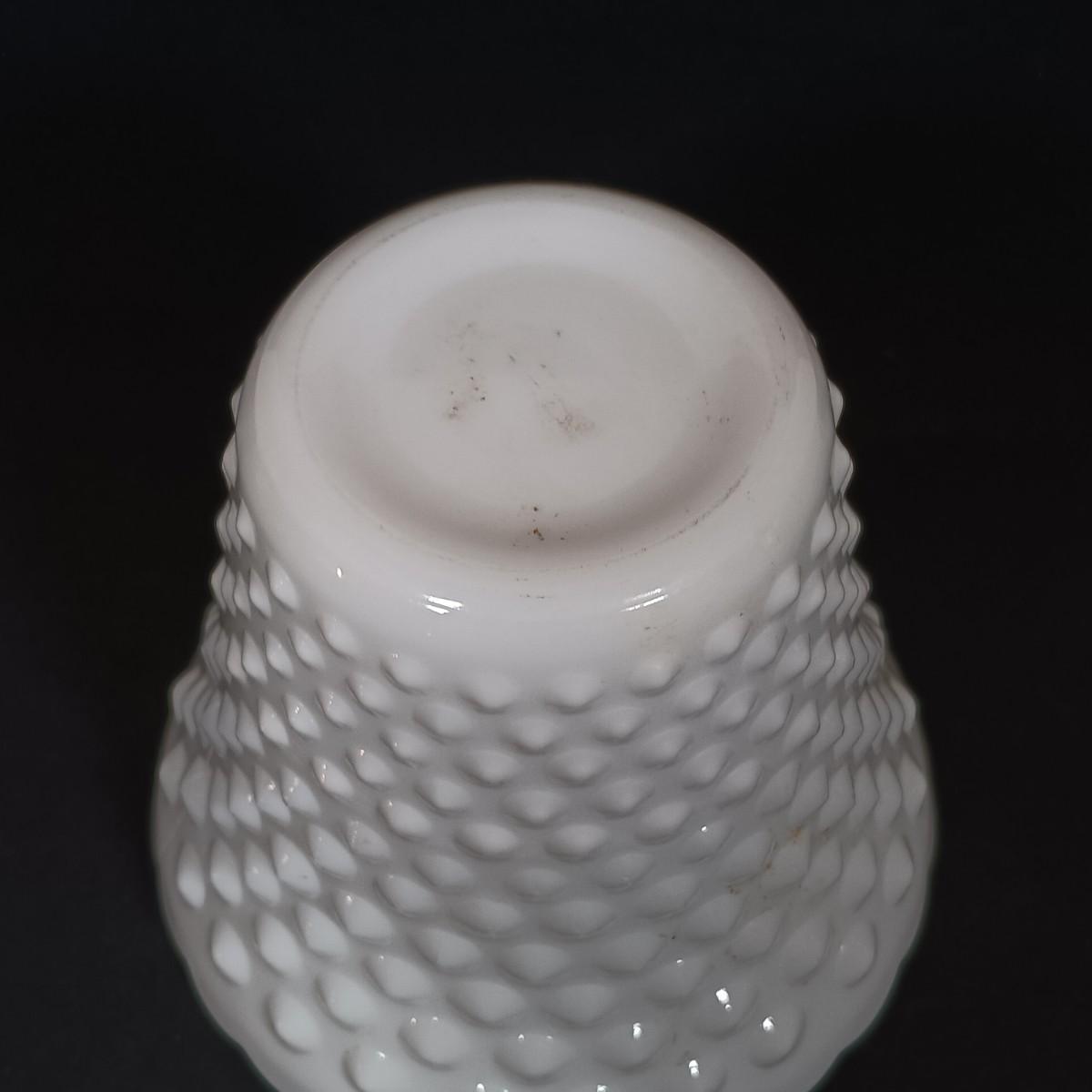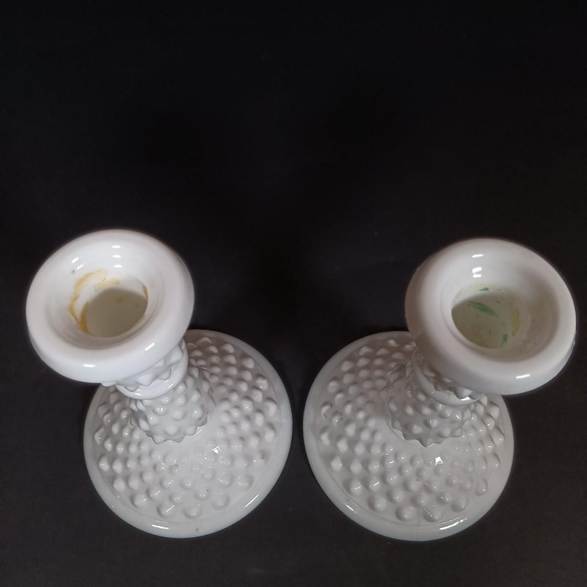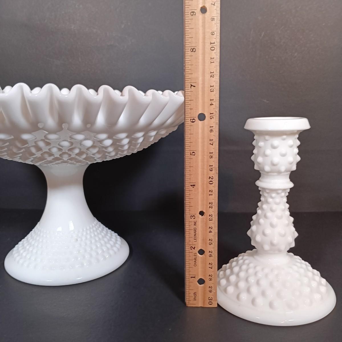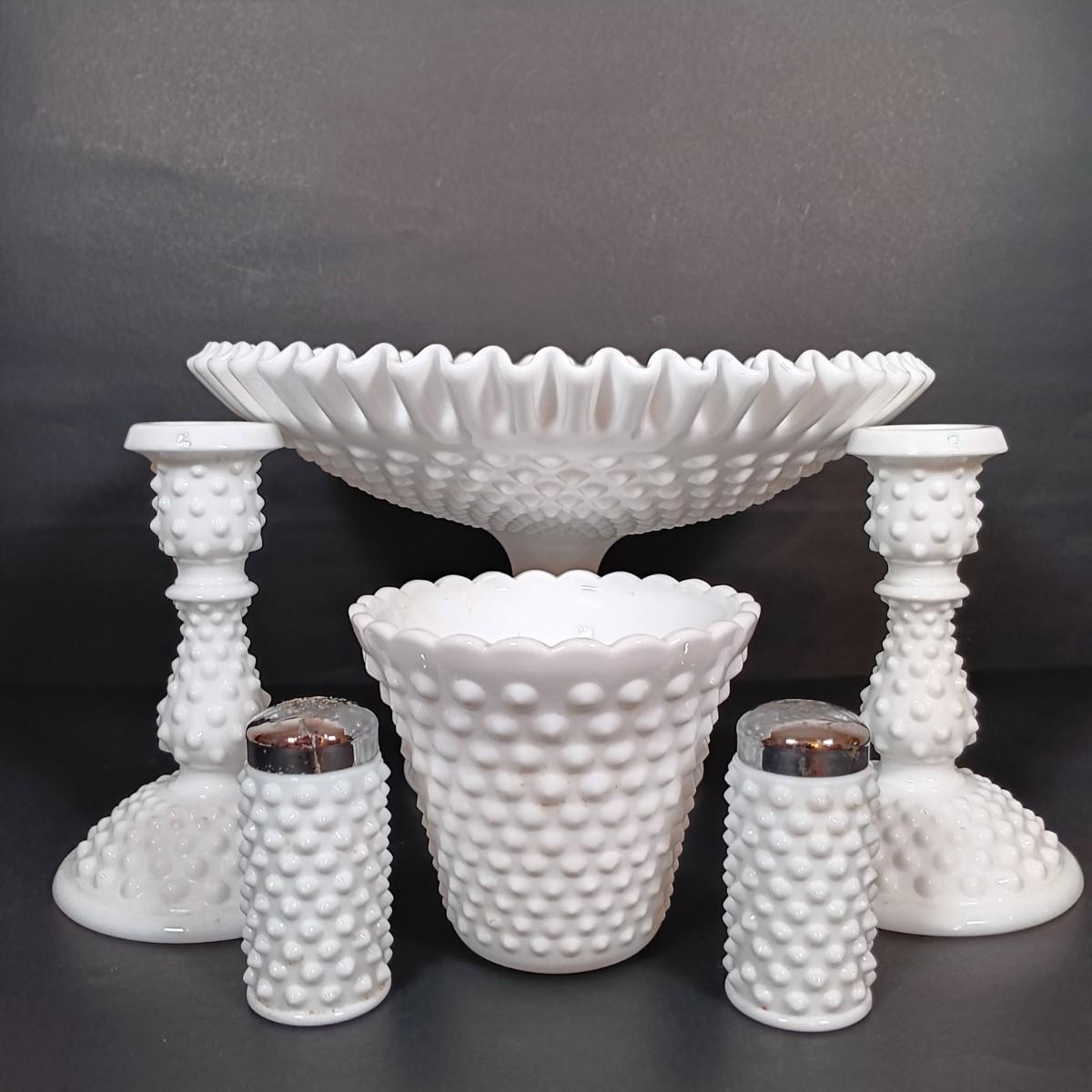 LOT 24: Vintage Milk Glass- Marked Fenton Hobnail Salt and Pepper Shakers and Unmarked Fenton Hobnail Pedestal Fruit Bowl, Candlestick Holders & Planter/Cachepot