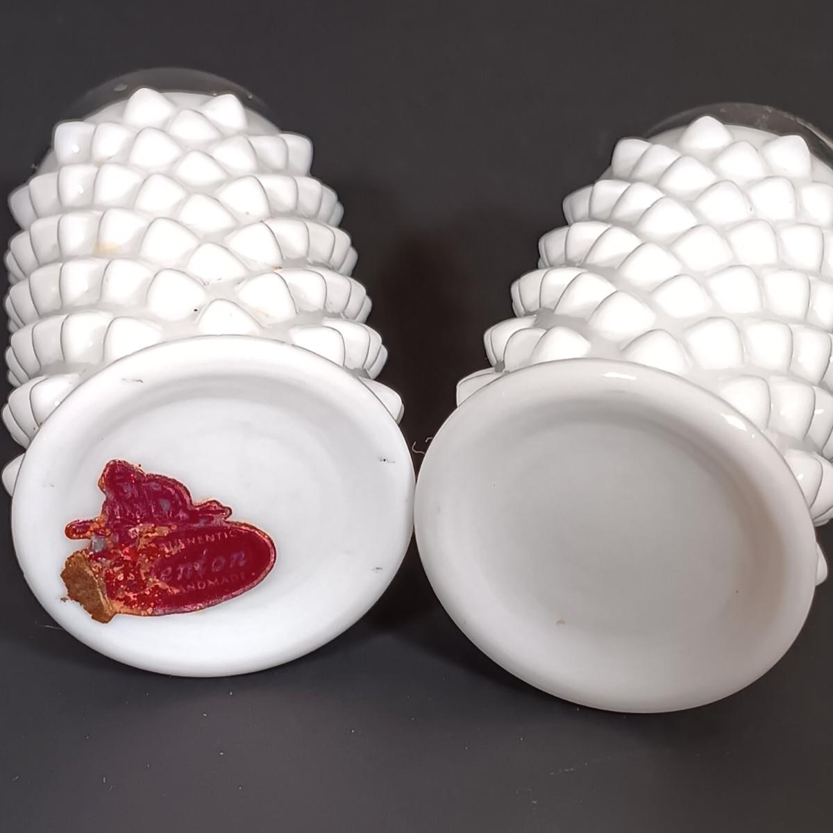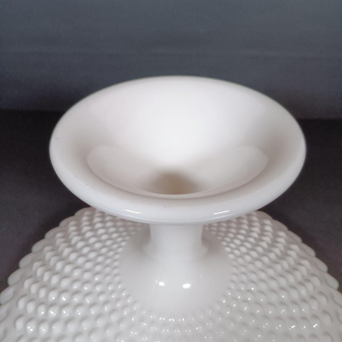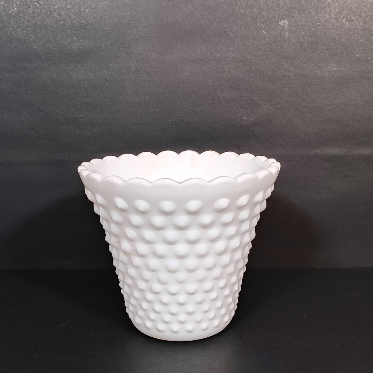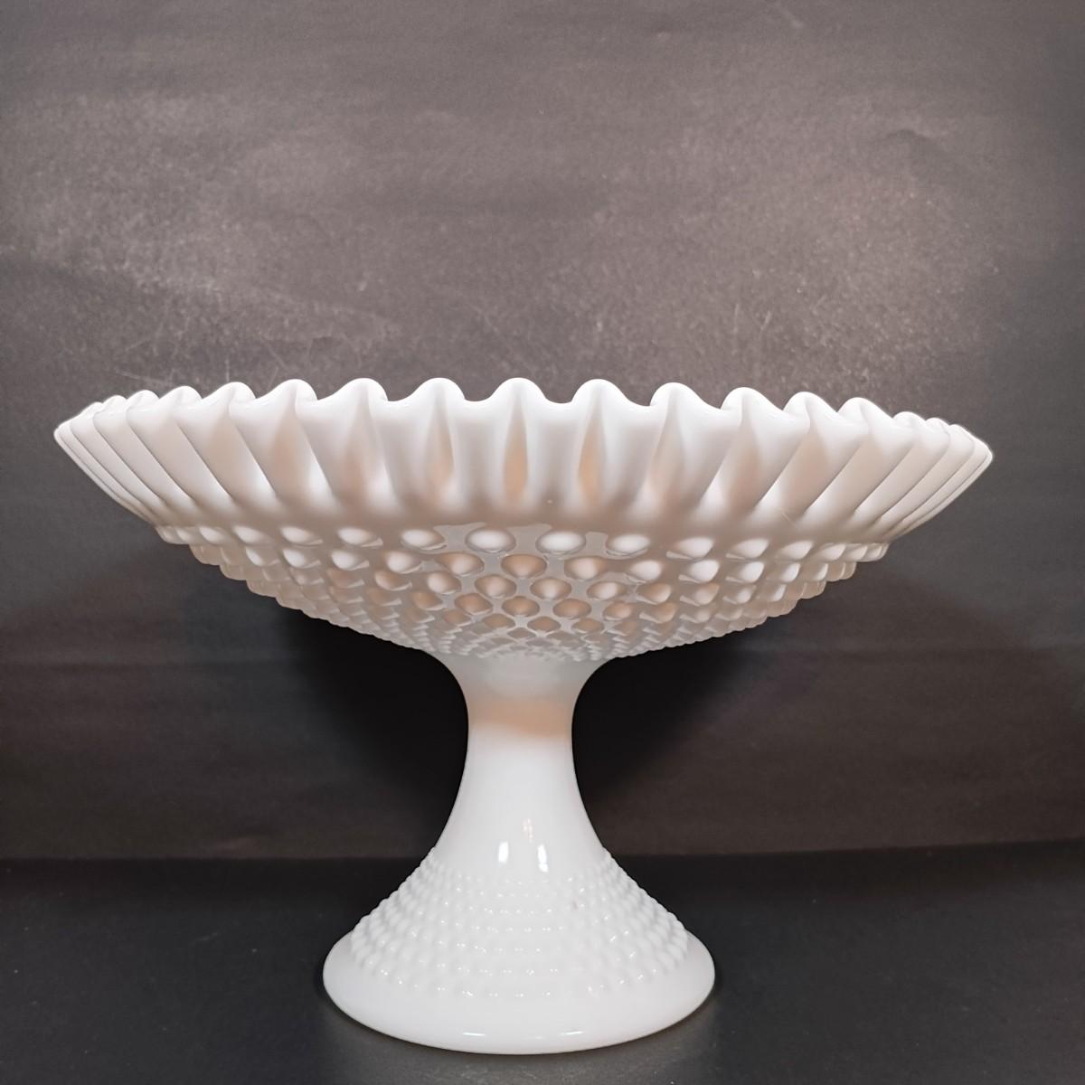 LOT 24: Vintage Milk Glass- Marked Fenton Hobnail Salt and Pepper Shakers and Unmarked Fenton Hobnail Pedestal Fruit Bowl, Candlestick Holders & Planter/Cachepot