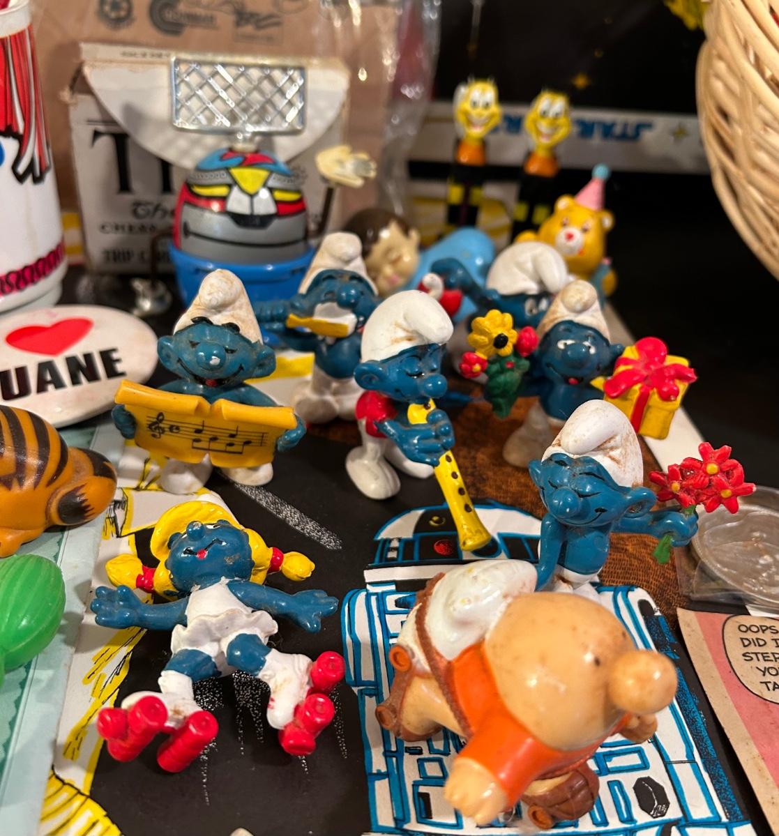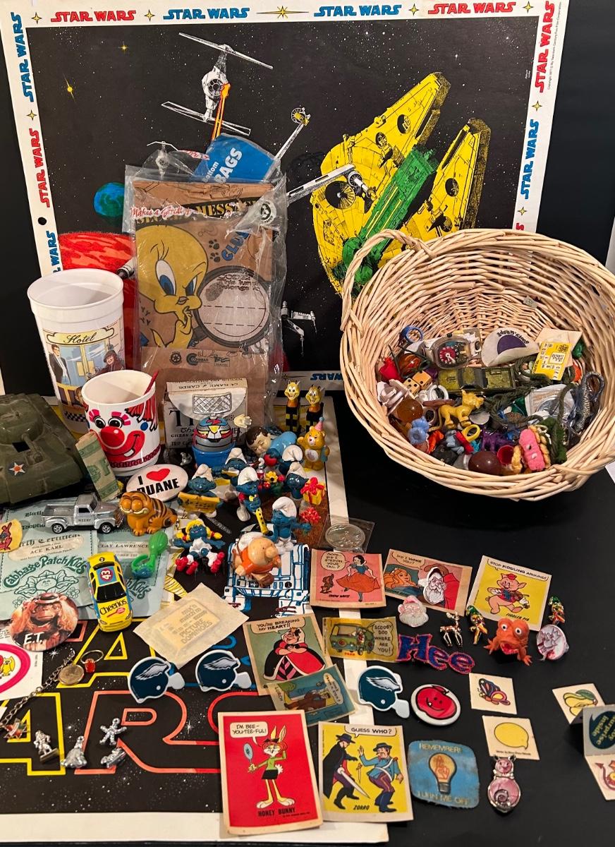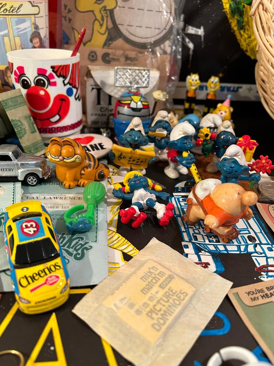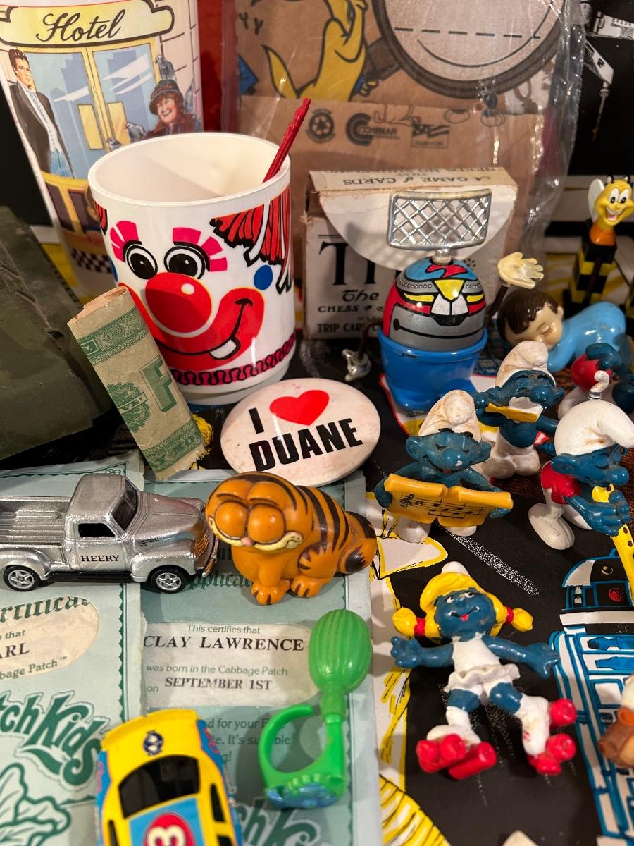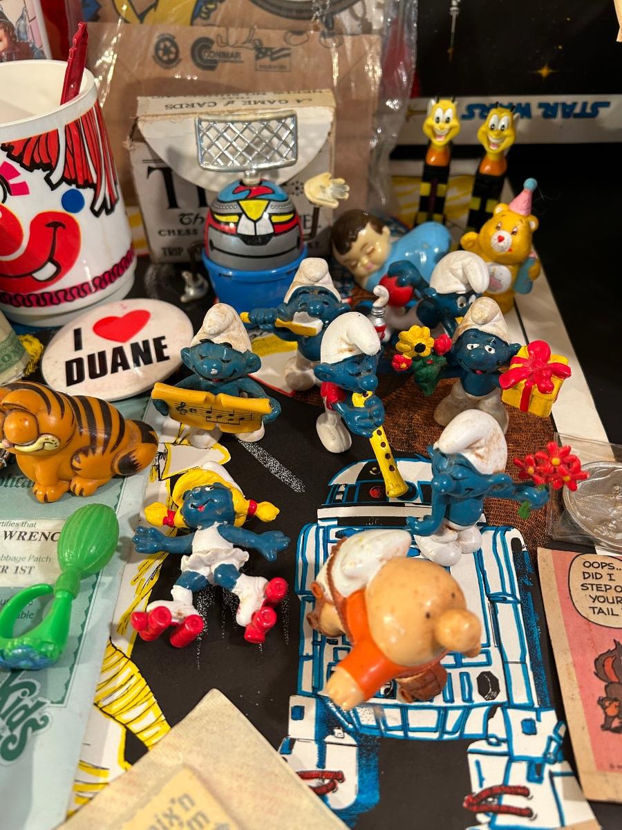 LOT 53: Vintage Cracker Jaxx Toys, 80"s Toys, Cups, Pins, Smurfs, Garfield and more