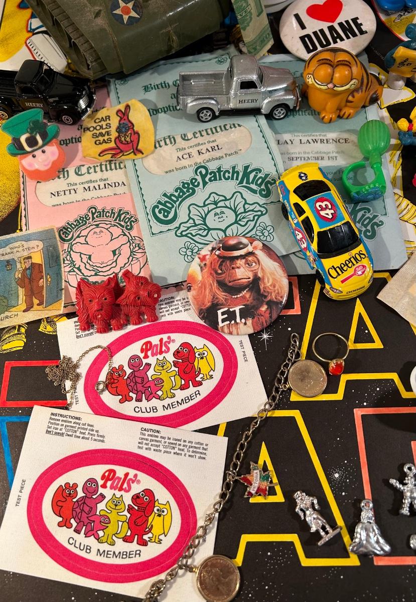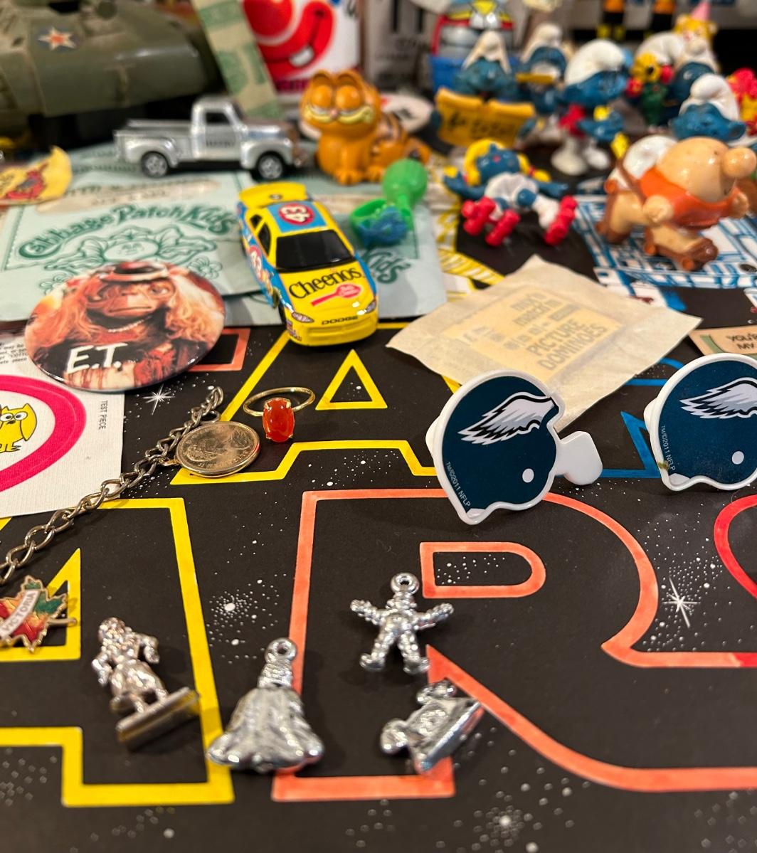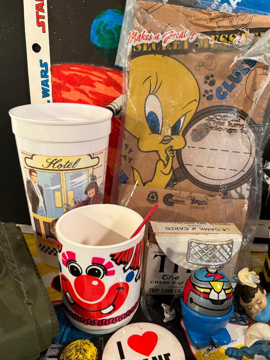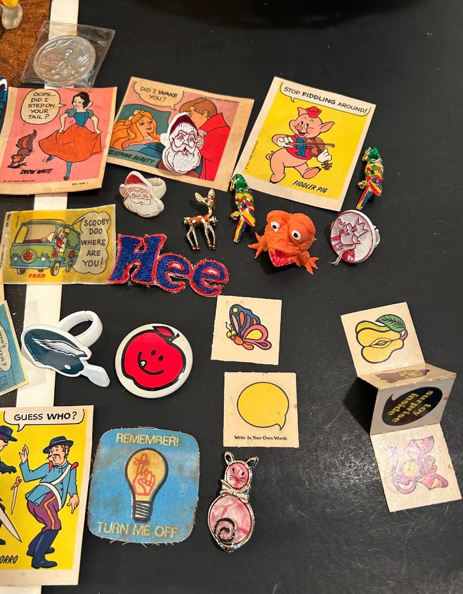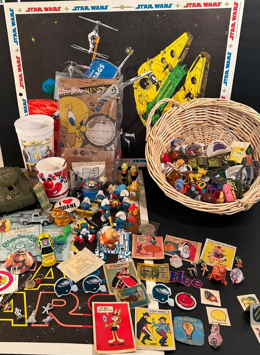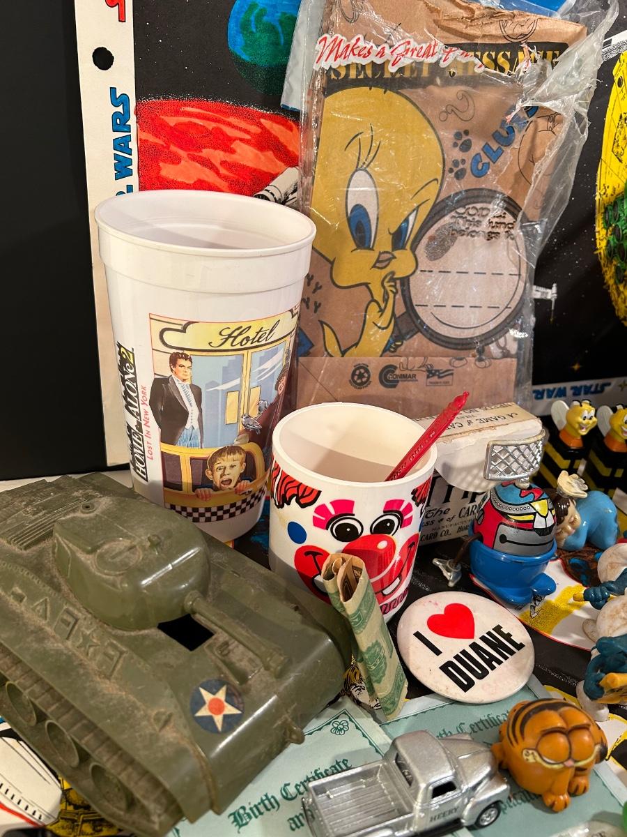 LOT 53: Vintage Cracker Jaxx Toys, 80"s Toys, Cups, Pins, Smurfs, Garfield and more