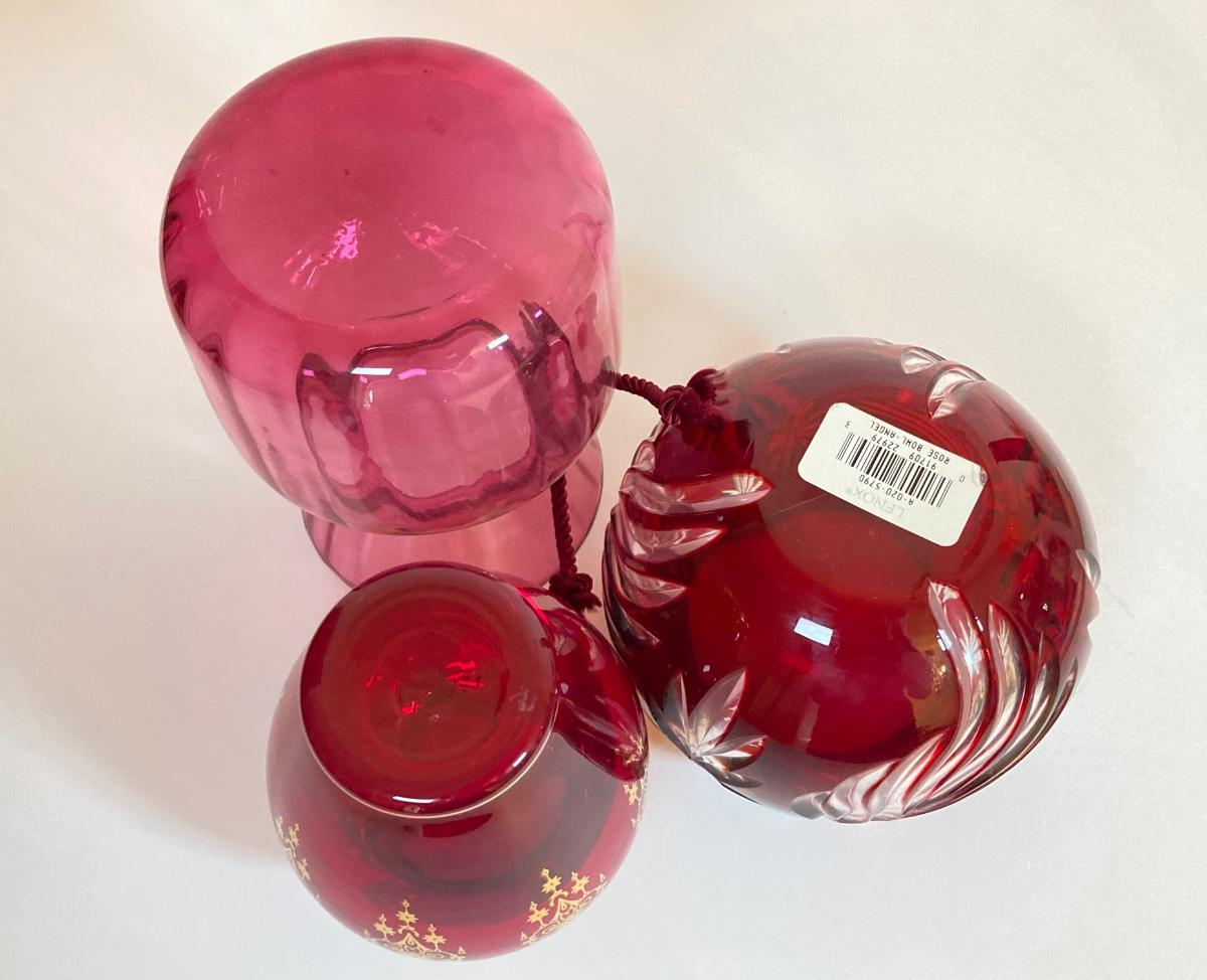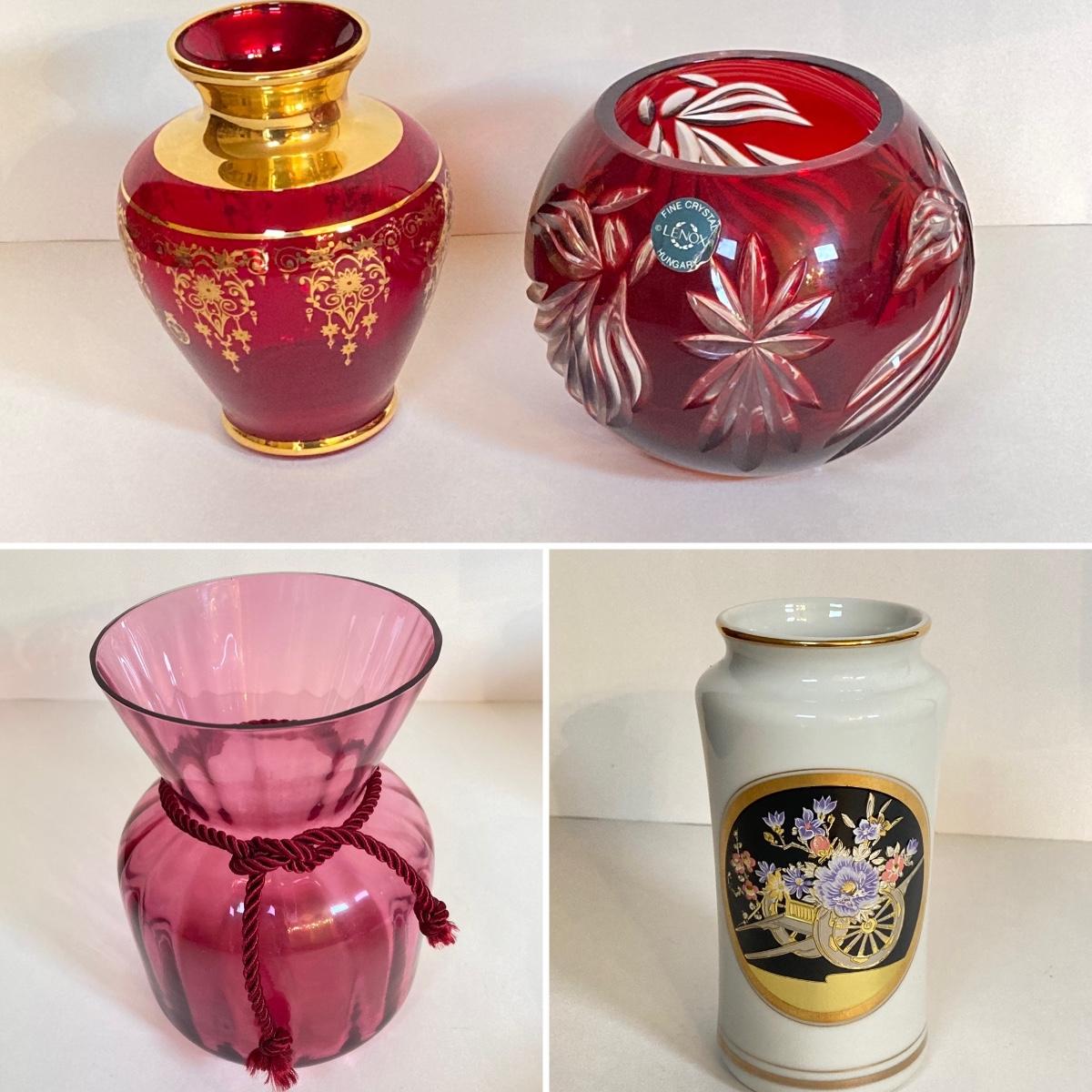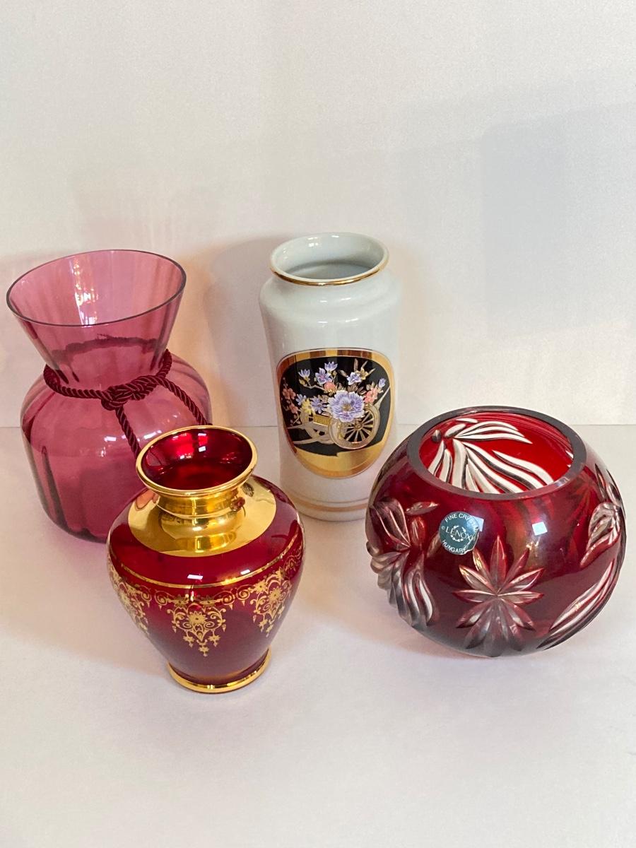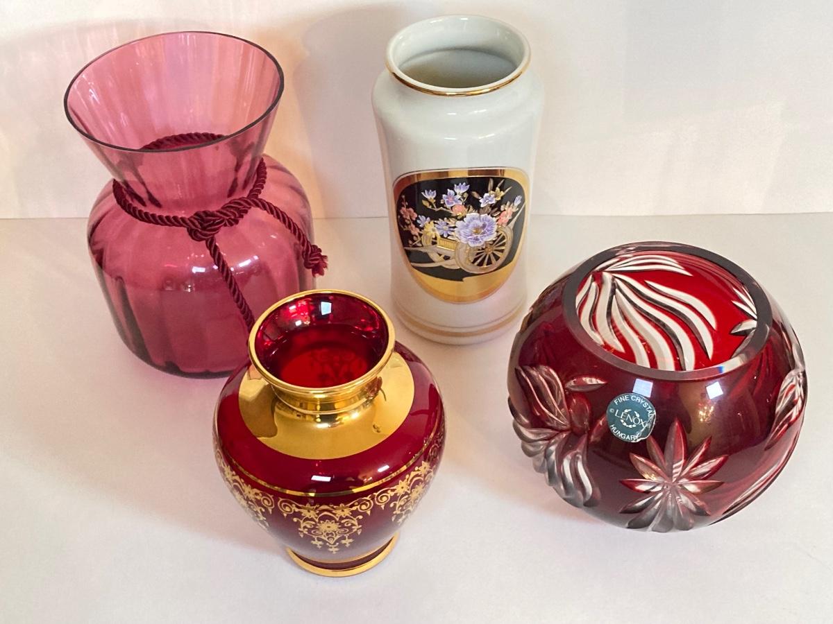 LOT 63D: Stunning Vetreria d’Arte Murano Glass Red with 24k Gold Vase, Lenox Crystal Angel Candle holder, Pilgrim Cranberry Glass Vase & Art of Chokin Japanese Porcelain Vase