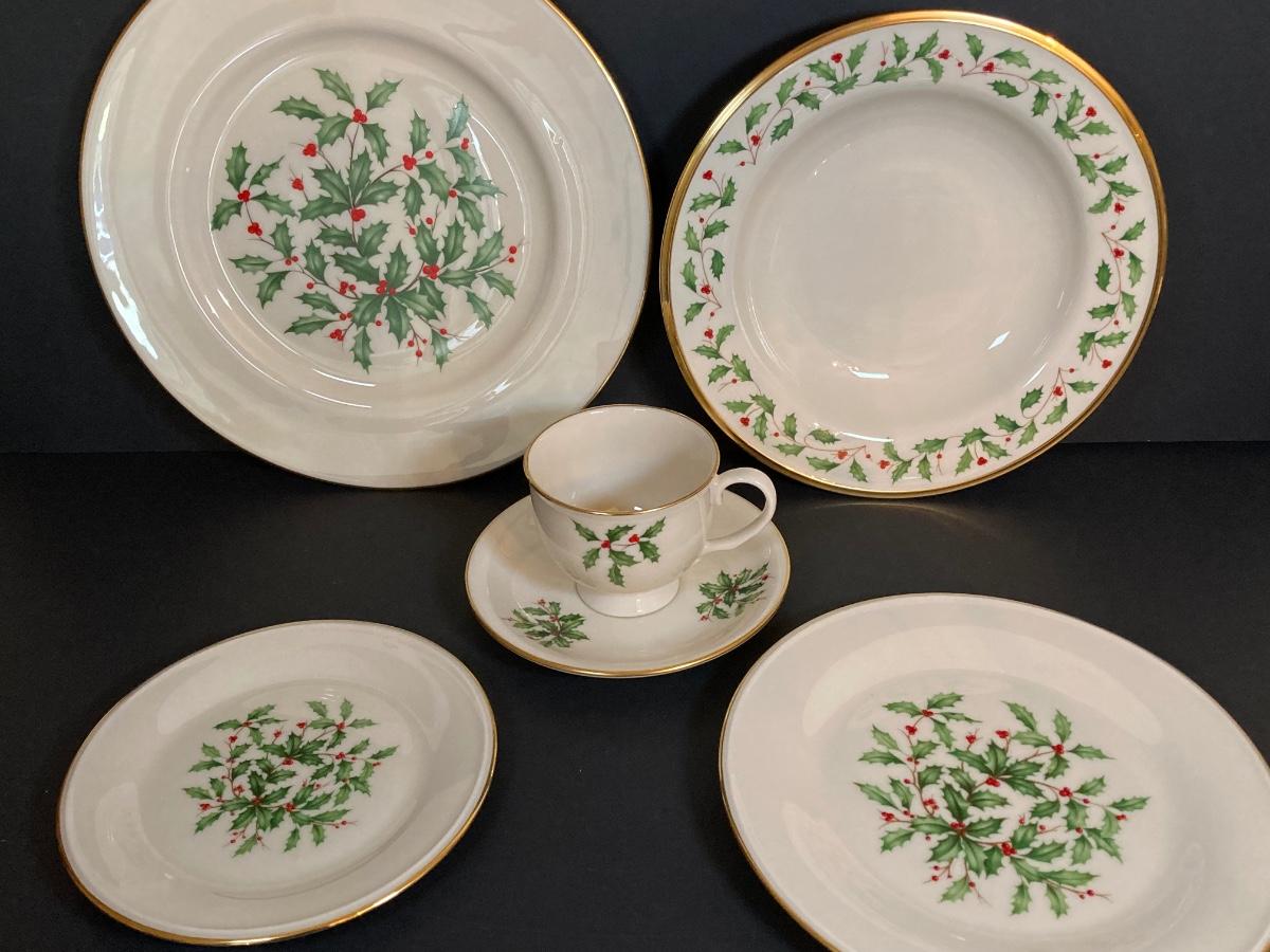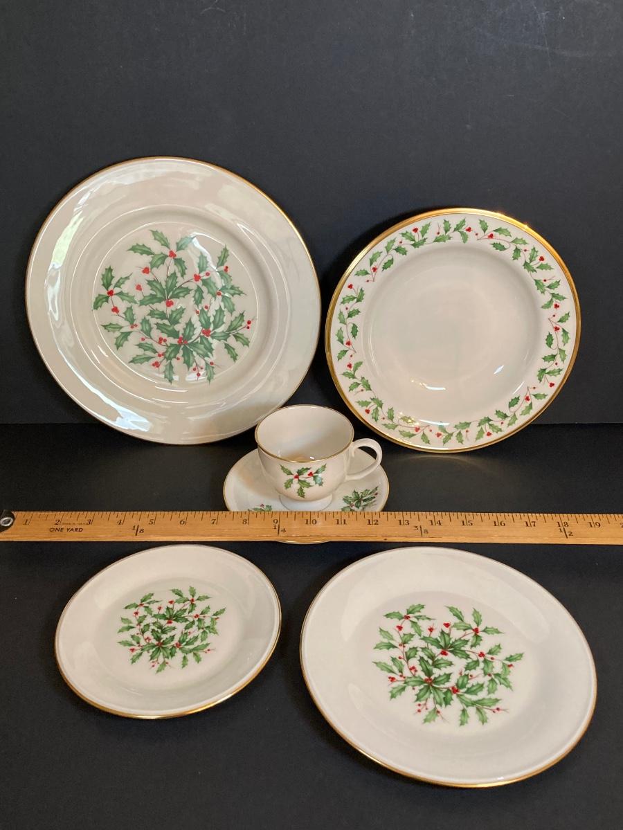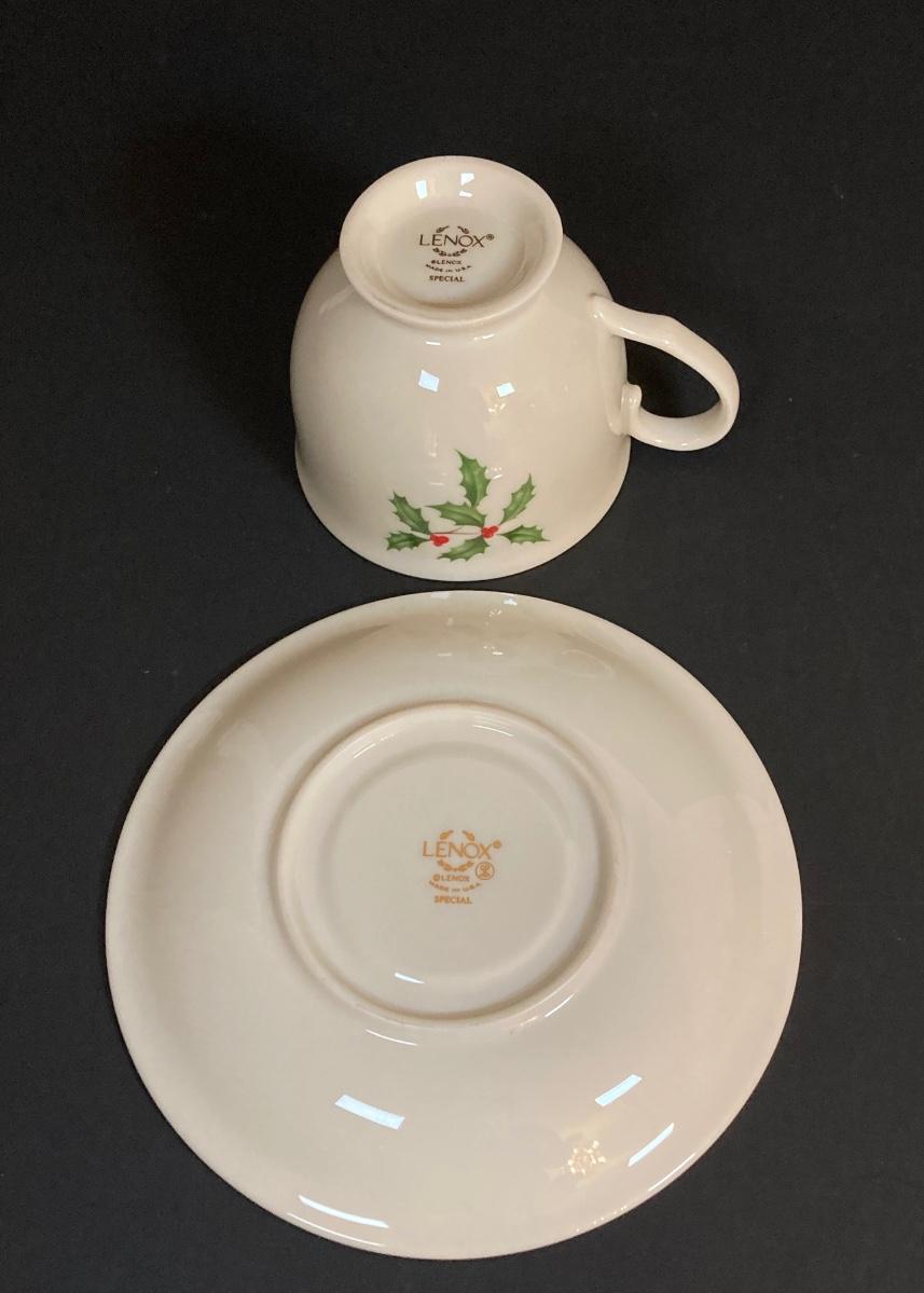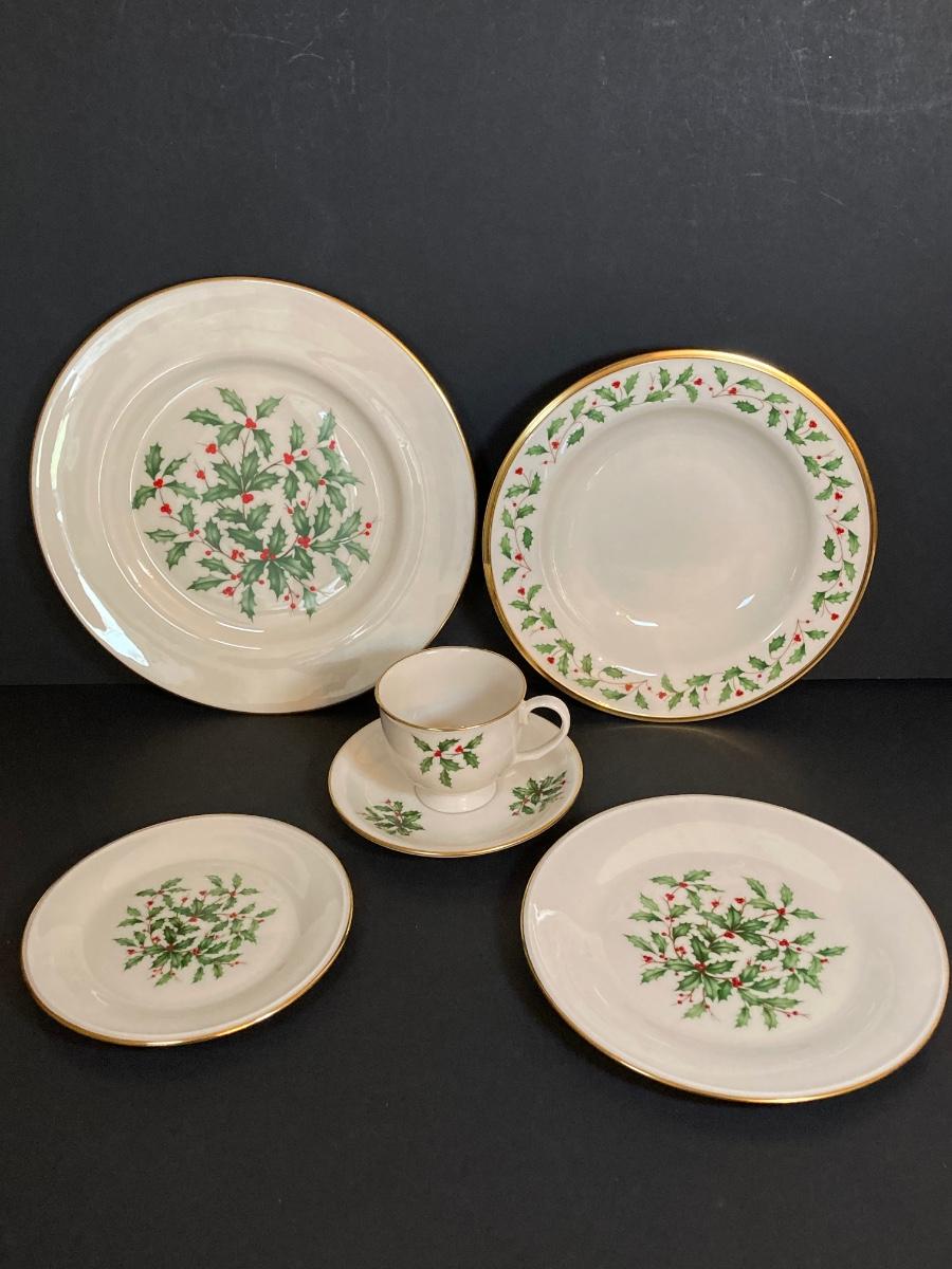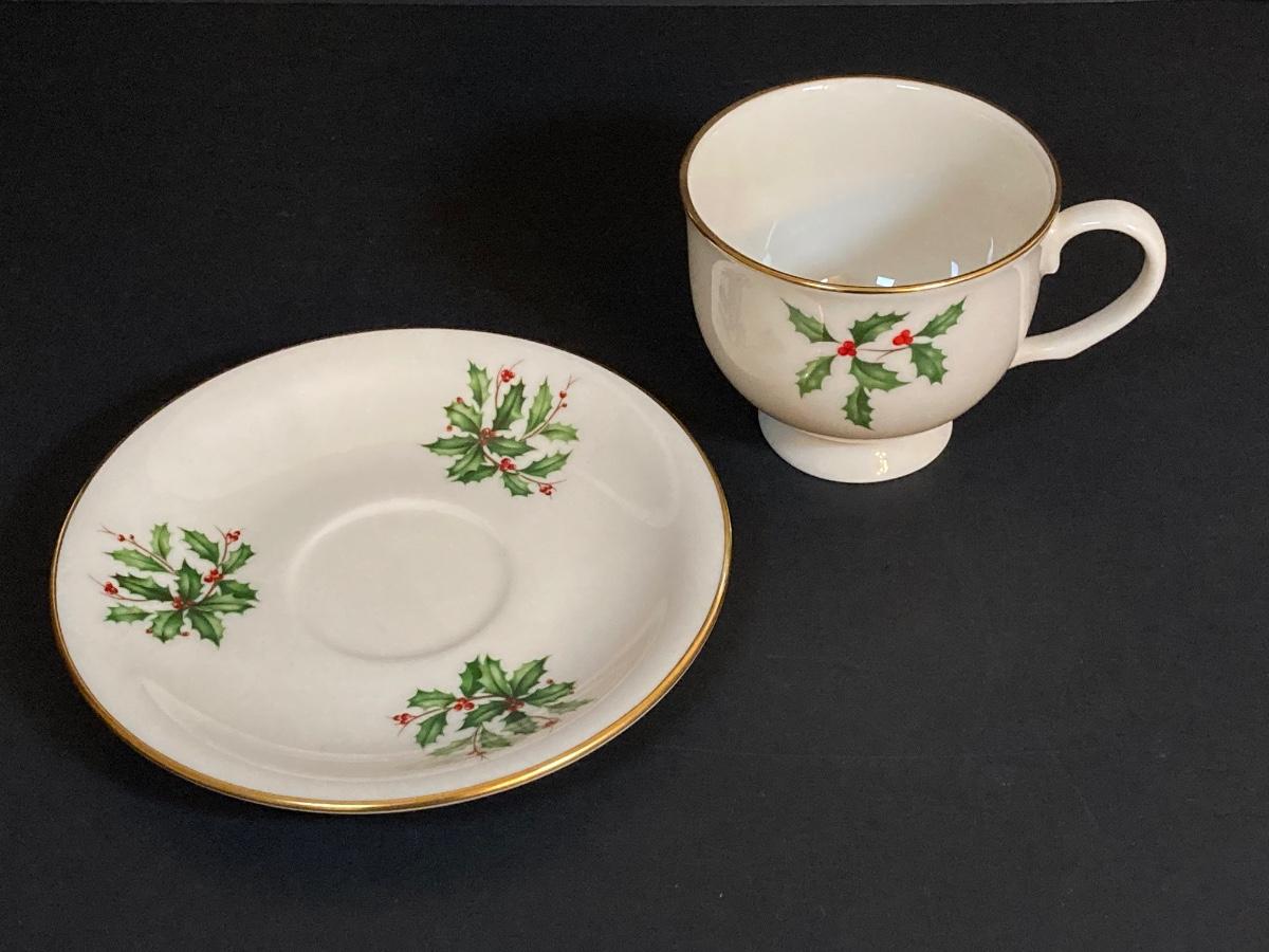 LOT 64D: Lenox Holiday Dinnerware - Holly Cups and Saucers, Dinner Plates, Bowls and Dessert / Salad Plates